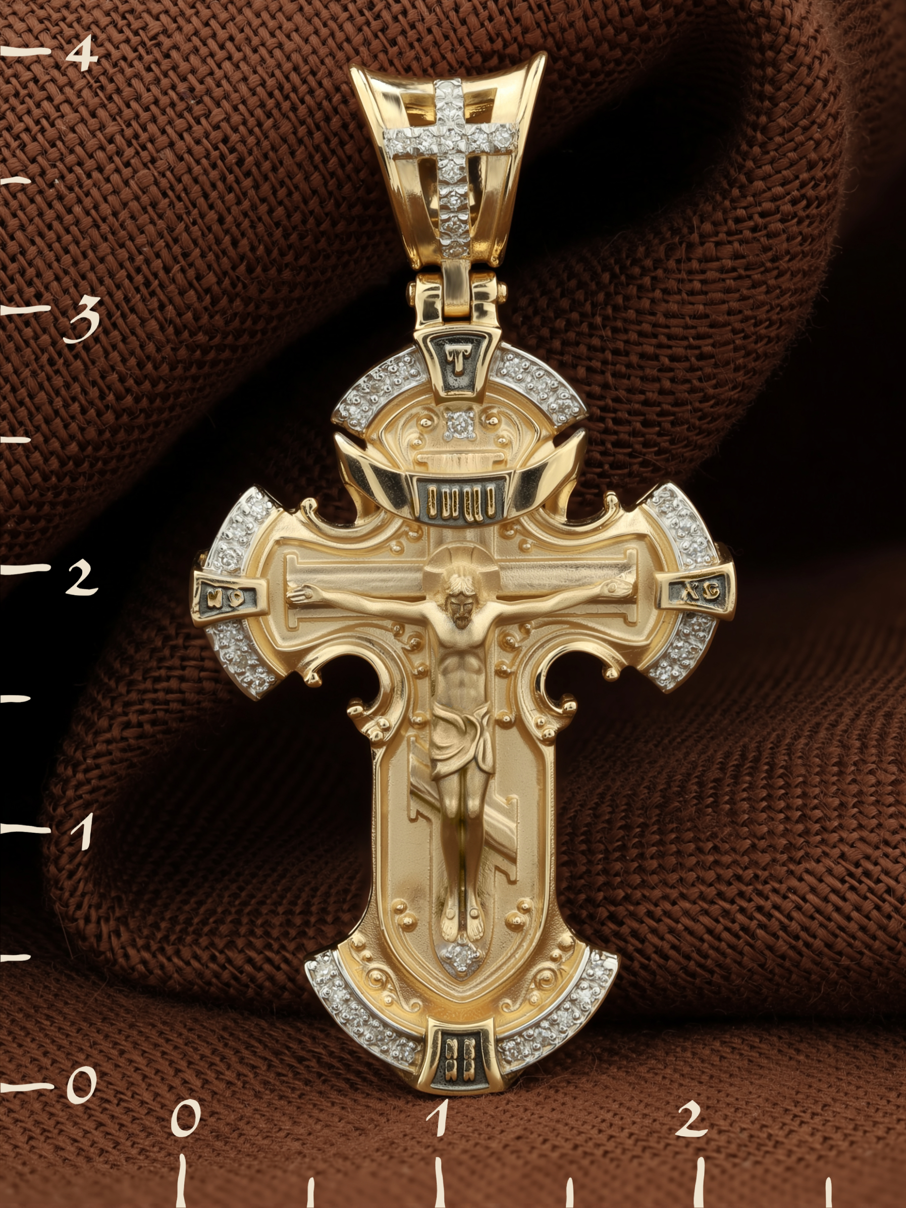 На лицевой стороне креста изображено Распятие Иисуса Христа на Голгофском Кресте, верхняя перекладина которого символизирует титло — табличку, на которой, согласно Евангелию, было начертано: Иисус Назорей Царь Иудейский (IНЦI). Справа и слева от Распятия изображены символы «IС ХС» — святое имя Христа. Внизу креста написано слово «НИКА», что значит «победитель». В верхней части креста обозначена буква «Т», которая символизирует одно из орудий страданий Господа — трость.