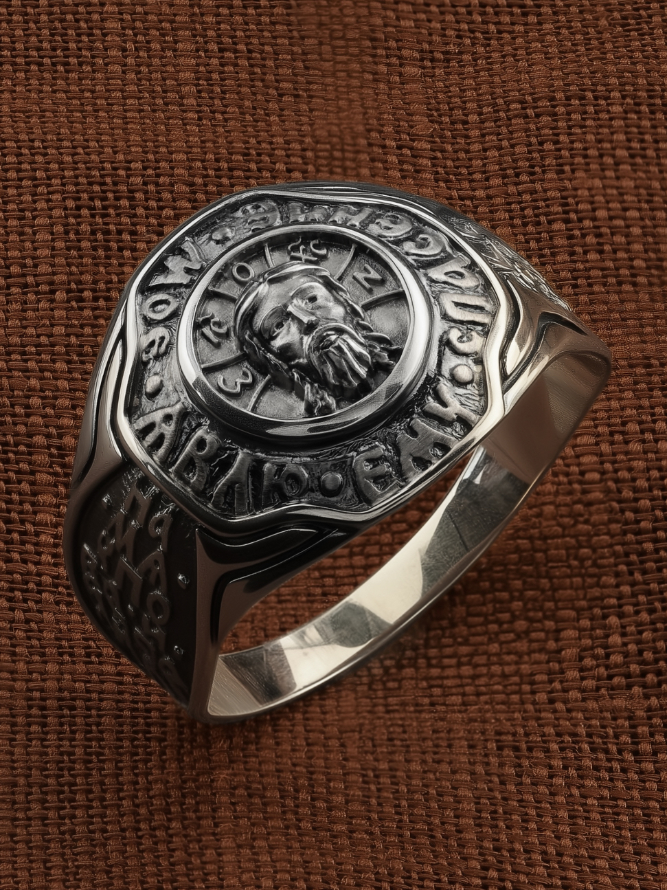 Кольцо «Господь Вседержитель» выполнено в древних христианских традициях. Спас Нерукотворный — образ Господа и Спасителя нашего Иисуса Христа, чудесно отпечатавшийся на плате, котором Христос вытер свой лик. Согласно Преданию, изложенному в Четьи Минее, Авгарь V Ухама, больной проказой, послал ко Христу своего архивария Ханнана (Ананию) с письмо, в котором просил Христа прийти в Едессу и исцелить его. Ханнан же был художником, и Авгарь поручил ему, если Спаситель не сможет прийти, то написать хотя бы Его образ и принести ему. Видя, что Ханнан хочет сделать Его портрет, Христос потребовал воды, умылся, вытер Свой лик платом, и на этом плате отпечатался Его образ. Спаситель передал этот плат Ханнану с повелением отнести с ответным письмом пославшему его. Получив портрет, Авгарь исцелился от главного своего недуга, но лицо его оставалось еще поврежденным. После Пятидесятницы в Едессу пошёл святой апостол Фаддей, один из 70-ти, закончил исцеление Авгаря и обратил его в христианство. Авгарь прикрепил образ к доске и поместил в нише над городскими воротами, убрав оттуда находившегося там идола. Лик Спасителя — в трехчастно разделенном нимбе, на котором начертана греческая монограмма «WOИ», что означает «Сущий» или «Тот, кто есть». Вокруг образа Спаса Нерукотворного надпись: «Явлю ему спасение Моё»