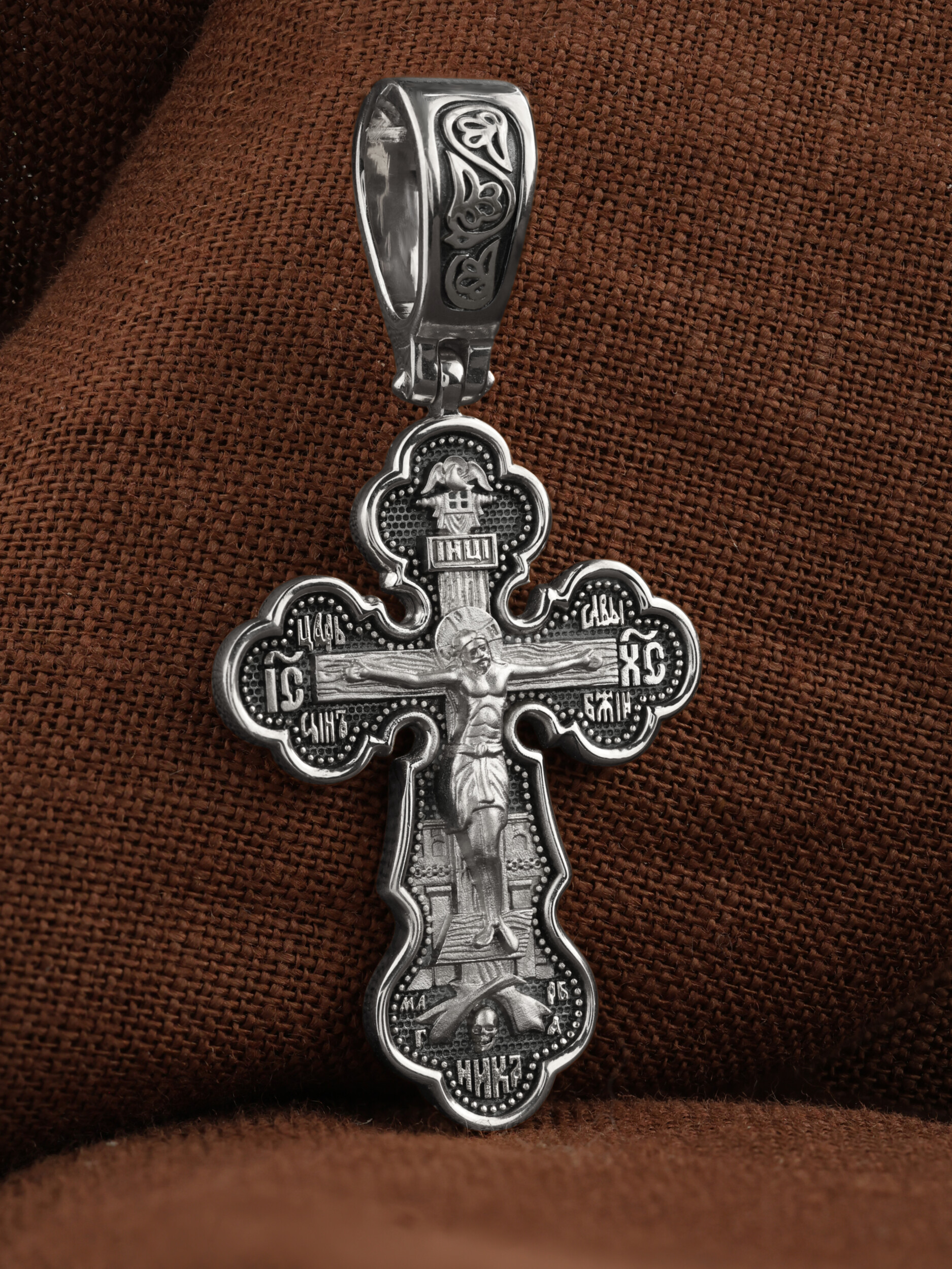 На лицевой стороне креста изображено Распятие Господа и Спасителя нашего Иисуса Христа. Христос, подвергнутый на кресте мучительной казни, своими страданиями искупил нас от древнего греха и даровал нам жизнь вечную. На верхней табличке, выше головы Иисуса, расположена надпись, составленная Понтием Пилатом — «IНЦI». Она означает «Иисус Назорей, Царь Иудейский». Распятие сопровождается каноническими надписями. Надпись «IС ХС» означает Иисус Христос, надпись «Царь Славы» и словосочетание «СЫН БОЖИЙ», что означает божественную природу Иисуса Христа, помещаются на разных сторонах поперечной перекладины креста. В нижней части креста находятся надписи –«НИКА» и «МЛРБ». В переводе с греческого, слово «НИКА» означает «победитель». Именно оно является символом победы Христа над смертью. Надпись «МЛРБ» — «место лобное рай бысть» означает, что место лобное стало раем. Крест стоит на горе камней, символизирующих Голгофу. Под подножием Креста изображена покоящаяся голова (череп) Адама и надпись «Г.А.». Христос в Своей Божественной любви, над которой смерть не властна и которая, страдая, и не страдает в обычном смысле, простирает к людям со Креста Свои объятия, в которые призывается и привлекается весь мир. Поэтому Тело Его не висит, а торжественно покоится на Кресте.