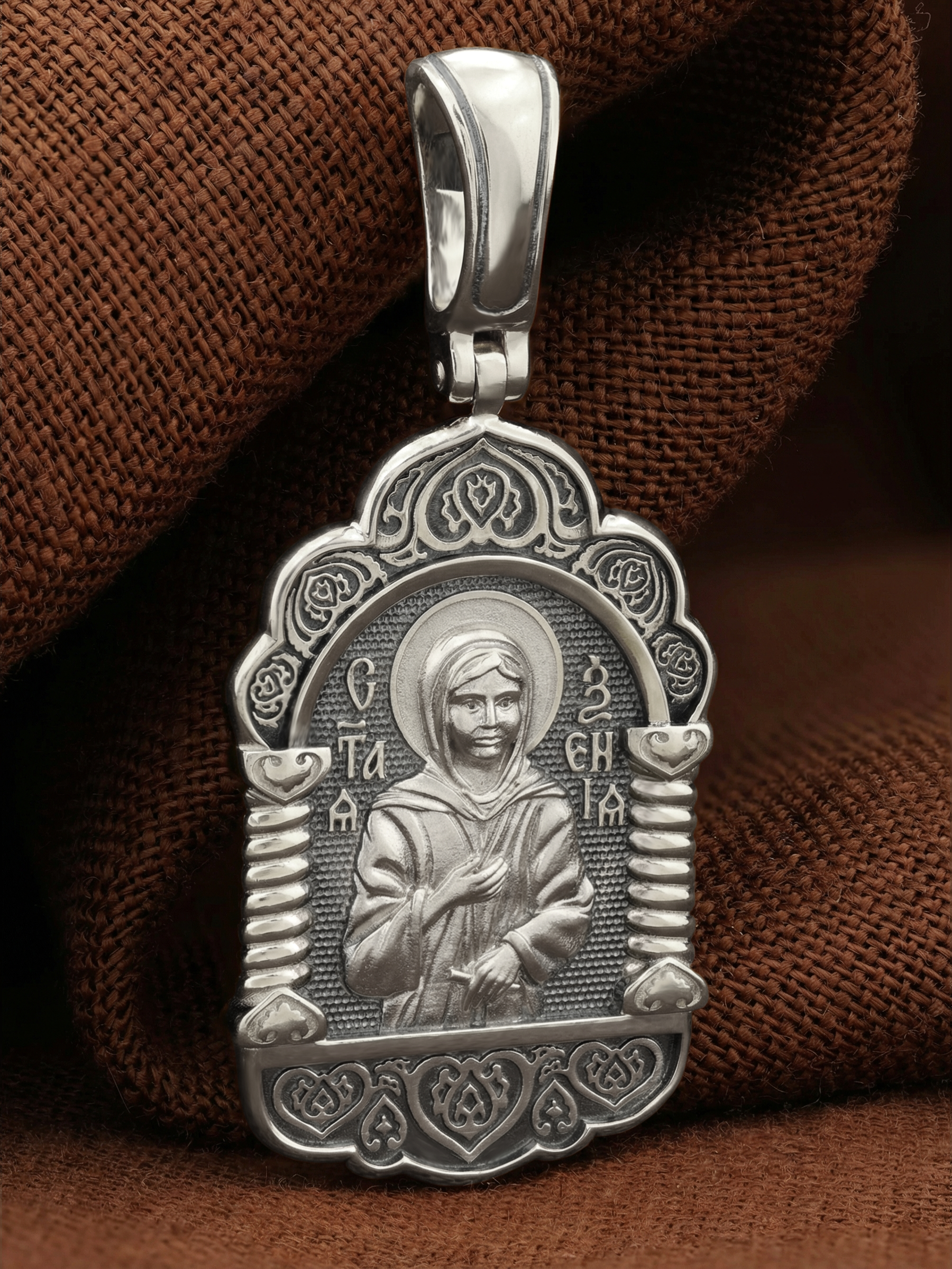 На лицевой стороне образка изображена Святая блаженная Ксения Петербургская, в миру Ксения Григорьевна Петрова.