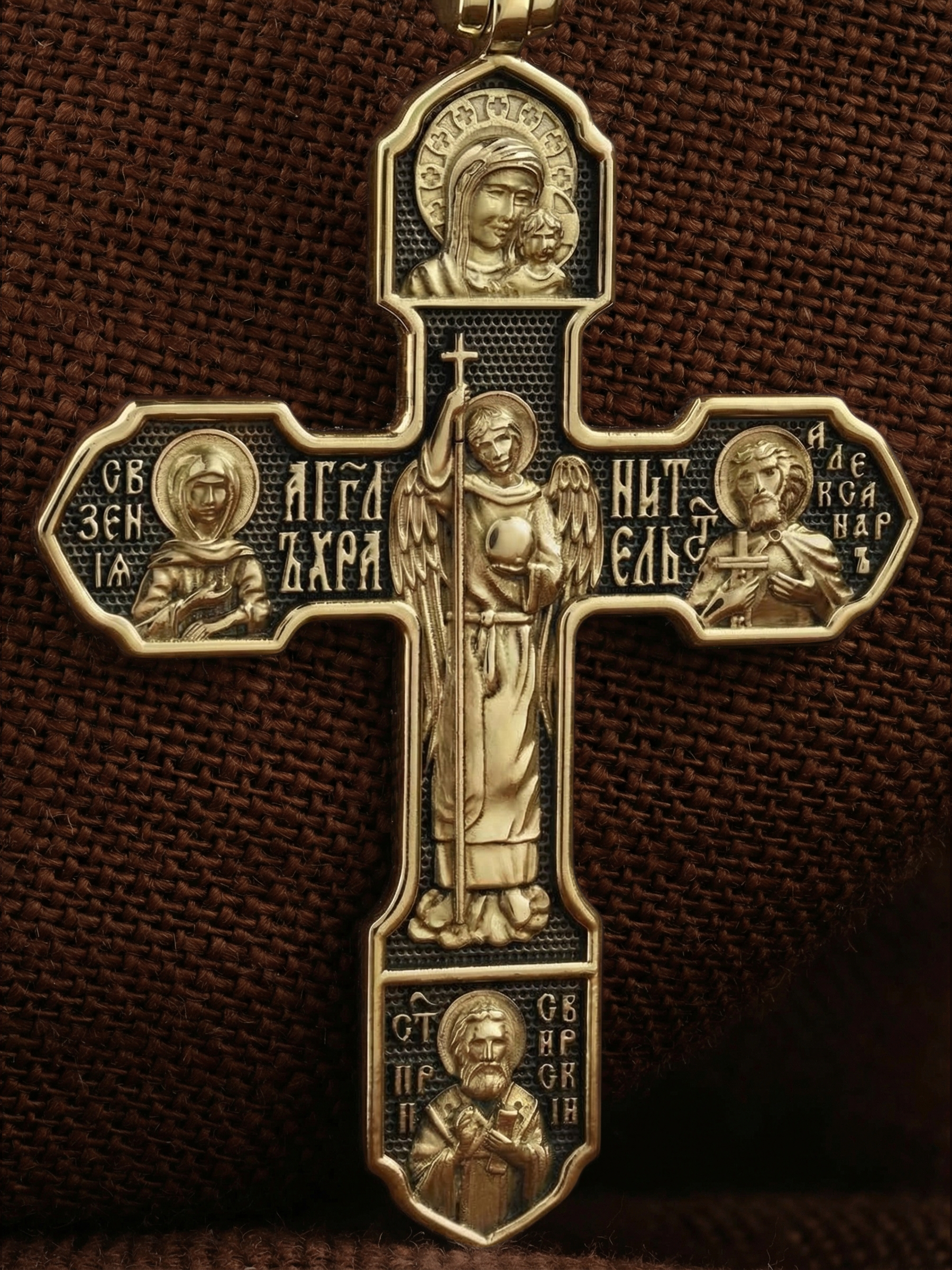 На лицевой стороне изображено Распятие Господа Иисуса Христа, над вершиной которого помещены титлы Его святого имени — «ИС ХС». Под основной перекладиной надписи — «НИКА», что в переводе с греческого означает «победитель», и словосочетание «СЫН БОЖИЙ», что означает божественную природу Иисуса Христа. С двух сторон Христу предстоят Пресвятая Богородица и св. Андрей Первозванный. Внизу — образ Архангела Михаила, могучего защитника от злых сил. Это он низверг дьявола и встал во главе ангелов для борьбы с бесовскими силами. Его имя означает «Кто яко Бог?».