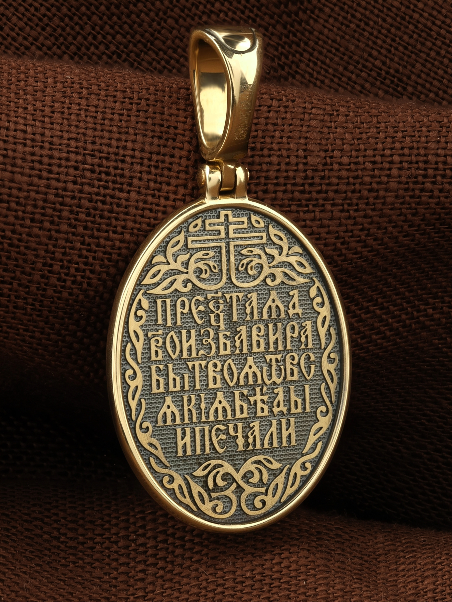 На лицевой стороне образка изображена икона Пресвятой Богородицы «Семистрельная» — одна из самых чудотворных икон на Руси. На протяжении многих веков христиане взывали к Царице Небесной через эту икону, если в стране начинались войны или мятежи.