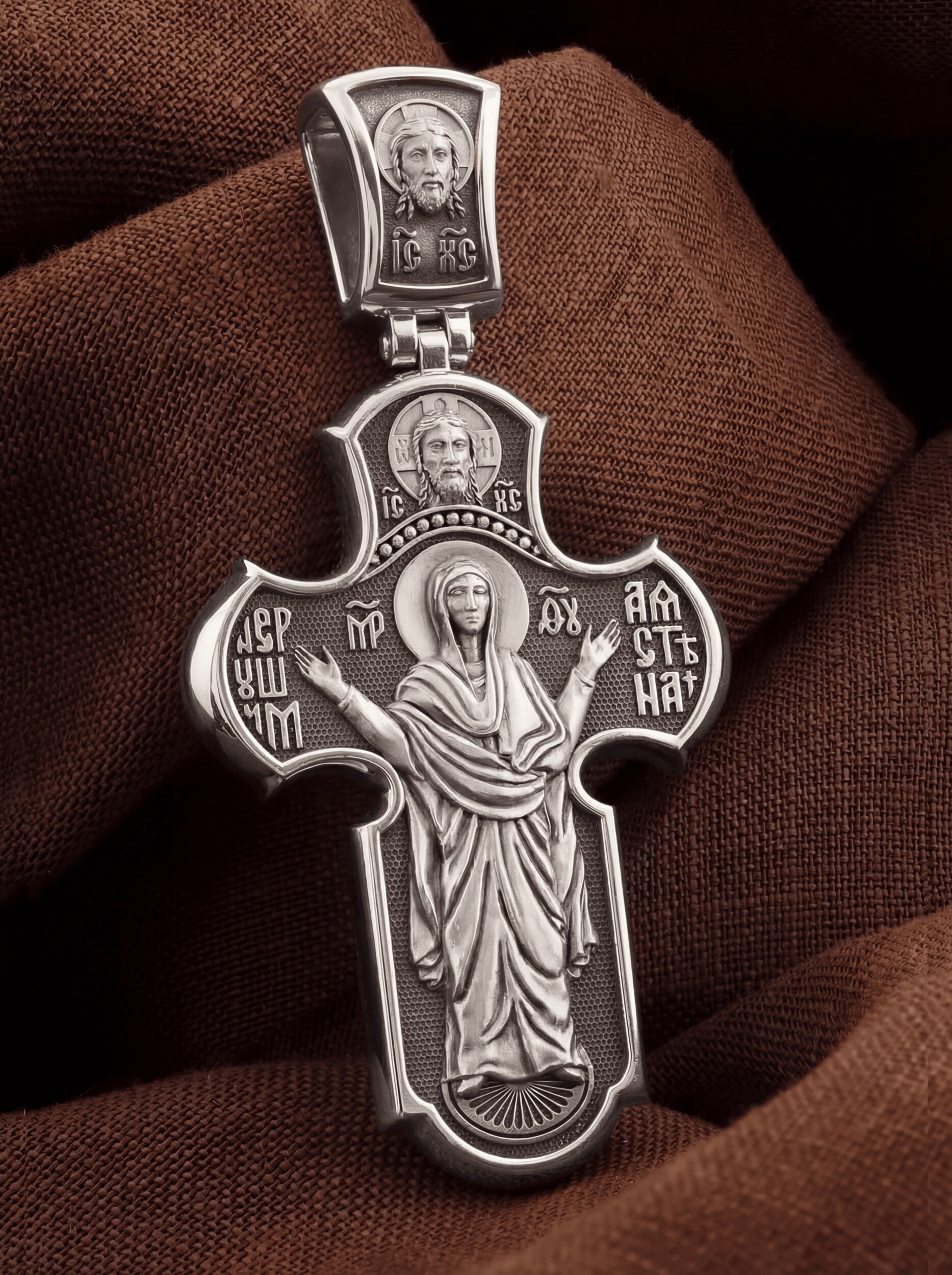 На обороте креста изображена одна из самых древних и почитаемых святынь — икона Божией Матери «Нерушимая Стена». Это величественное изображение, представляющее Божью Матерь в позе Оранта, с воздетыми в молении руками. Особенно почитается эта икона как помощница в тяжелых жизненных ситуациях, как защитница от врагов и спасительница в смертельной опасности. Над образом Божией Матери помещено изображение Спаса Нерукотворного — образ Спасителя, который Он запечатлел на плате и передал для исцеления больному проказой царю Эдессы. Ему придается победное и защитное значение.