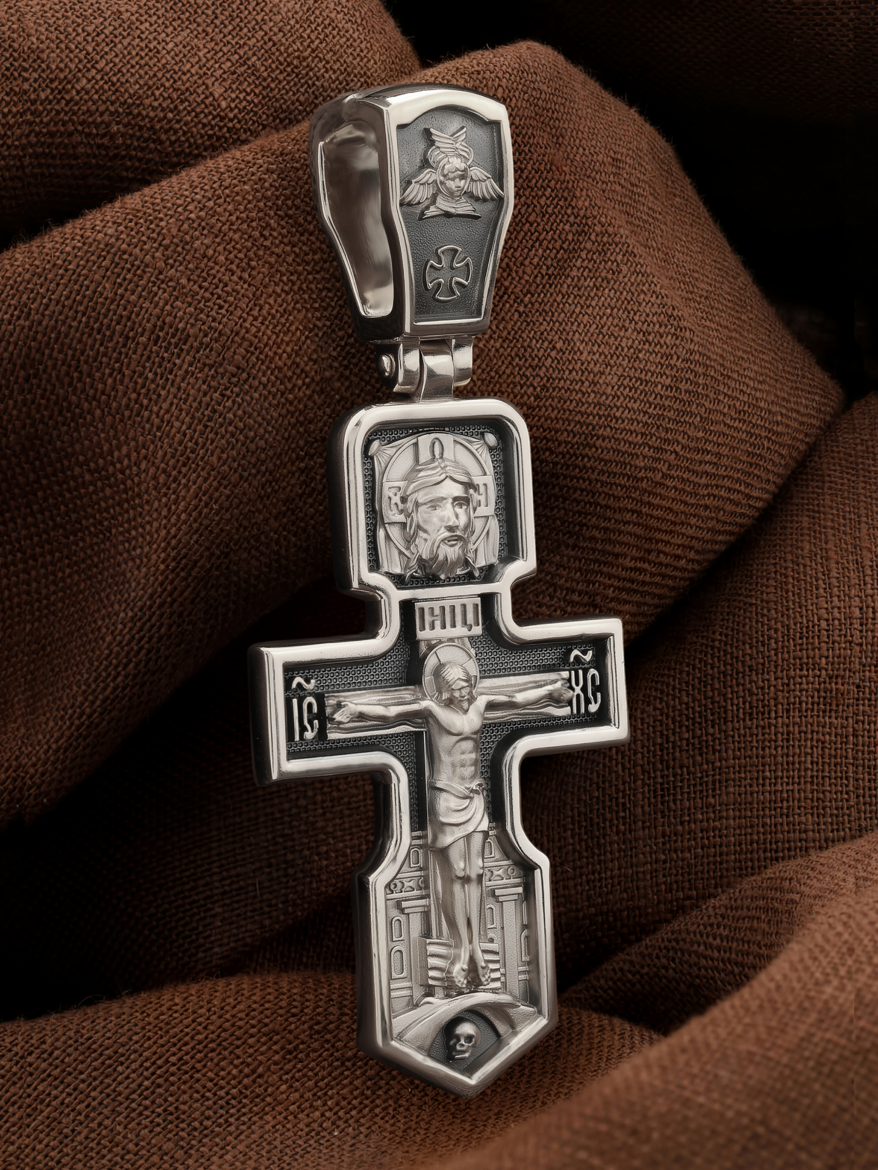 Основной композицией лицевой стороны является Распятие Господа Иисуса Христа. Позади Распятия видна иерусалимская стена, знак того, что Господь был распят вне стен города. Но вместе с тем стена символизирует и Небесный Иерусалим, путь который открылся для человека через Голгофу. У подножья Господа в виде скалистой горки видна сама Голгофа с Главой Адамовой в пещере. Распятие сопровождается каноническими надписями. Это святое имя Христа, которое принято писать на иконах сокращенно — «ИС ХС», словосочетание «СЫН БОЖИЙ», что означает божественную природу Иисуса Христа, и надпись «НИКА» — «победитель». Над Распятием помещено изображение Спаса Нерукотворного — образ Спасителя, который Он запечатлел на плате и передал для исцеления больному проказой царю Эдессы.