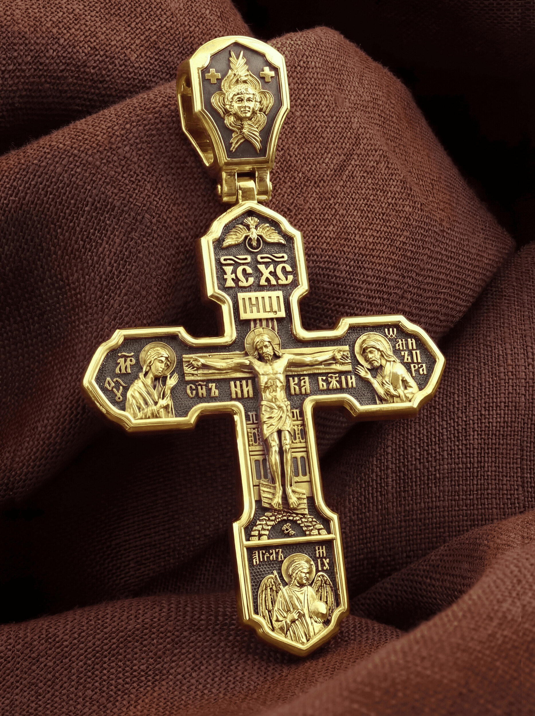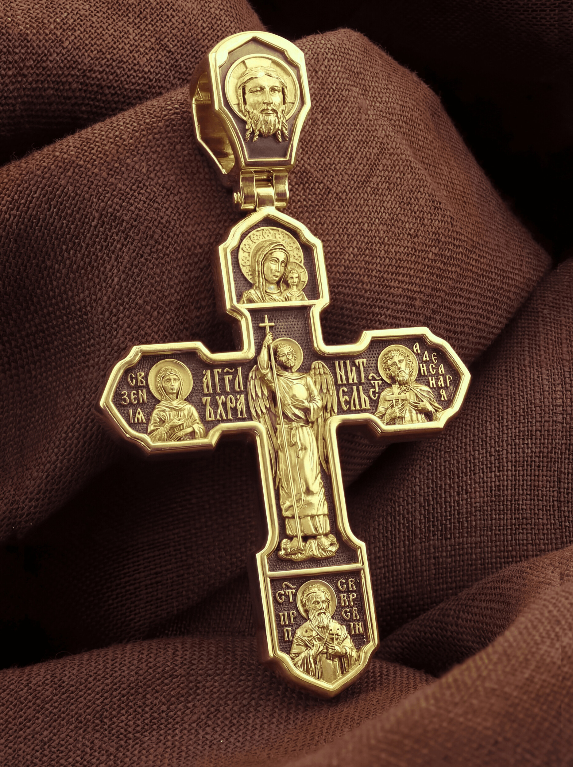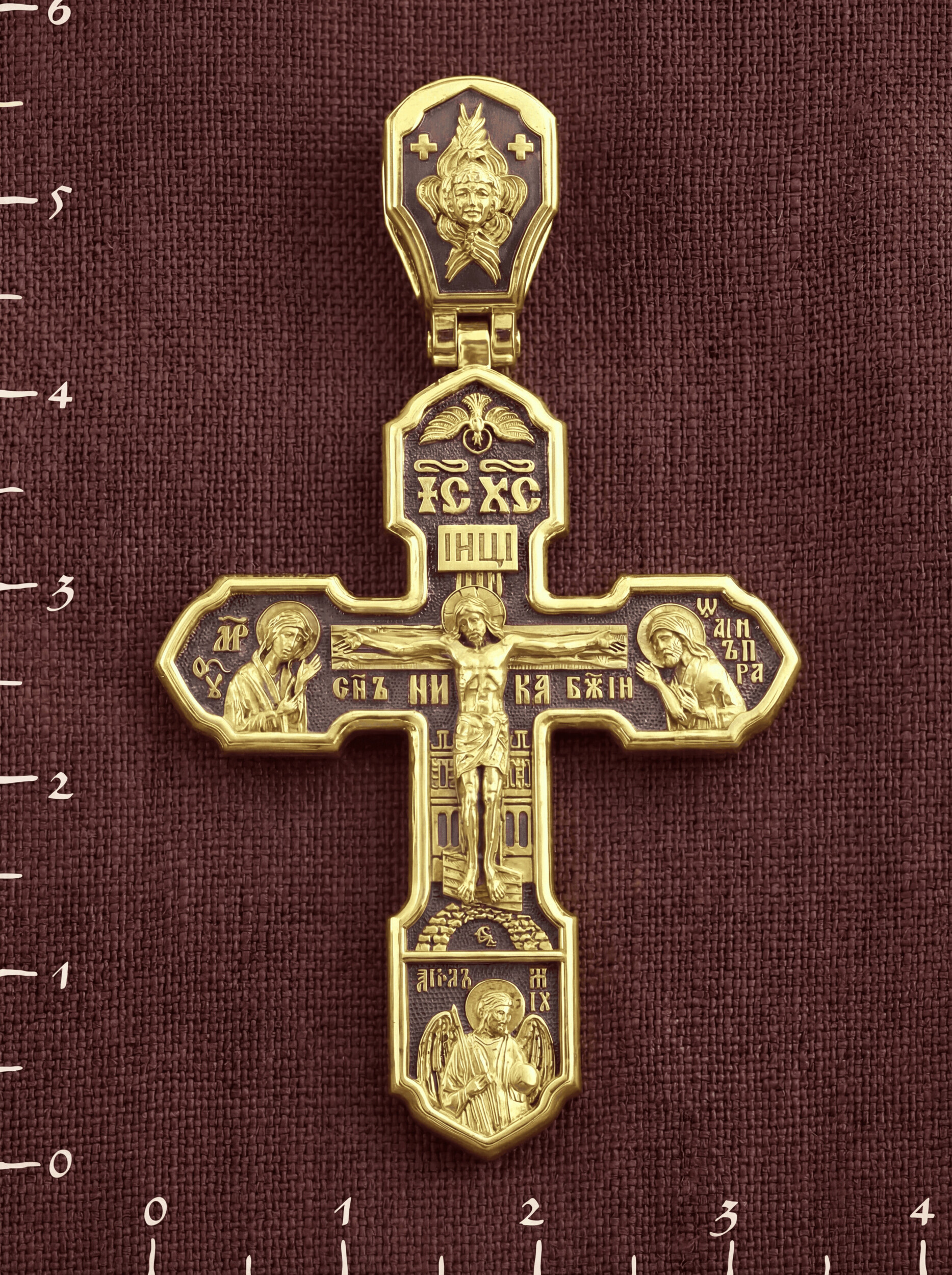На лицевой стороне изображено Распятие Господа Иисуса Христа, над вершиной которого помещены титлы Его святого имени — «ИС ХС». Под основной перекладиной надписи — «НИКА», что в переводе с греческого означает «победитель», и словосочетание «СЫН БОЖИЙ», что означает божественную природу Иисуса Христа. С двух сторон Христу предстоят Пресвятая Богородица и св. Андрей Первозванный. Внизу — образ Архангела Михаила, могучего защитника от злых сил. Это он низверг дьявола и встал во главе ангелов для борьбы с бесовскими силами. Его имя означает «Кто яко Бог?».