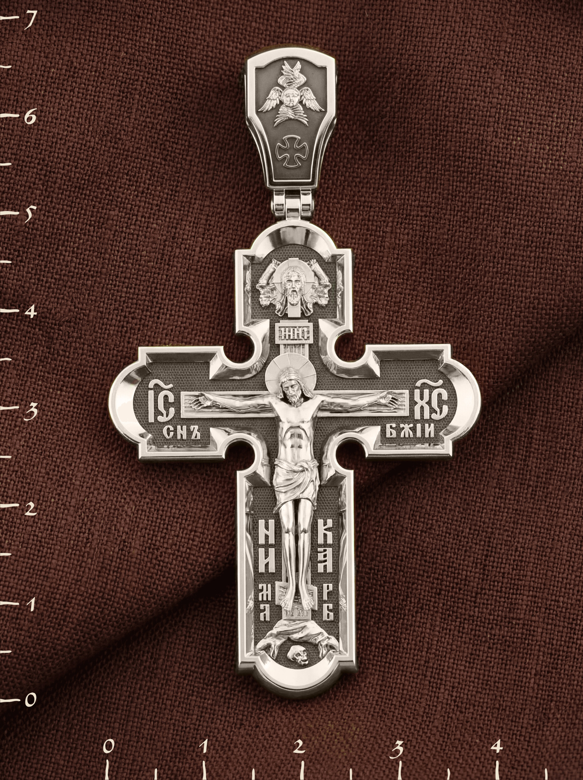 На лицевой стороне нательного креста по традиции изображено Распятие Господа нашего Иисуса Христа. Крест Господень стоит на небольшом каменистом возвышении, символизирующем гору Голгофу, которая обозначена буквами МЛРБ (Место Лобное Рай Бысть). Над головой Господа на поперечной перекладине написано «ИНЦИ», что символизирует табличку, которая была прибита к Кресту, с надписью «Иисус Назорей Царь Иудейский». Этим иудеи хотели посмеяться над Христом, не зная, что распинают истинного Царя всех царей. По сторонам основной перекладины расположены позолоченные рельефные инициалы Христа «ИС ХС». Под перекладиной, по сторонам древа, находится надпись «СЫН БОЖИЙ», а в основании креста — надпись «НИКА» (Победитель).