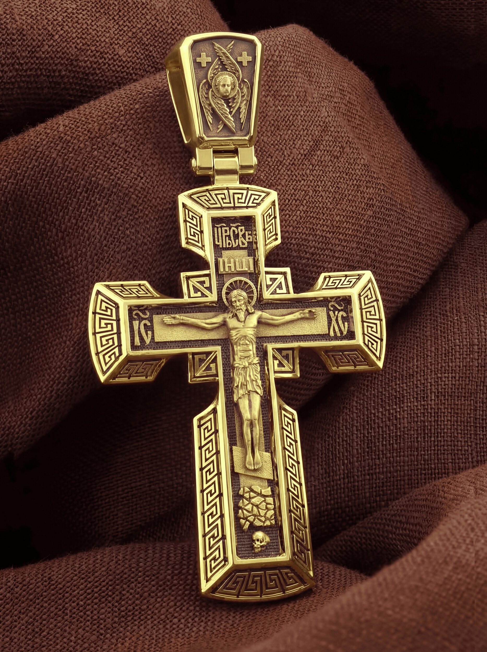На его лицевой стороне изображено Распятие Господне на восьмиконечном Голгофском кресте. Над головой Спасителя на поперечной перекладине помещена надпись «IНЦI», которая является сокращенным выражением титла, установленного на Кресте Понтием Пилатом: «Иисус Назорей Царь Иудейский». На боковых оконечностях креста вписаны инициалы святого имени Христа «IС ХС». В верхней оконечности креста имеется монограмма «Царь Славы», которая гласит о том, что Христос — Великий Архиерей, Царь и Жертвенный Агнец, искупивший грехи мира. У подножия креста в виде каменистого пригорка изображена гора Голгофа с Главой Адамовой в пещере.
