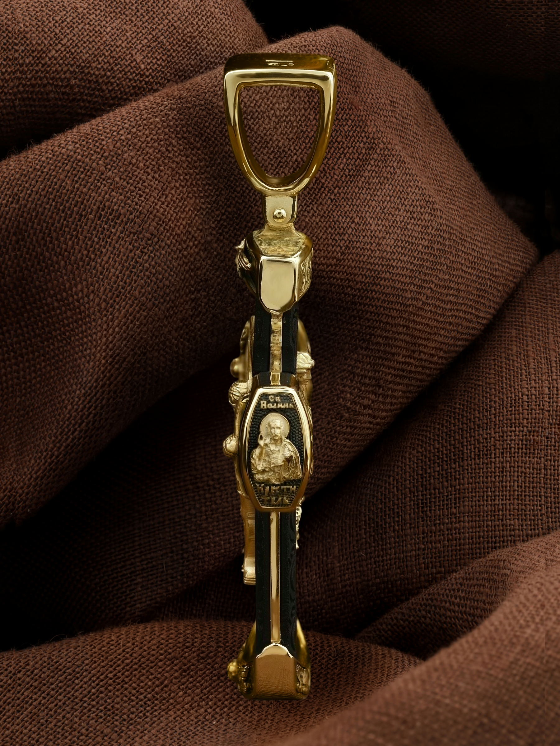 На торце изделия с левой стороны помещена икона Святого Николая Чудотворца — самый почитаемый в Православной Церкви, которого еще называют Николай Угодник за то, что он угодил своей жизнью Богу. Николай Чудотворец, помощник в делах, покровитель учащихся, утешитель обиженных и нуждающихся, целитель самых страшных и тяжелых недугов, предстатель и молитвенник за людей перед Богом. Также Святитель Николай Чудотворец известен своими молитвами за путешественников, когда непрестанный ветер и бушующие волны утихают и корабль заходит в спокойную гавань. На торце изделия с правой стороны — икона Святого Иоанна Крестителя. Святой Иоанн был последним пророком Израиля. Он призывал к покаянию, предвозвещая приближение Царствия Небесного (Мф. 3, 2), и удостоился стать Крестителем Христа. Иисус Христос говорит о нем: «Сей есть о котором написано: «Вот, Я посылаю Ангела Моего пред лицем Твоим, который приготовит путь Твой пред Тобою» (Лк. 7, 27). И еще: «Из рожденных женами нет ни одного пророка больше Иоанна Крестителя» (Лк. 7, 28).