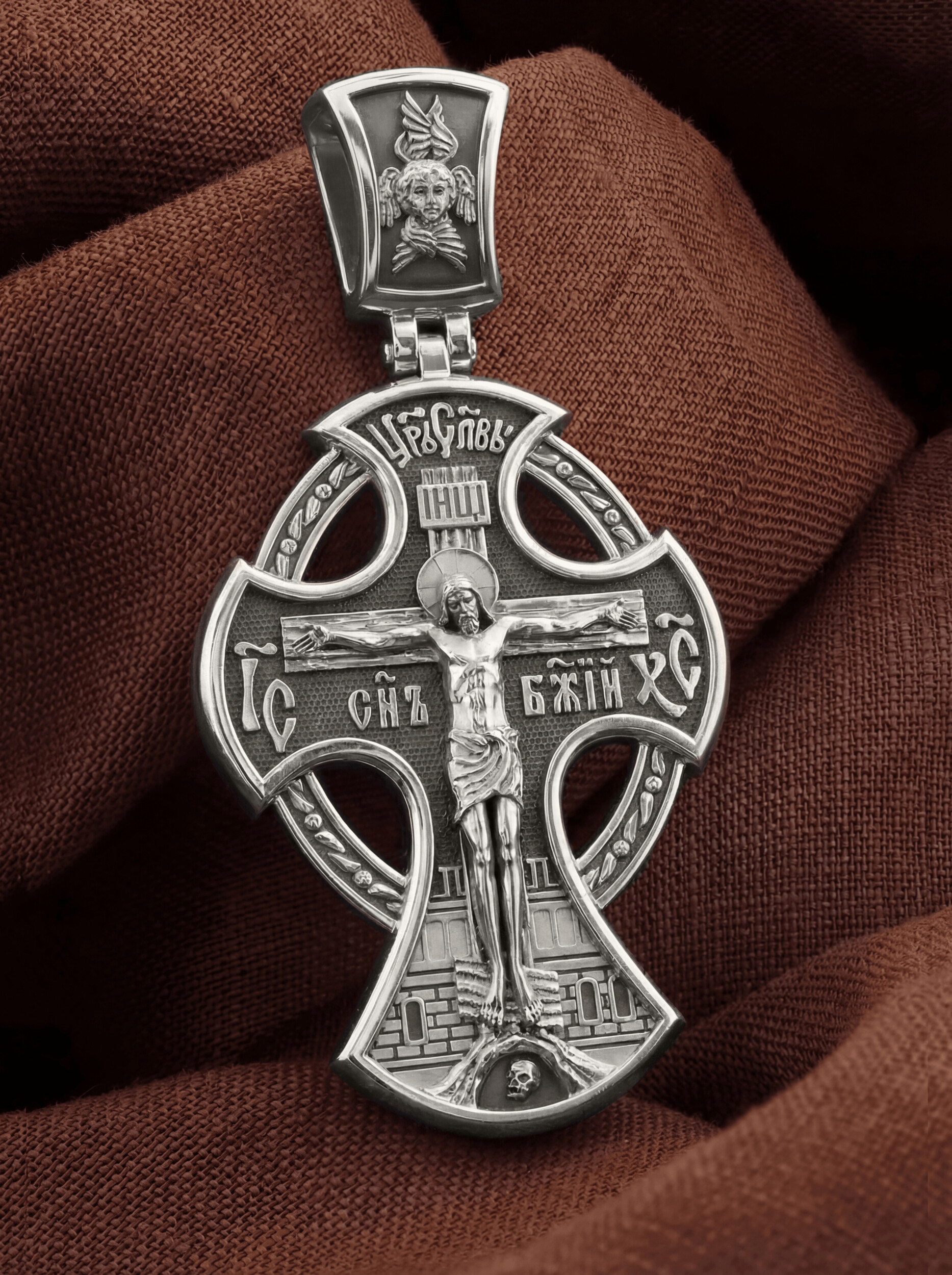 На лицевой стороне креста изображено Распятие Иисуса Христа. Господь представлен свободно покоящимся на кресте с простертыми руками и как бы обнимающим всю Вселенную. Он — Спаситель, искупивший грехи мира, «поправший смертию смерть» и призывающий к Себе «все концы земли». Поэтому рядом с Его образом помещены слова «Царь Славы». Эти слова характеризуют Господа как Великого Архиерея, победителя смерти. Верхняя перекладина символизирует титло — табличку, на которой, согласно Евангелию, было начертано: Иисус Назорей Царь Иудейский (IНЦI). Также Распятие сопровождается надписями, олицетворяющими Христа. Это святое имя Христа «IC» (Иисус) «ХС» (Христос), и словосочетание «Сын Божий». Крест стоит на горе камней, символизирующих Голгофу, в основании которой различается череп. Это голова Адама. На кулонном кольце помещено изображение серафима.