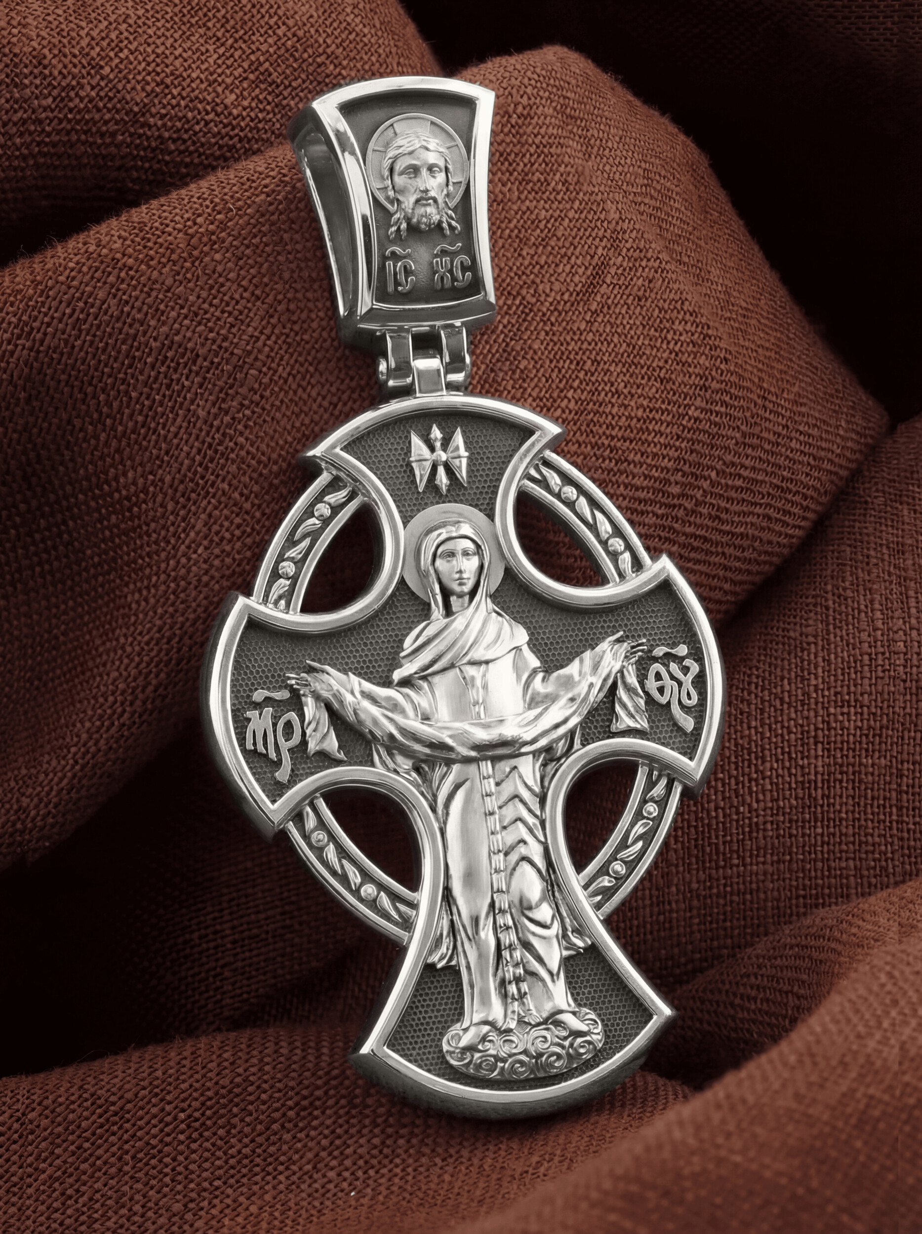 На обороте креста изображена икона Покрова Пресвятой Богородицы. Праздник Покрова Божией Матери является воспоминанием чуда, которое произошло во Влахнернской церкви 1 (14) октября 910 года: Пресвятая Богородица явилась верующим над алтарем храма и распростерла над ними Свое покрывало. В этот день Божья Матерь открыла людям, что Она является Ходатаицей за них перед Богом. Богородица простирает Свой молитвенный покров над всеми православными христианами и умоляет Сына Своего о даровании вечного спасения каждому человеку. На кулонном кольце помещено изображение Спаса Нерукотворного — образ Спасителя, который Он запечатлел на плате и передал для исцеления больному проказой царю Эдессы. Ему придается победное и защитное значение.