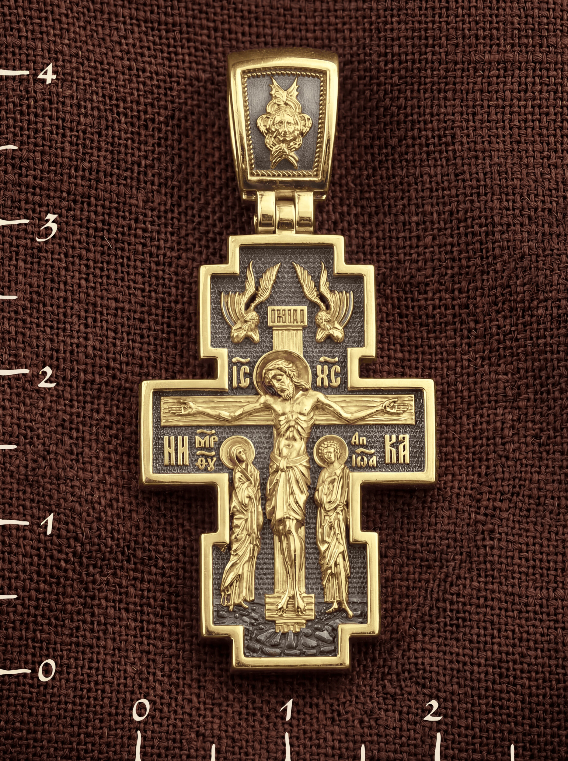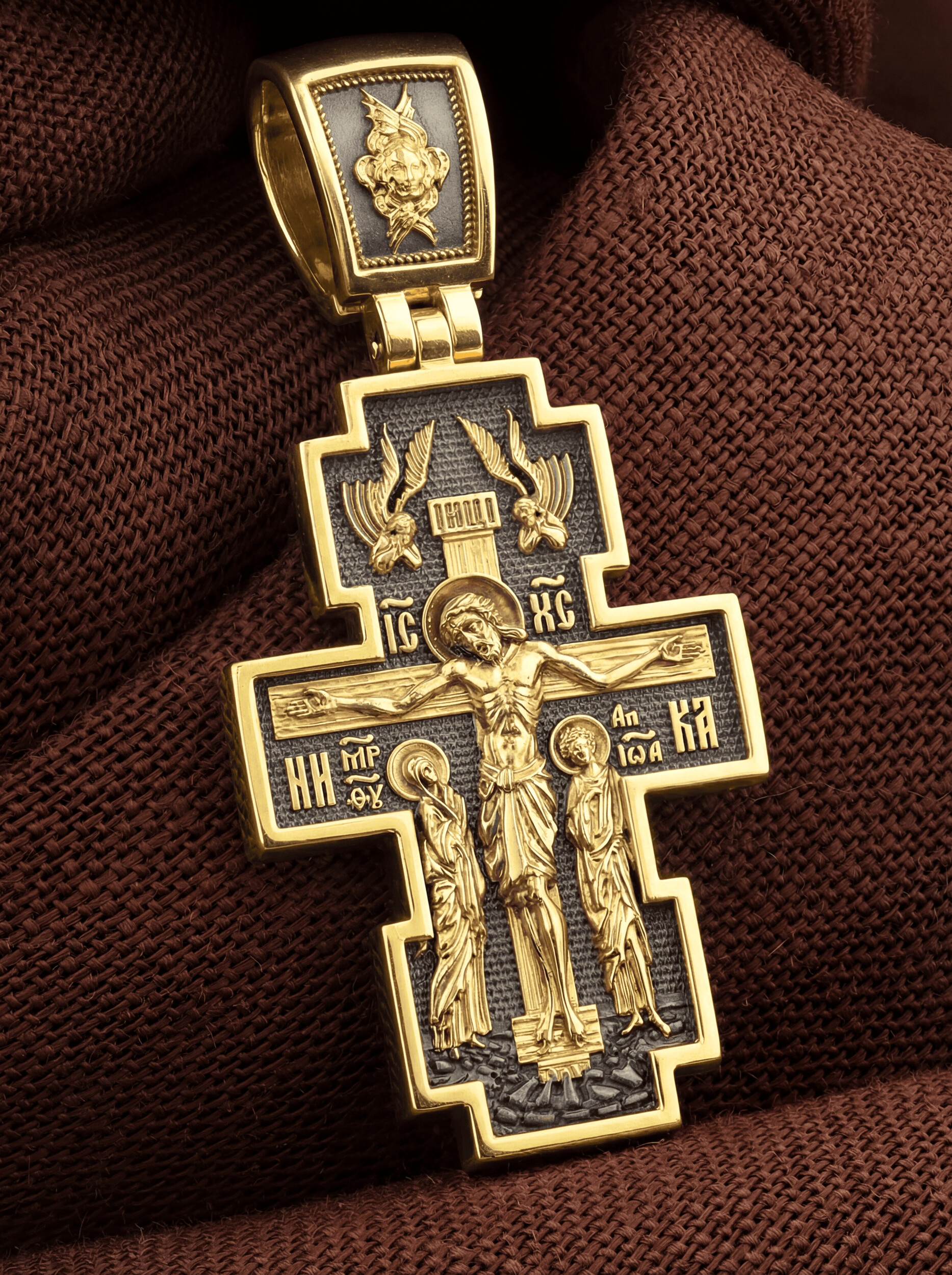 На лицевой стороне креста изображено Распятие Господа Иисуса Христа с предстоящими Ему святыми, которые, по преданию, находились у Креста Господа во время Его казни. Слева — Пресвятая Богородица, справа — апостол Иоанн Богослов. Верхняя перекладина креста символизирует титло — табличку, на которой, согласно Евангелию, было начертано: «Иисус Назорей Царь Иудейский» (IНЦI). Над перекладиной пишется сокращенно имя Спасителя «IC XC» — Иисус Христос, ниже перекладины добавляется: «НИКА» (греч. — Победитель). Возвышение, на котором стоит Крест, символизирует гору Голгофу, на которой произошло Распятие. У подножия Креста изображают прах Адама, обозначенный черепом. На кулонном кольце изображен шестикрылый Серафим — самый приближенный к Господу Ангел.