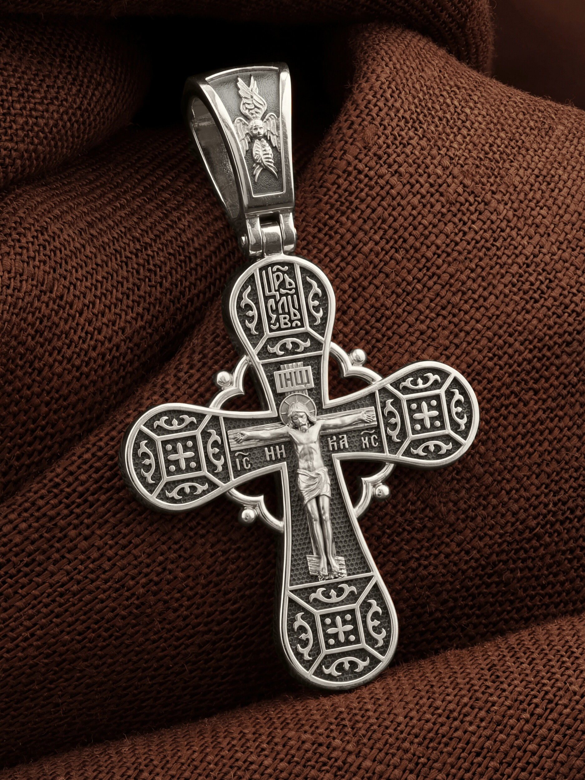 На лицевой стороне креста изображено Распятие, потому что это орудие казни Иисус Христос сделал орудием победы над грехом и смертью. Своими страданиями Он искупил грехи человечества, умерев и сошествовав во ад, победил сатану, освободил души праведников от вечной смерти и открыл им небесные врата рая. Жертва Христа сделала возможным спасение для каждого человека. На православном кресте Христос не умирает, а свободно простирает руки, ладони Иисуса открыты, будто он хочет обнять все человечество, даря им свою любовь и открывая путь к вечной жизни. Над титлом видим слова «ЦРЬ СЛВЫ» — Царь Славы. Верхняя перекладина символизирует собой табличку с надписью «IHЦI» — Иисус Назарянин Царь Иудейский. Под перекладиной пишется сокращенно имя Спасителя «IC XC» — Иисус Христос, рядом добавляется: «НИКА» (греч. — Победитель). Возвышение, на котором стоит Крест, символизирует гору Голгофу, на которой произошло Распятие. У подножия Креста изображают прах Адама, обозначенный черепом.