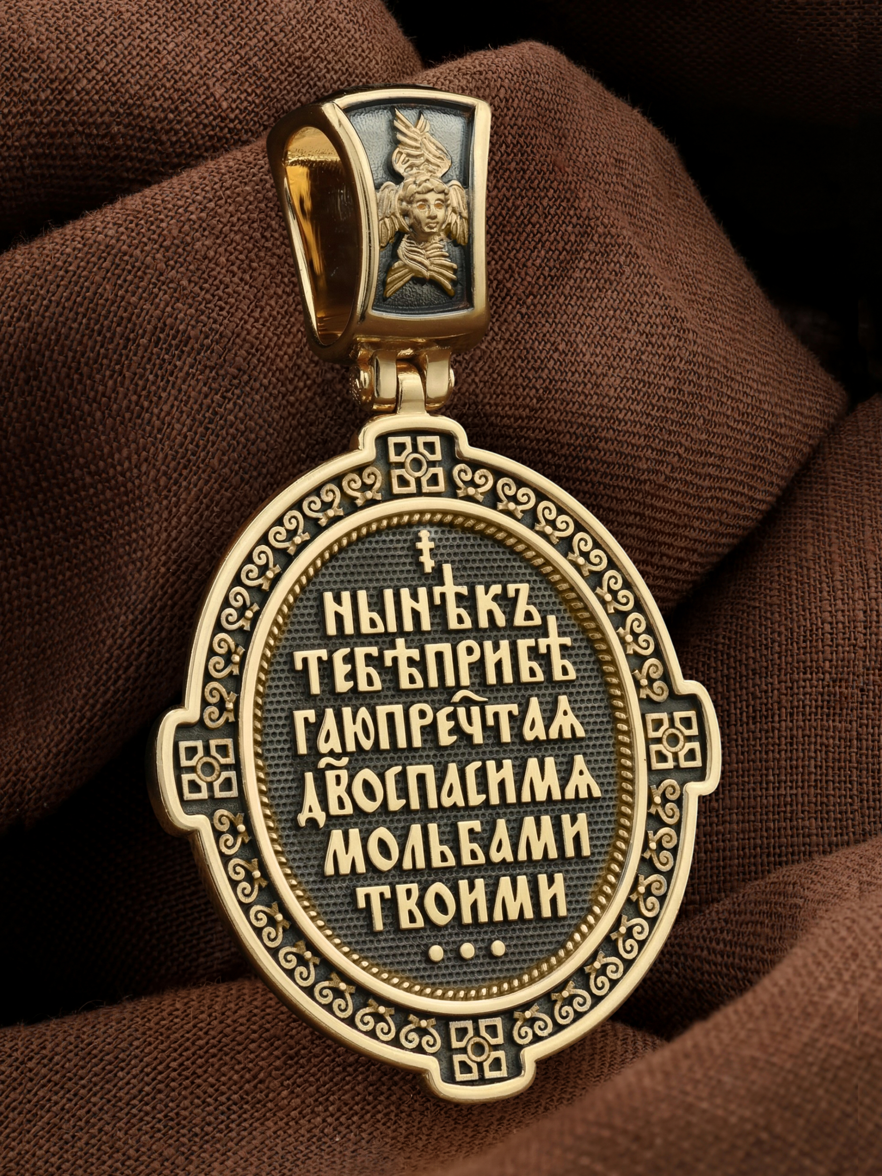 На кулонном кольце изображен Спас Нерукотворный — Символ вочеловечившегося Божества и шестикрылый Серафим — самый приближенный к Господу Ангел.