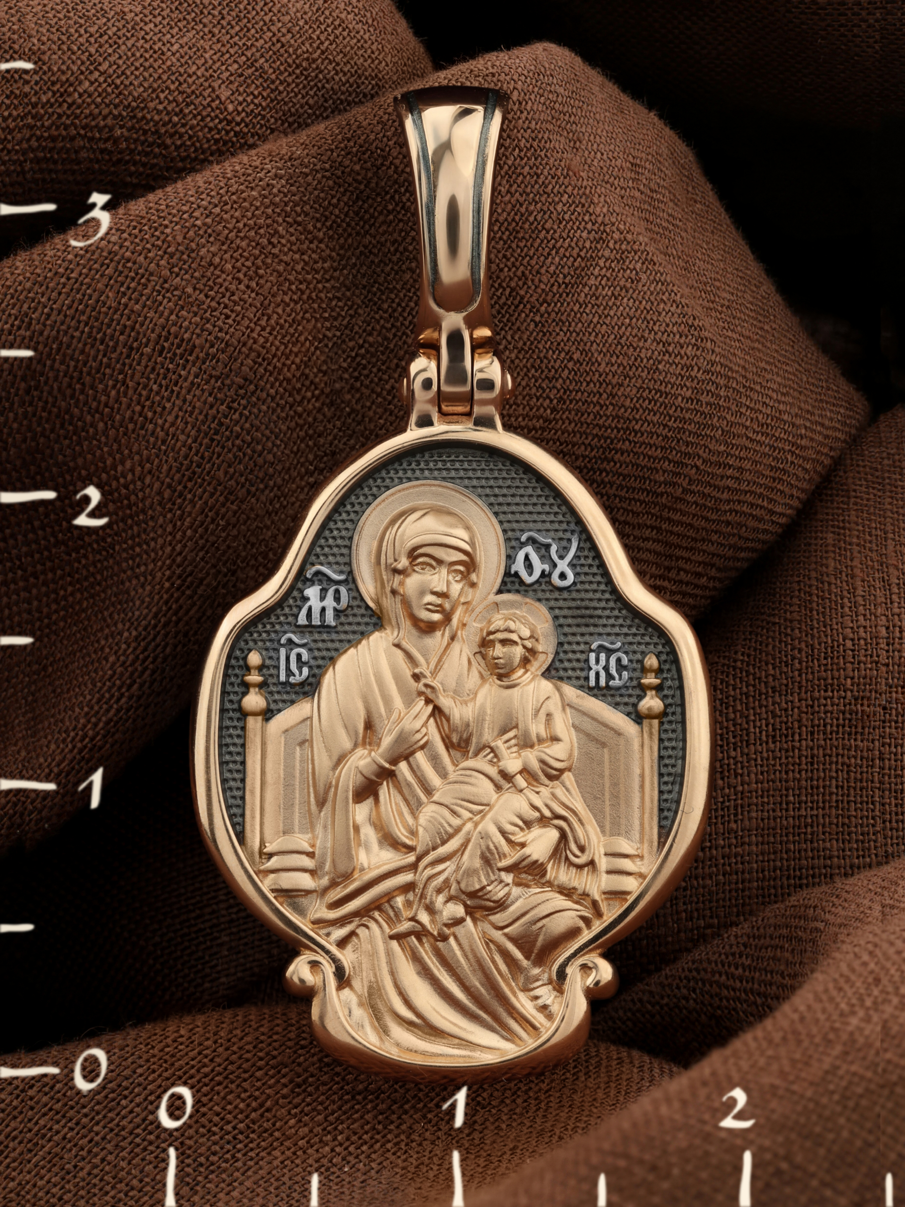 В центр образка помещен образ Божией Матери «Всецарица», восседающая на царском троне. На руках Ее — Богомладенец Иисус Христос со свитком в левой руке. Пальцы Его правой руки сложены в благословляющем жесте.