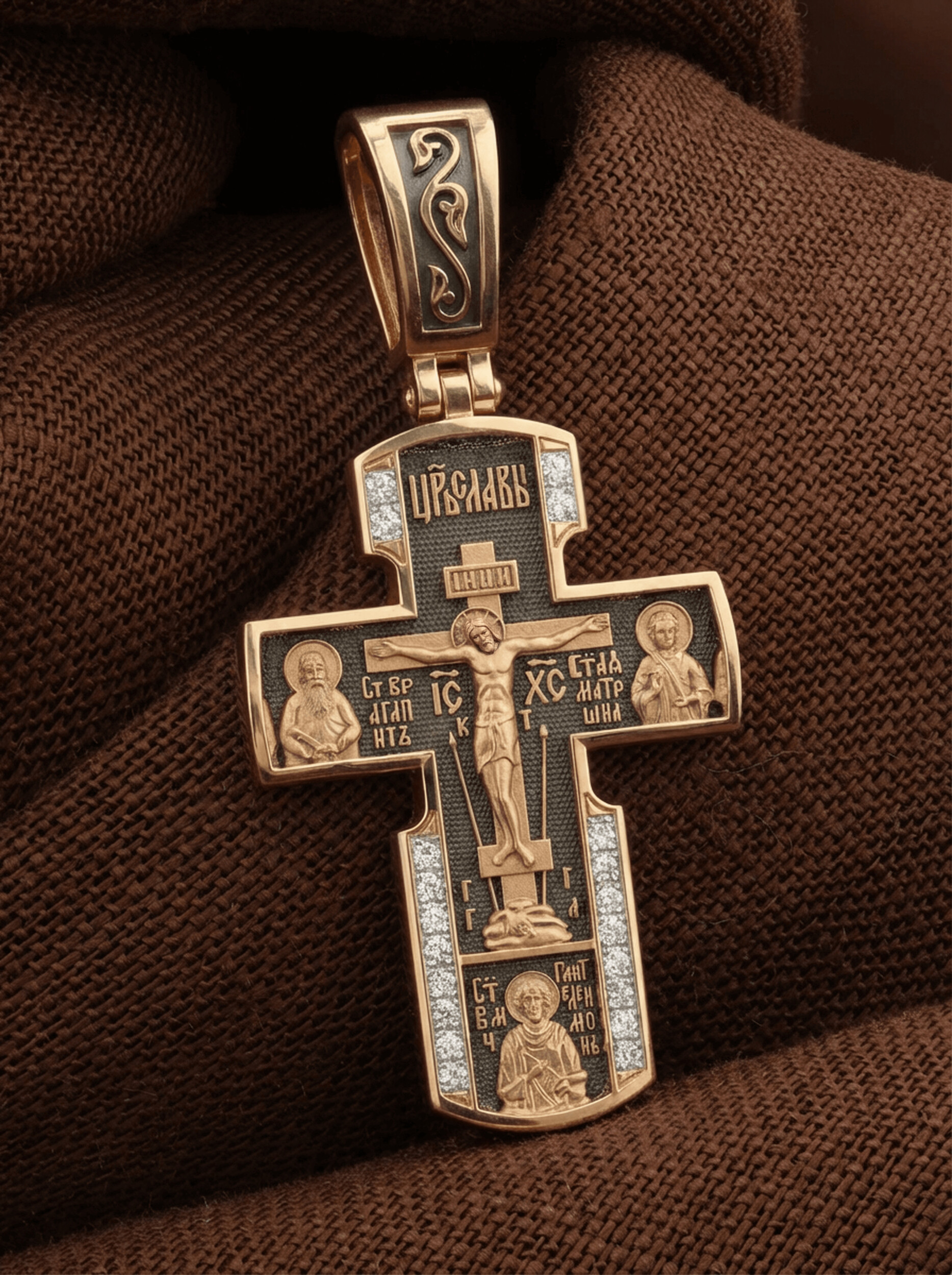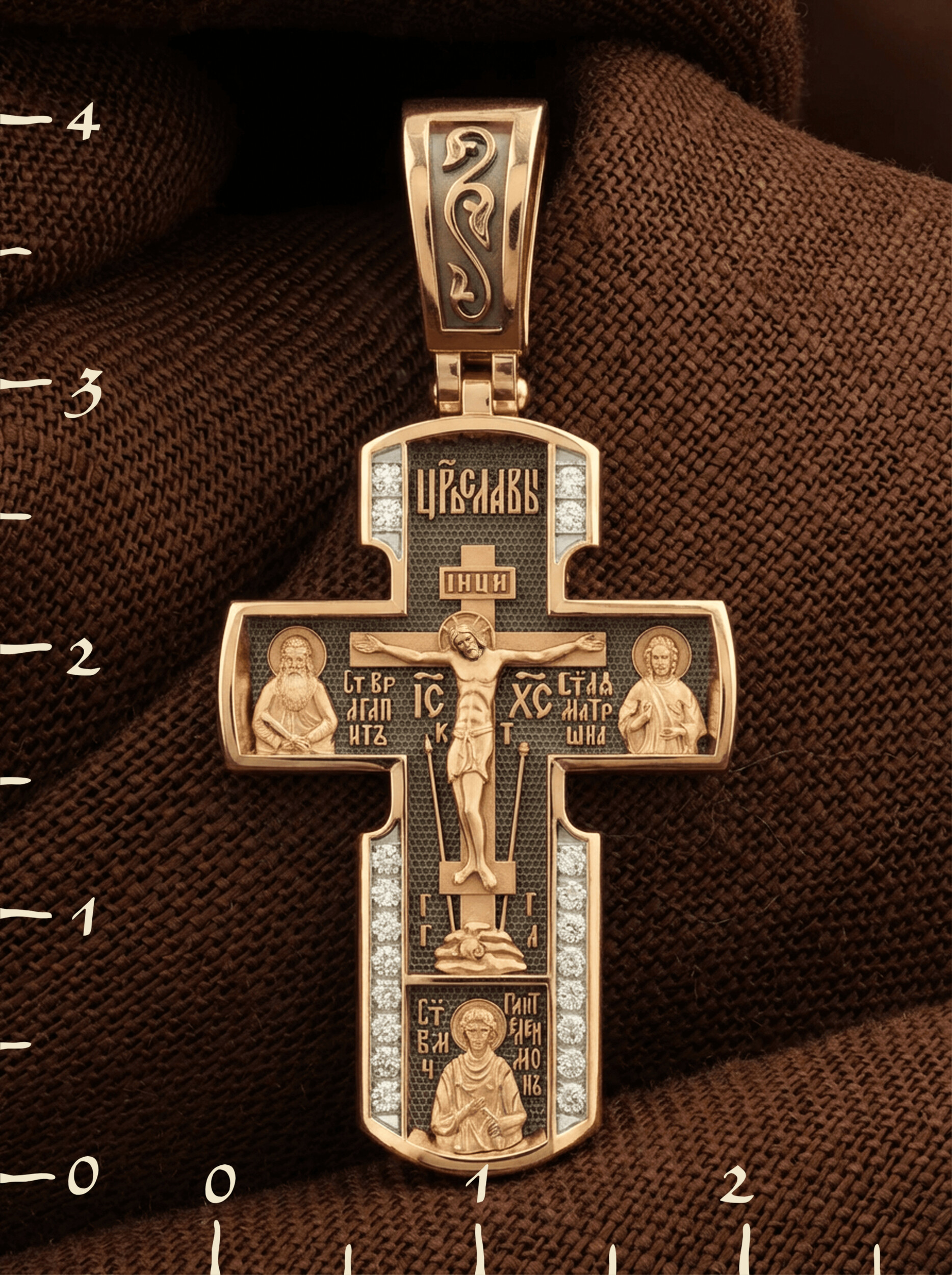 На лицевой стороне креста изображено Распятие Иисуса Христа на Голгофском Кресте, над вершиной которого помещена надпись «Царь Славы». Справа от Распятия помещен образ прославленной святой блаженной Матроны. «Матронушка», — ласково называют эту святую православные за удивительную любовь и помощь, которую она подает всем нуждающимся в ее поддержке. Слева — икона прп. Агапита. Этот святой жил в пещерах Киево-Печерского монастыря в XI веке и бескорыстно врачевал мирян и монахов.