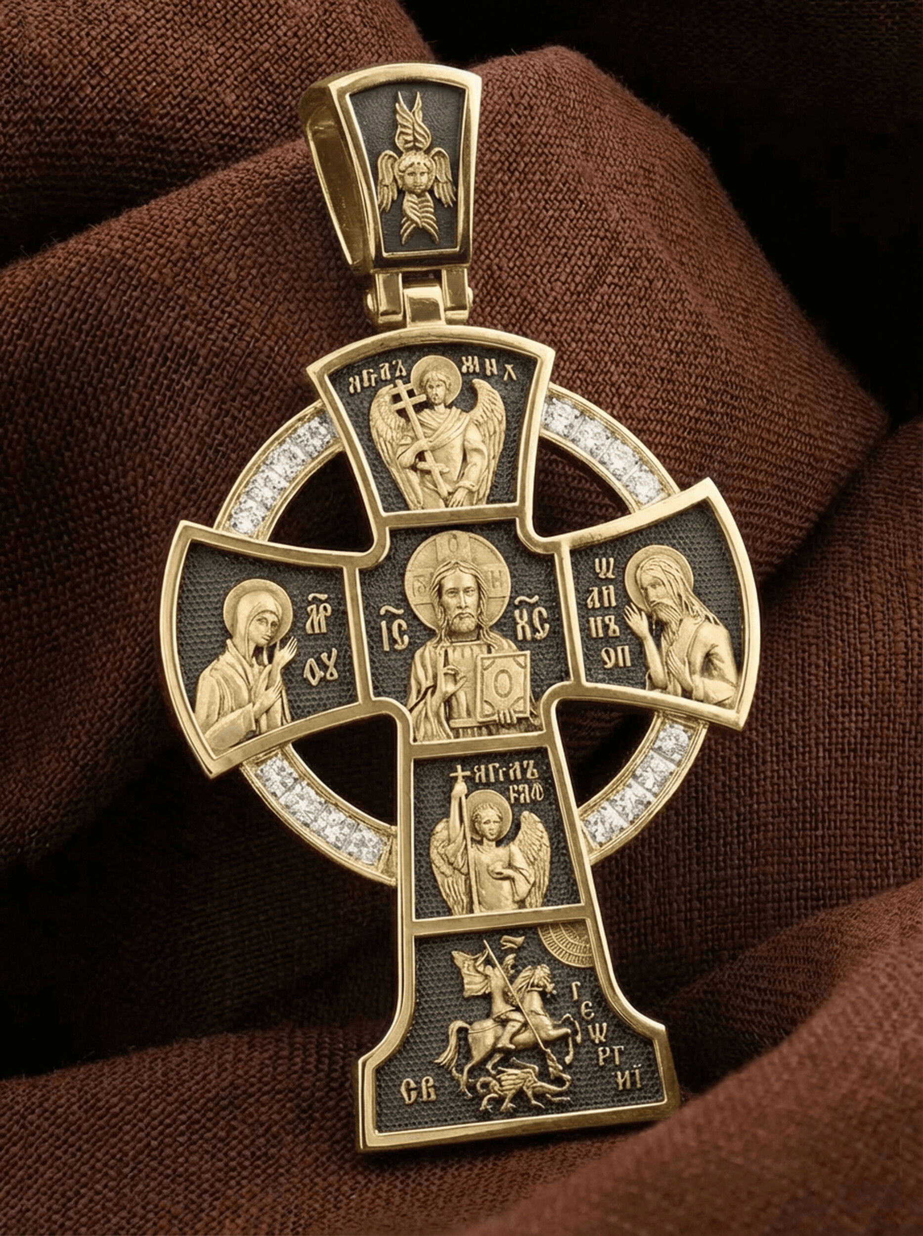Вверху и внизу от спасителя предстоят два архангела, Михаил (Первый служитель Божественной славы, страж и защитник) и Гавриил (служитель Божественной крепости и изъявитель сокровенных Божьих тайн). Внизу помещен образ свт. Георгия Победоносца. Святой при жизни прославился не только как храбрый воин и твердый исповедник веры, но и как сострадательный, милосердный целитель и чудотворец. Святому молятся о покровительстве воинам и армии, о защите государства, сохранении и спасения России.