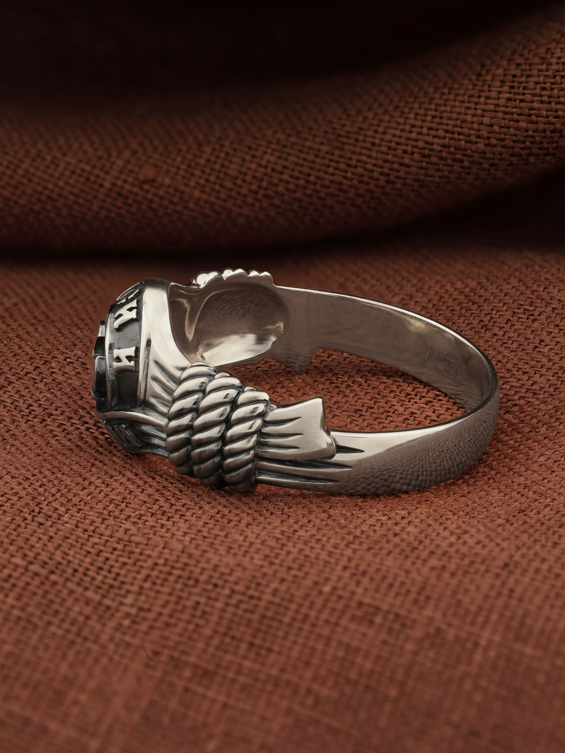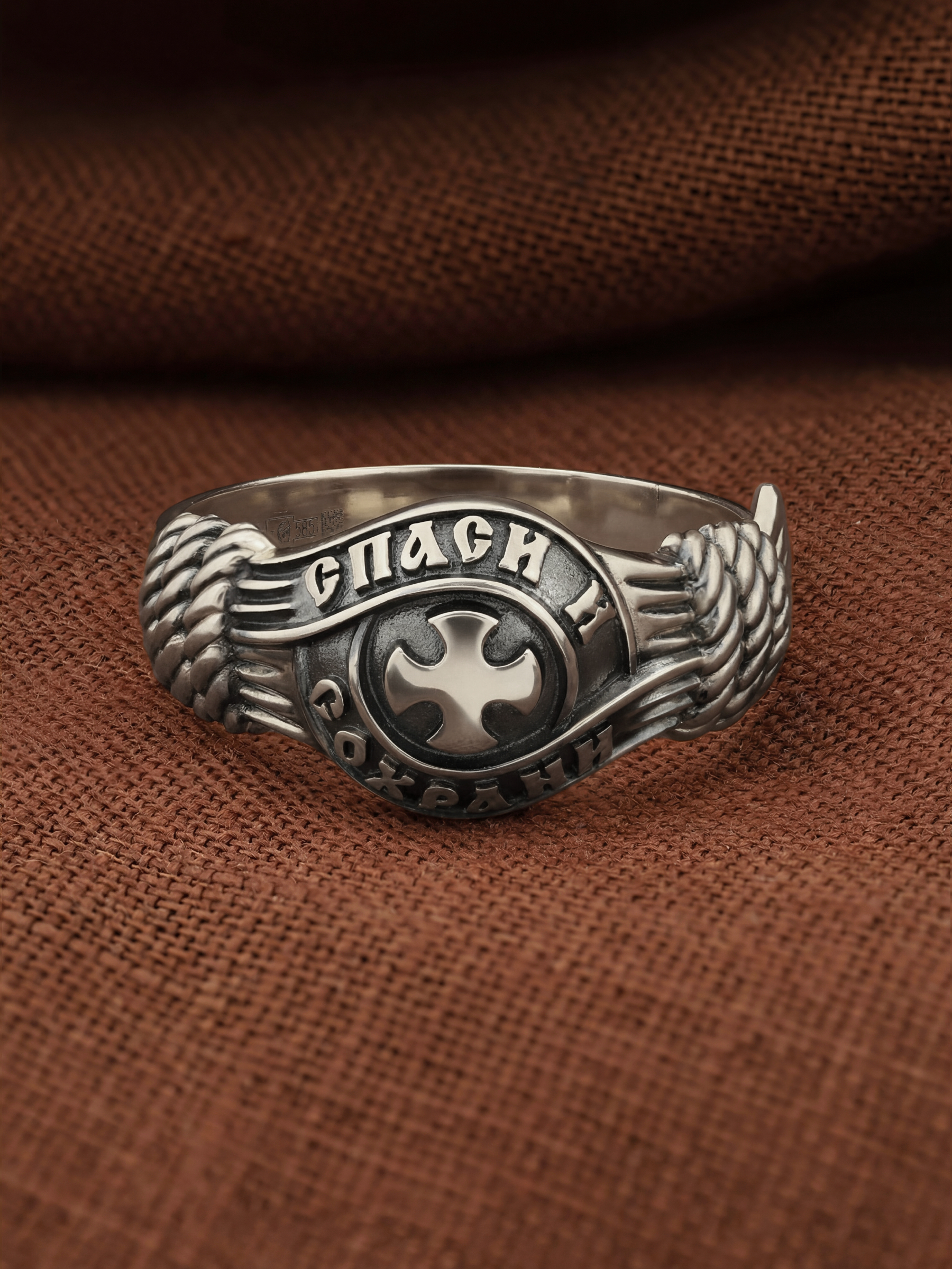 В центральной части лицевой стороны кольца изображен Крест. Господь сказал: кто хочет идти за Мною, отвергнись себя, и возьми крест свой, и следуй за Мною. Крест является символом жертвенной любви Всеблагого Бога к падшим людям, всепобеждающим духовным оружием христиан, основанием и средоточием церковной жизни. Иисус Христос, как искупительная жертва освобождения человечества от власти греха, умер крестной смертью и в третий день воскрес. Крест имеет четырехконечную форму с равными балками. Такого типа кресты существовали во многих дохристианских культурах и были в первую очередь использованы Церковью для выражения идеи христианского преобразования мира. Вокруг креста помещена молитва: «Спаси и Сохрани».