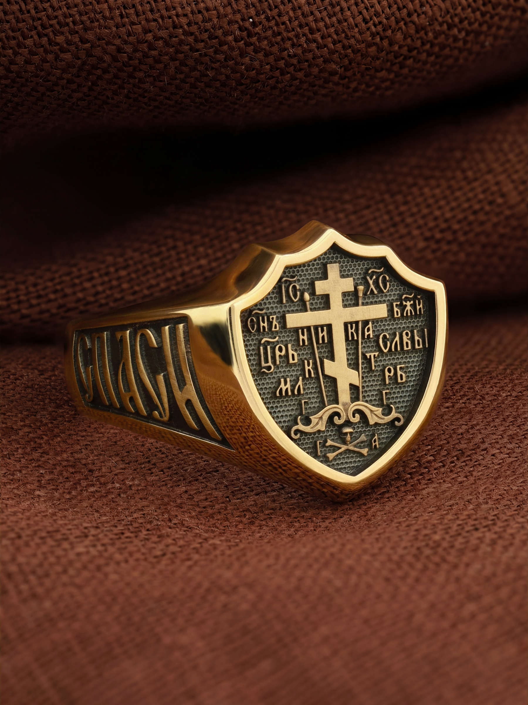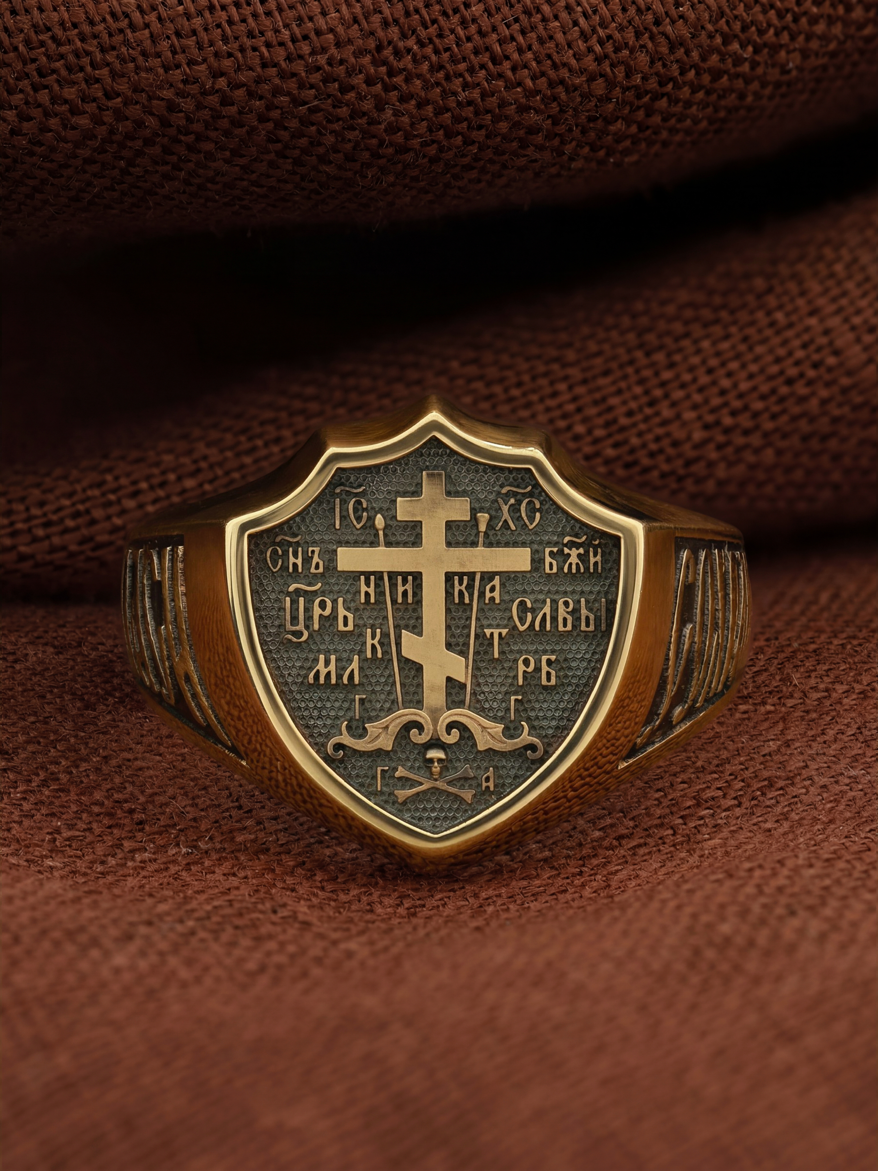 Вдоль креста располагаются буквы «К» и «Т» — означают копье и трость с губкой, пропитанной уксусом, которую подали жаждущему Иисусу Христу. Над средней перекладиной видны слова «ЦРЬ СЛВЫ», что означает Царь Славы. Под ней помещено слово «Ника» — что означает Победитель. Над средней перекладиной видна надпись «СНЪ БЖIЙ», что означает Сын Божий. А над верхней перекладиной надписи «IC» «ХС» — имя Иисуса Христа.