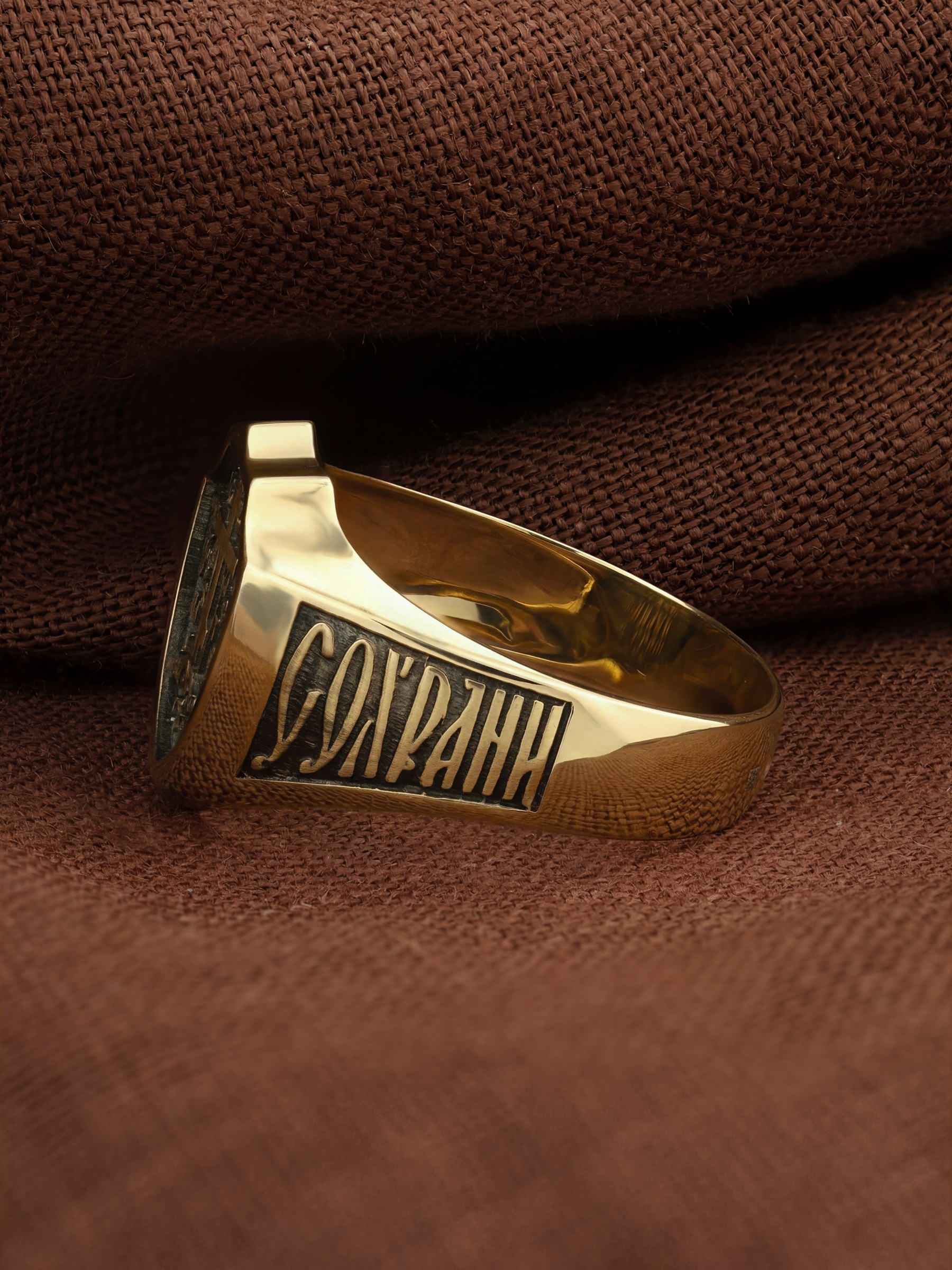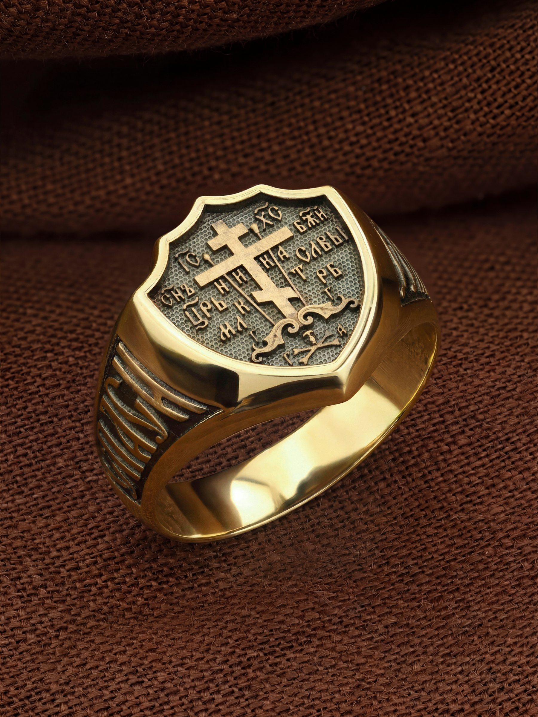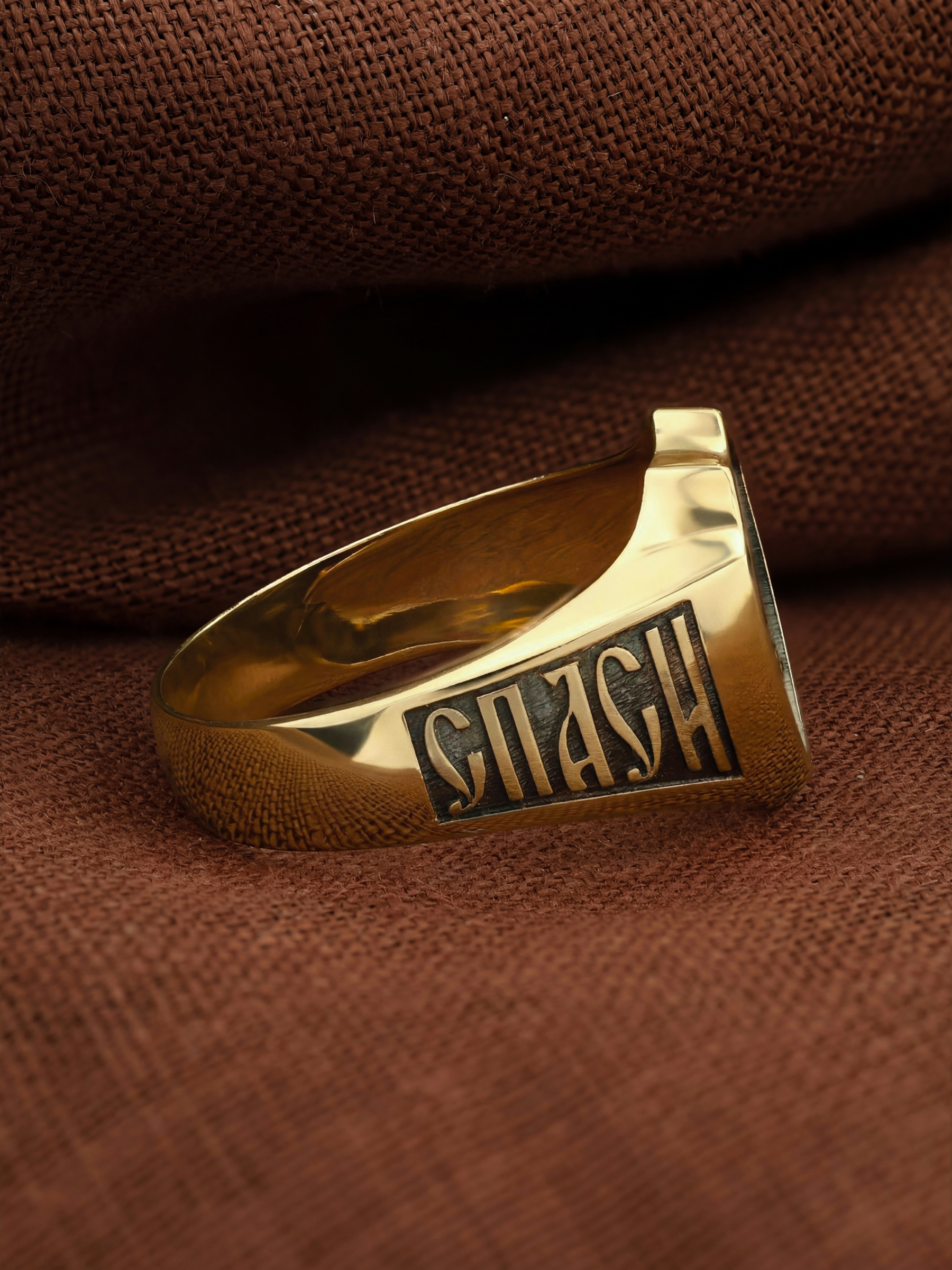 На перстне изображен «Голгофский крест». Центральным и главным элементом композиции лицевой стороны является восьмиконечный крест — образ Честного и Животворящего Креста Господня, установленного на горе Голгофе. В основании креста изображена гора Голгофа, на которой был распят Спаситель и череп Адама, чьи кости по приданию омыла кровь Иисуса Христа. Перед головой располагаются лежащие кости рук, изображаются правая на левой, как при погребении или причащении. В XVI веке на Руси около изображения Голгофы появились обозначения «М.Л.Р.Б.» — Место Лобное Рай Бысть (Голгофа в переводе с еврейского — Лобное место). Чуть ниже справа и слева буквы «Г.Г.» — гора Голгофа.