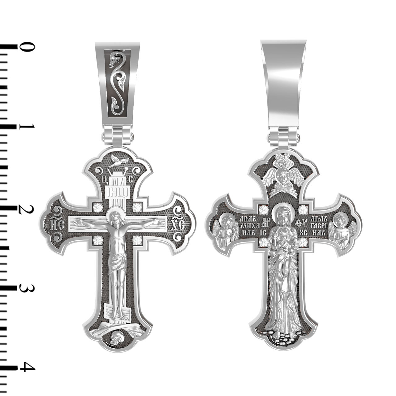 На лицевой стороне этого креста центральную часть занимает икона Распятия Христа — образ жертвы, принесенной Господом за грехи людей. Именно ко Христу, сошедшему на землю ради нашего спасения, возносятся все молитвы. Пресвятая Богородица, ангелы и святые — помощники Господа в деле спасения и заступники за людей перед Богом. «Оружием великим Христовым» именует Церковь крест, потому что, претерпев страдания и умерев, Господь победил смерть и лишил дьявола его власти над миром. Поэтому рядом с титлами Святого имени Христа написано «НИКА», что значит «победитель».