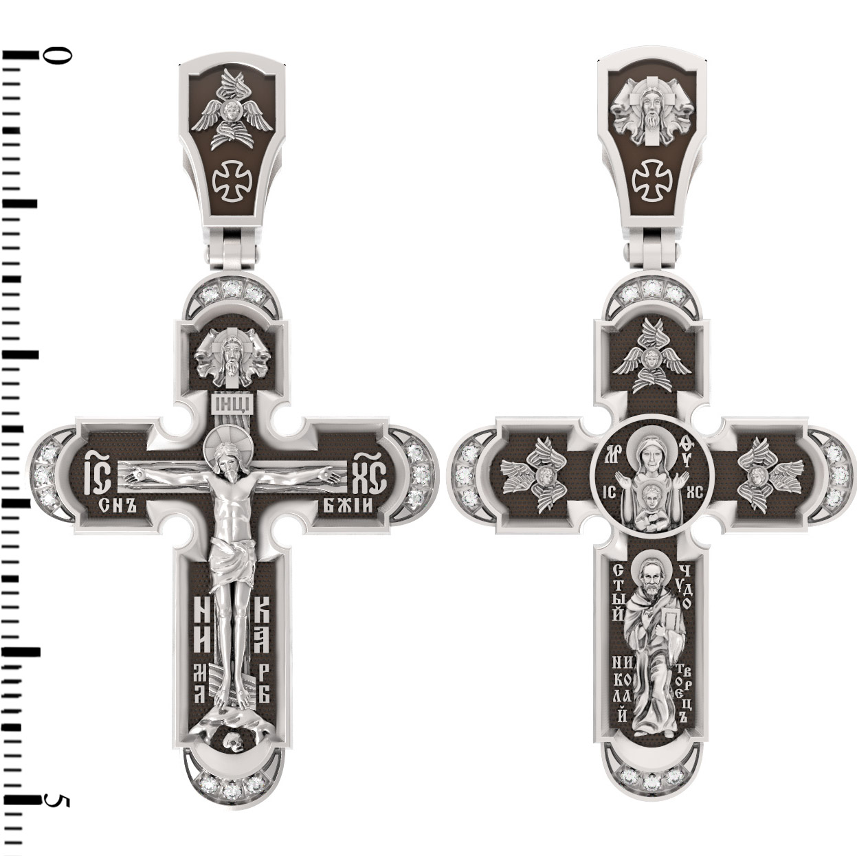 На лицевой стороне нательного креста по традиции изображено Распятие Господа нашего Иисуса Христа. Крест Господень стоит на небольшом каменистом возвышении, символизирующем гору Голгофу, которая обозначена буквами МЛРБ (Место Лобное Рай Бысть). Над головой Господа на поперечной перекладине написано «ИНЦИ», что символизирует табличку, которая была прибита к Кресту, с надписью «Иисус Назорей Царь Иудейский». Этим иудеи хотели посмеяться над Христом, не зная, что распинают истинного Царя всех царей. По сторонам основной перекладины расположены позолоченные рельефные инициалы Христа «ИС ХС». Под перекладиной, по сторонам древа, находится надпись «СЫН БОЖИЙ», а в основании креста — надпись «НИКА» (Победитель).