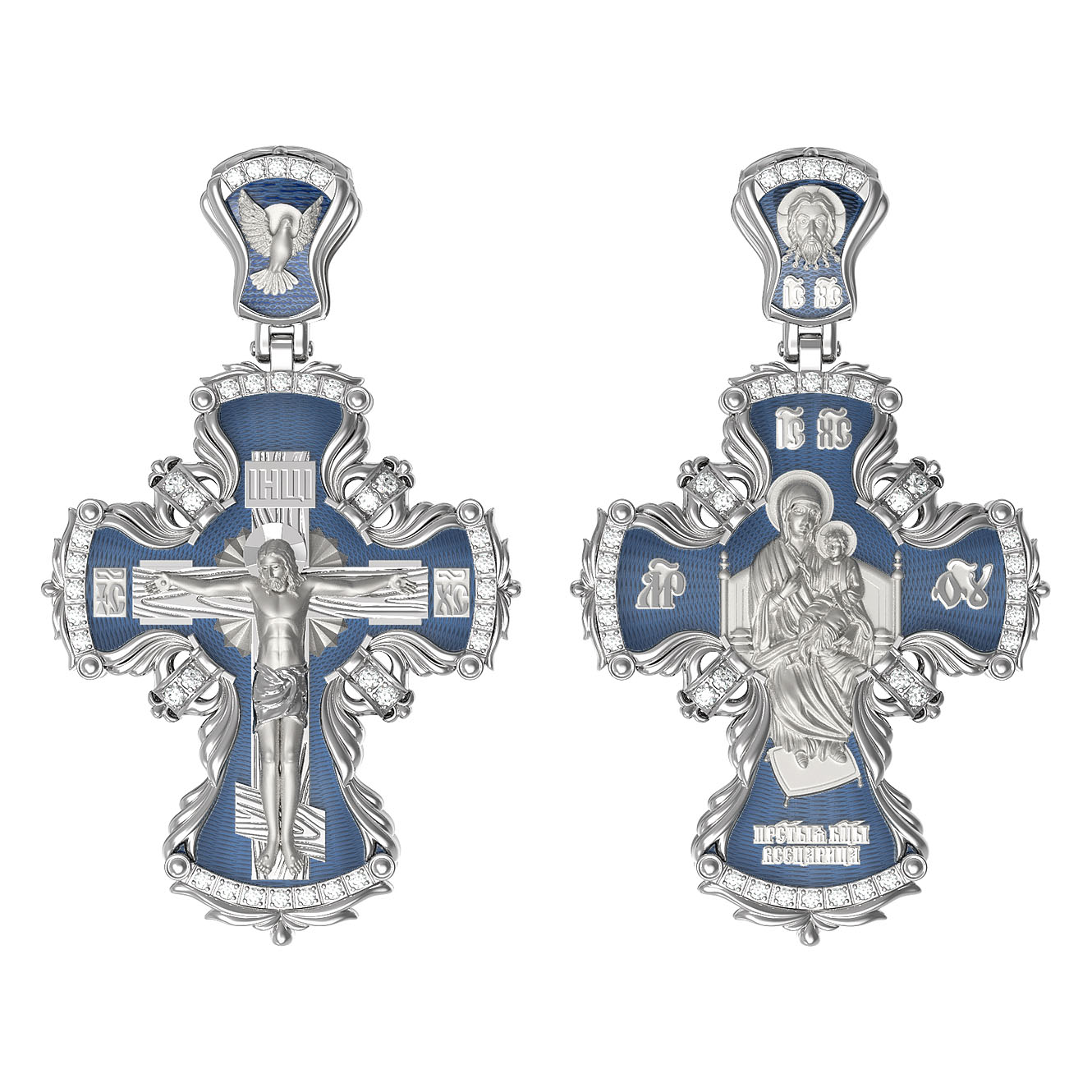 На лицевой стороне креста изображено Распятие Господа и Спасителя нашего Иисуса Христа, отдавшего Себя на смерть, чтобы другие могли жить — жить вечной жизнью, жить с Богом. Своею кровью Господь освятил крест и сделал его проводником Своей благодати, источником освящения верующих. На верхней табличке, выше головы Иисуса, расположена надпись, составленная Понтием Пилатом — «ИНЦИ». Она означает «Иисус Назорей, Царь Иудейский». Надпись «IС ХС» означает Иисус Христос помещается на разных сторонах поперечной (большой) перекладины креста. На кулонном кольце помещено изображение Духа Святого в виде голубя, сходящего с Небес.