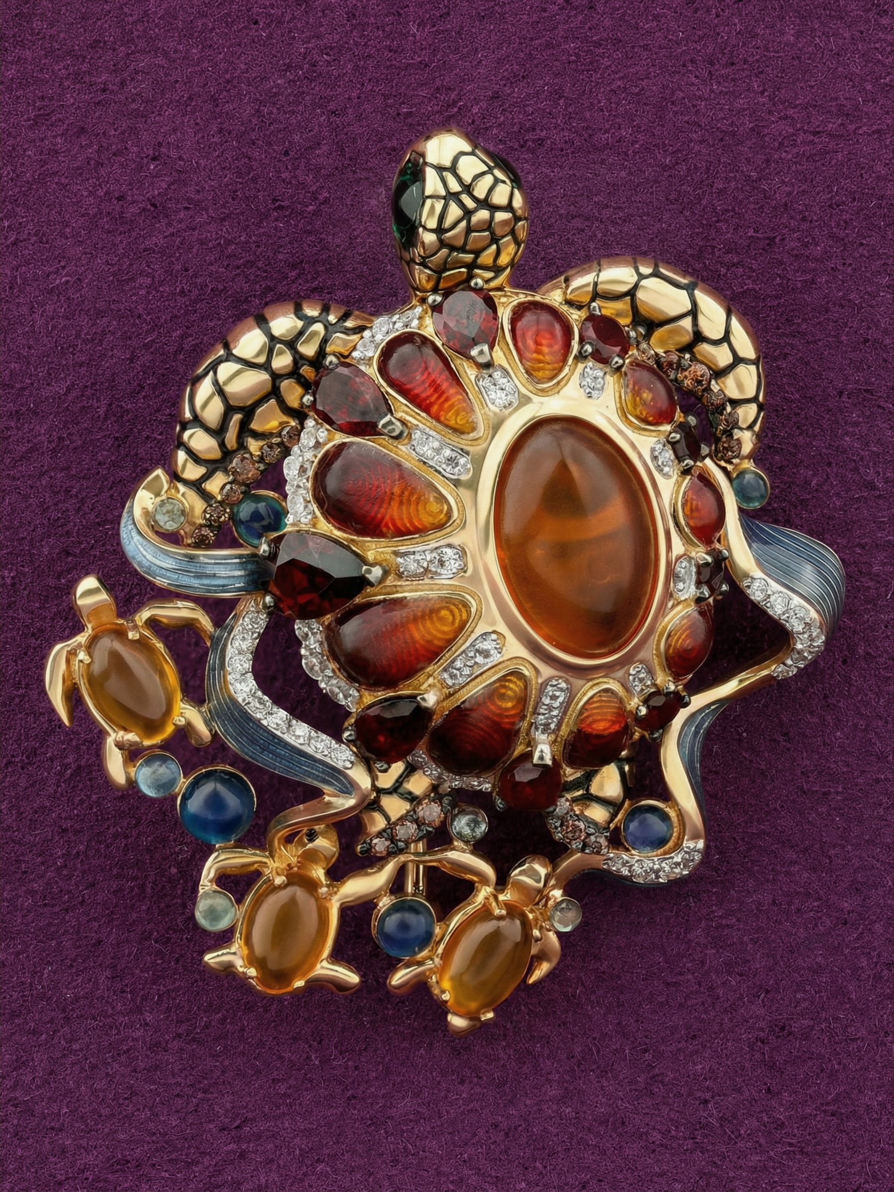 Брошь из лимонного золота c эмаль, фианитом, гранатом и янтарём