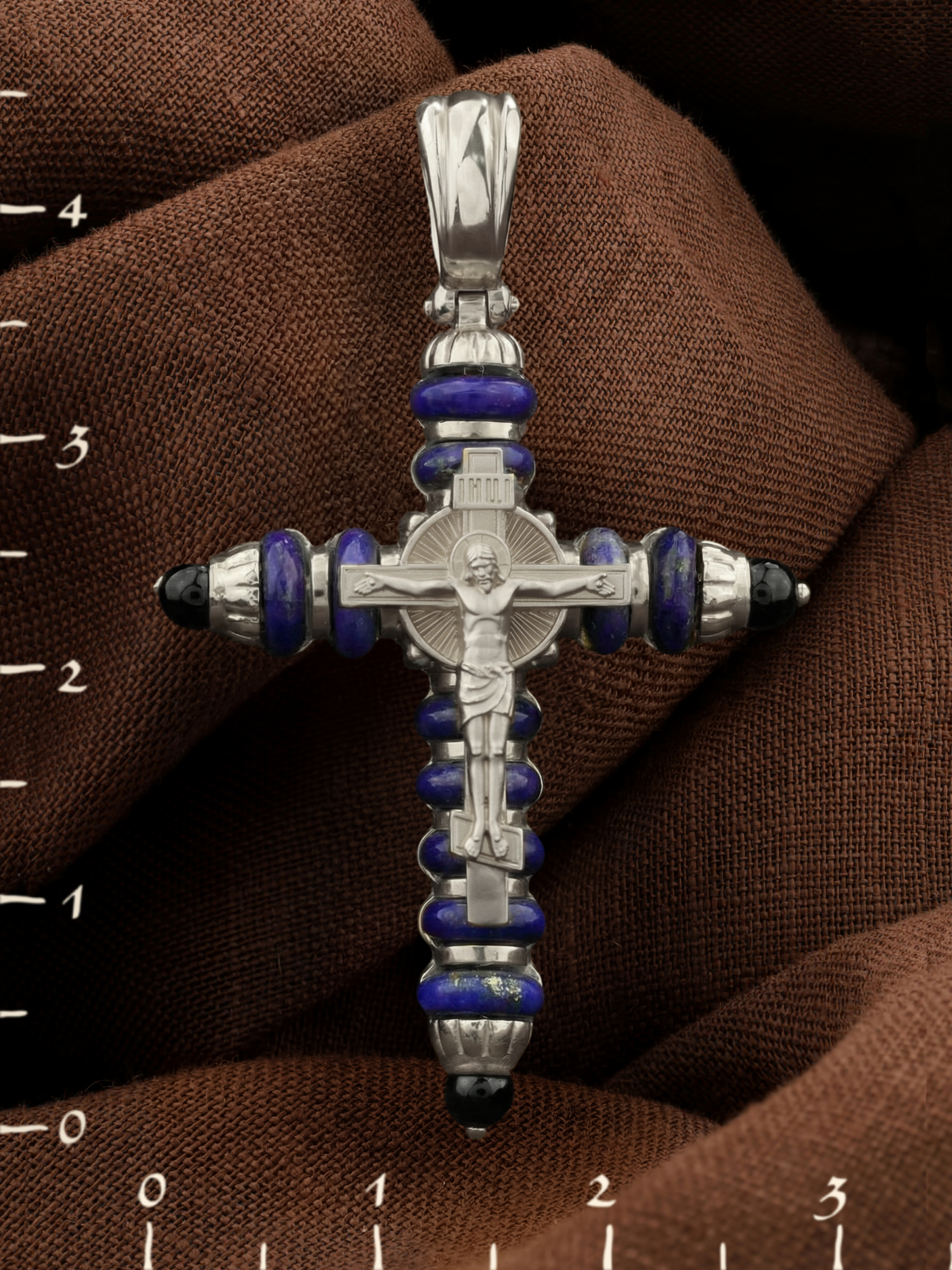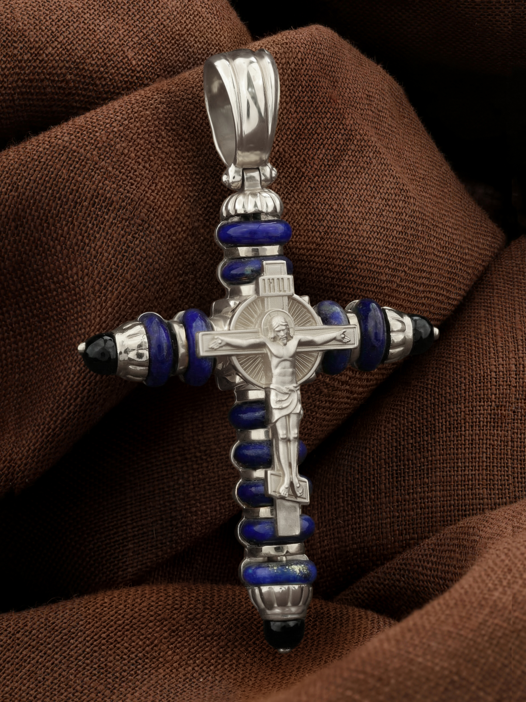 Крест из белого золота c ониксом и лазуритом