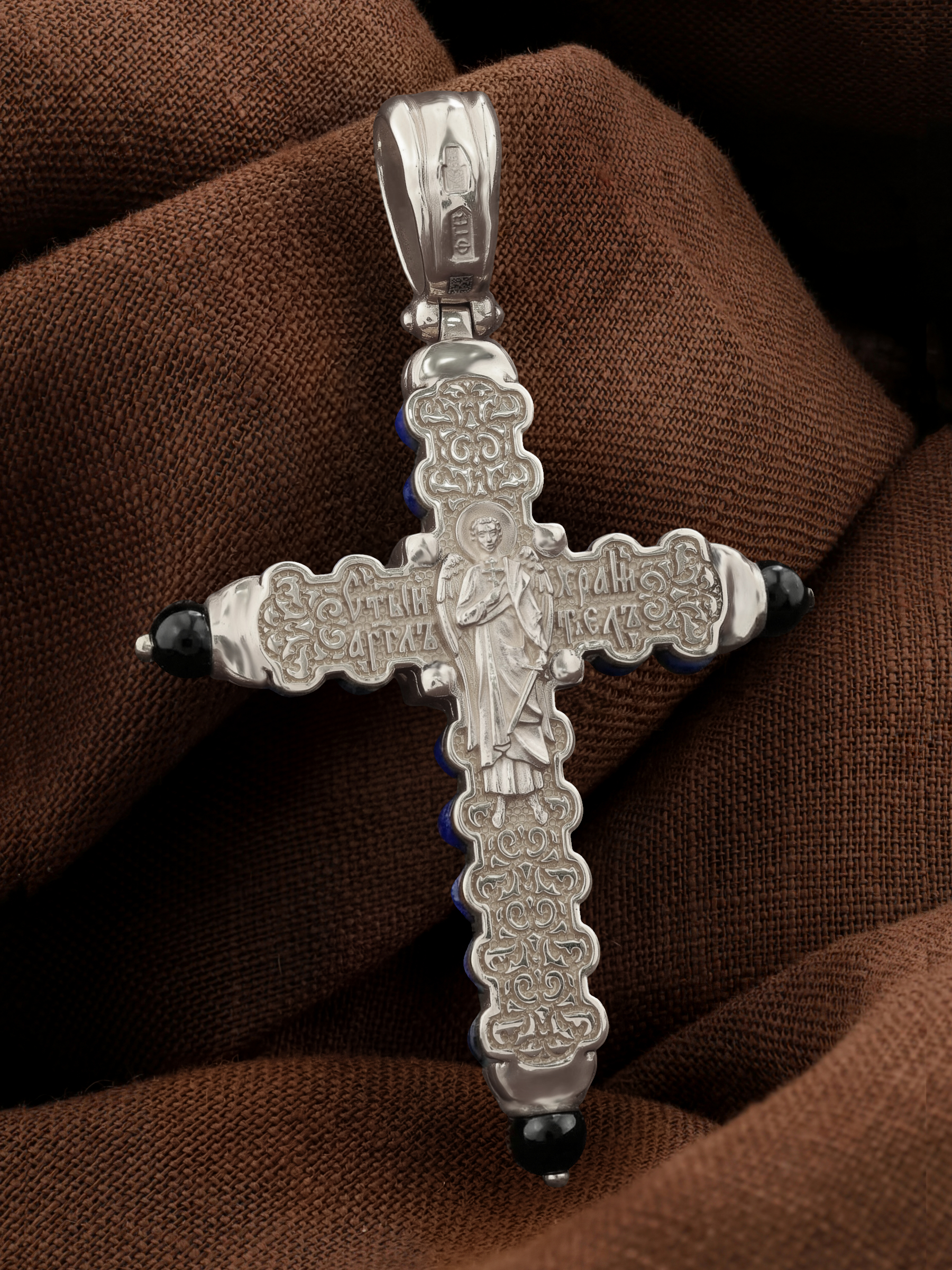 На оборотной стороне креста изображен святой Ангел-Хранитель в виде прекрасного юноши держащего в правой руке крест, а в левой — сферу. Ангел-Хранитель — это Ангел приставляемый Богом к человеку при крещении для охраны и помощи в добрых делах. Невидимо пребывая при нас постоянно, он, руководствуя нас ко спасению, не только по нашему желанию таинственно наставляет нас на все доброе и полезное, не только возносит наши молитвы к Богу, но еще и сам от себя охраняют и защищают нас от врагов видимых и невидимых, ходатайствует за нас пред Богом.
