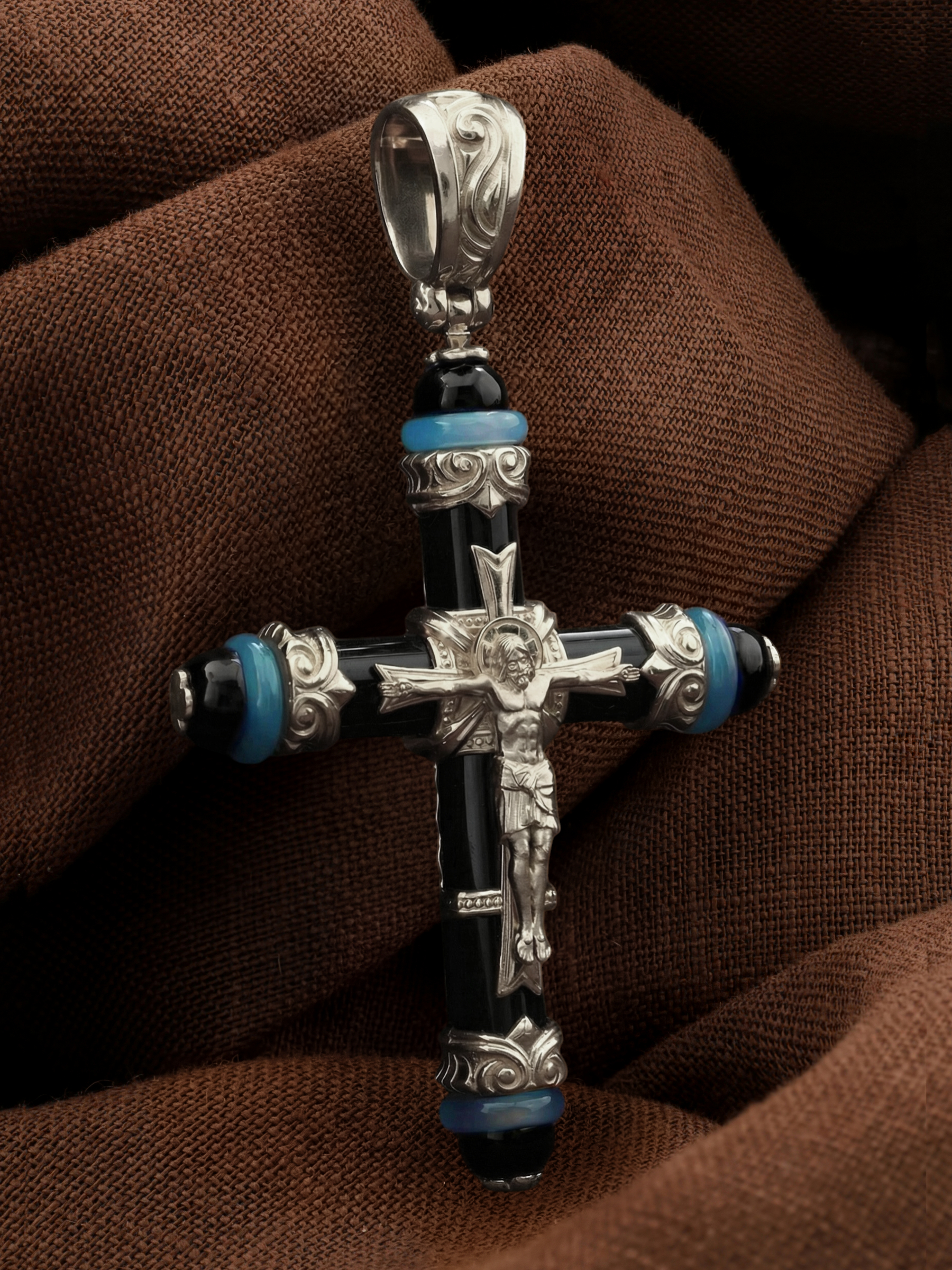 Крест из белого золота c ониксом и агатом