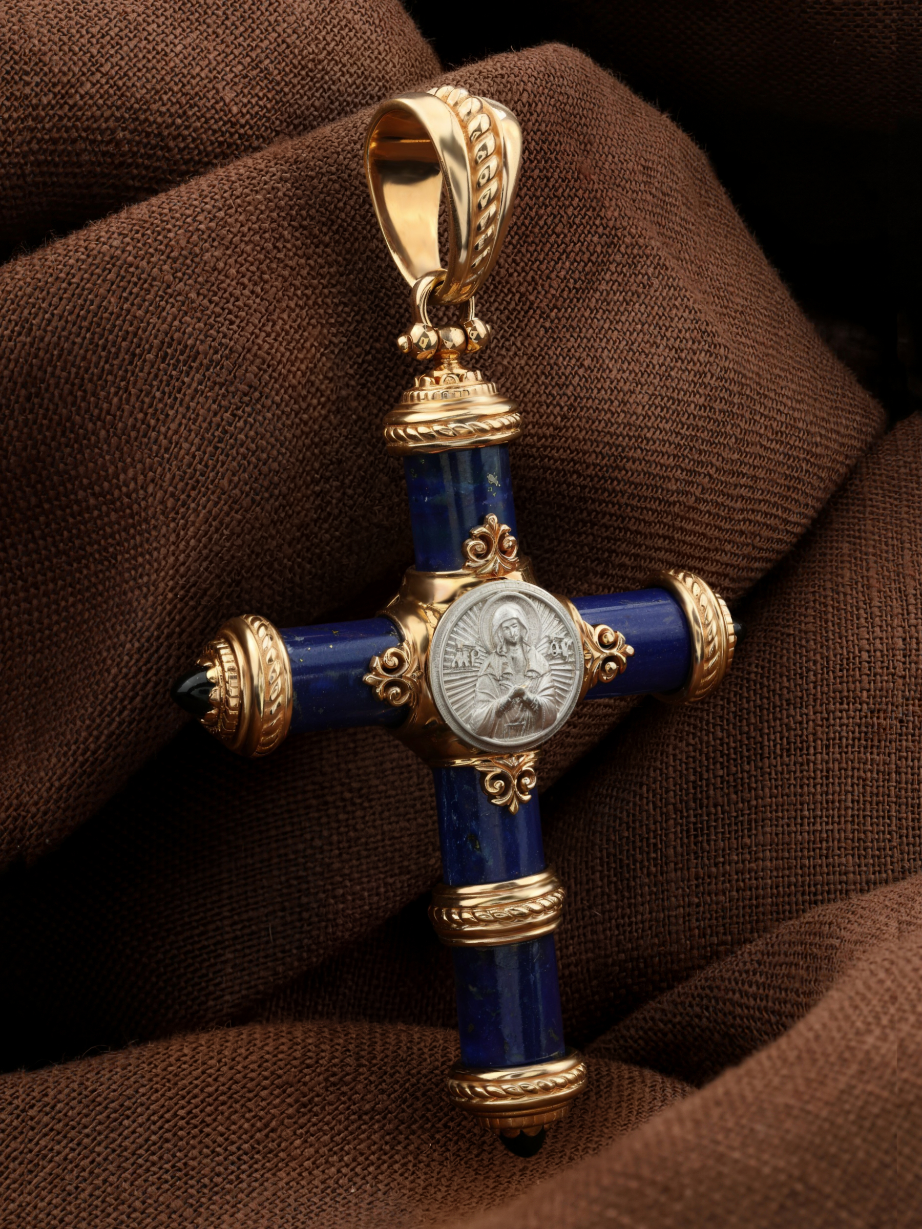 В центральной части оборотной стороны креста изображена икона Пресвятой Богородицы «Умиление» или «Радость всех радостей». Пресвятая Богородица запечатлена в самое счастливое мгновение, еще до рождения своего ребенка — Иисуса, но уже после Благовещения. Лик юной Девы Марии, с опущенными долу глазами и сложенными крестообразно на груди руками, выражает глубочайшее смирение. Икона принадлежала преподобному Серафиму Саровскому, была его келейной иконой. После смерти преподобного настоятель о. Нифонт отдал святую икону «Радость всех радостей» сестрам Дивеевской Серафимовской обители.