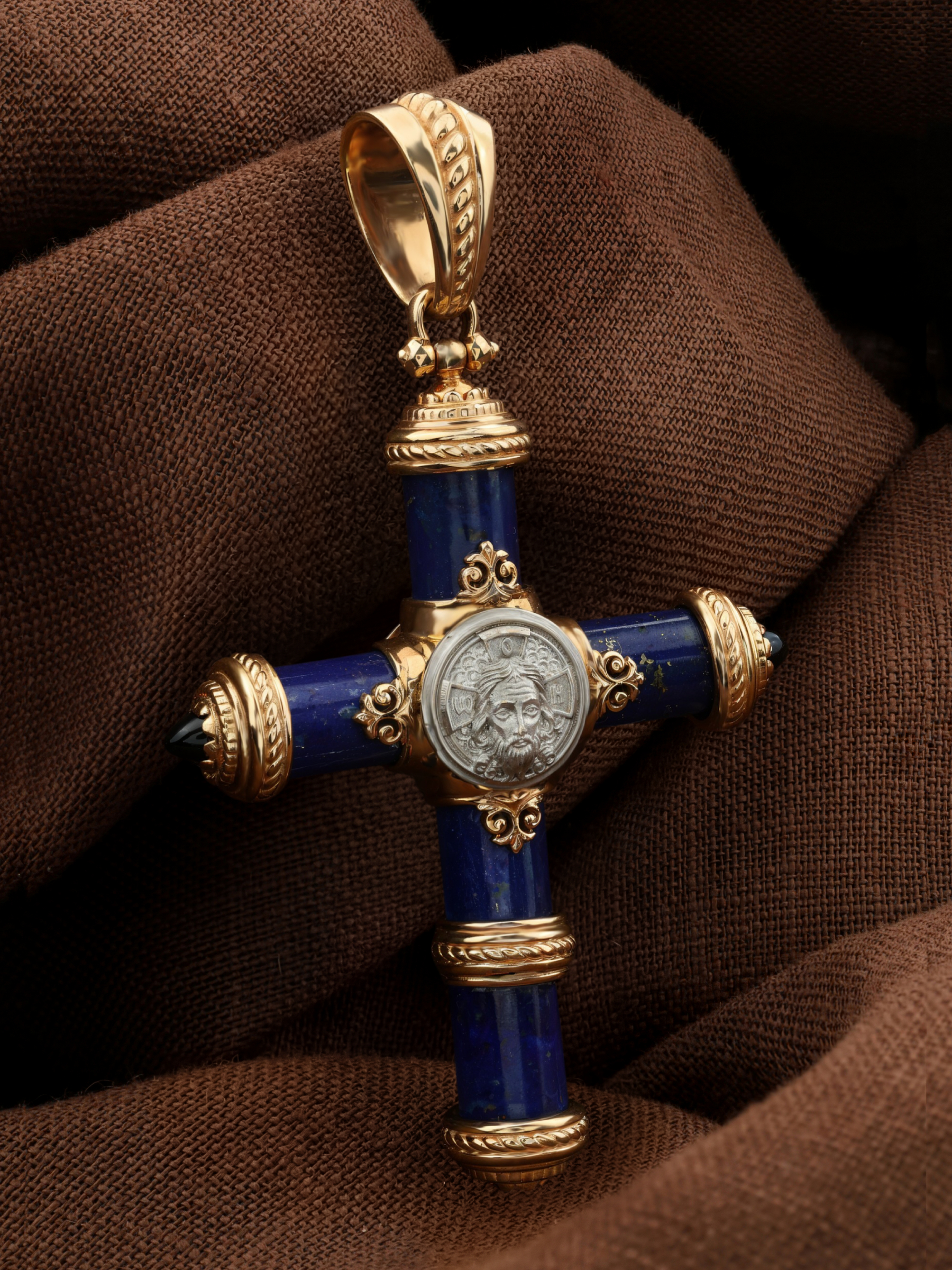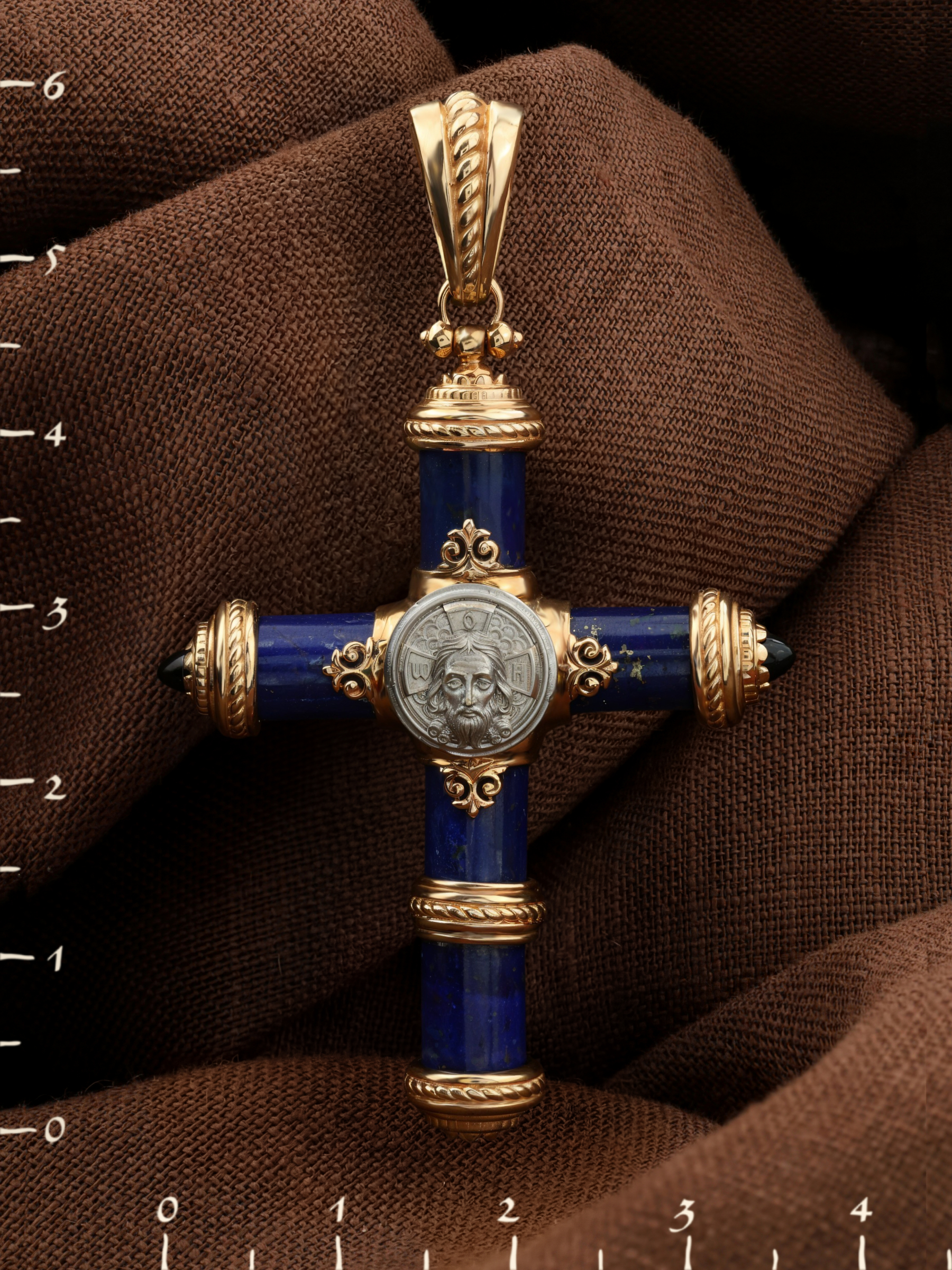 В центральной части лицевой стороны креста изображен Спас Нерукотворный — образ Господа и Спасителя нашего Иисуса Христа, чудесно отпечатавшийся на плате, котором Христос вытер свой лик. Согласно Преданию, изложенному в Четьи Минее, Авгарь V Ухама, больной проказой, послал ко Христу своего архивария Ханнана (Ананию) с письмо, в котором просил Христа прийти в Едессу и исцелить его. Ханнан же был художником, и Авгарь поручил ему, если Спаситель не сможет прийти, то написать хотя бы Его образ и принести ему. Видя, что Ханнан хочет сделать Его портрет, Христос потребовал воды, умылся, вытер Свой лик платом, и на этом плате отпечатался Его образ. Спаситель передал этот плат Ханнану с повелением отнести с ответным письмом пославшему его. Получив портрет, Авгарь исцелился от главного своего недуга, но лицо его оставалось еще поврежденным. После Пятидесятницы в Едессу пошёл святой апостол Фаддей, один из 70-ти, закончил исцеление Авгаря и обратил его в христианство. Авгарь прикрепил образ к доске и поместил в нише над городскими воротами, убрав оттуда находившегося там идола.