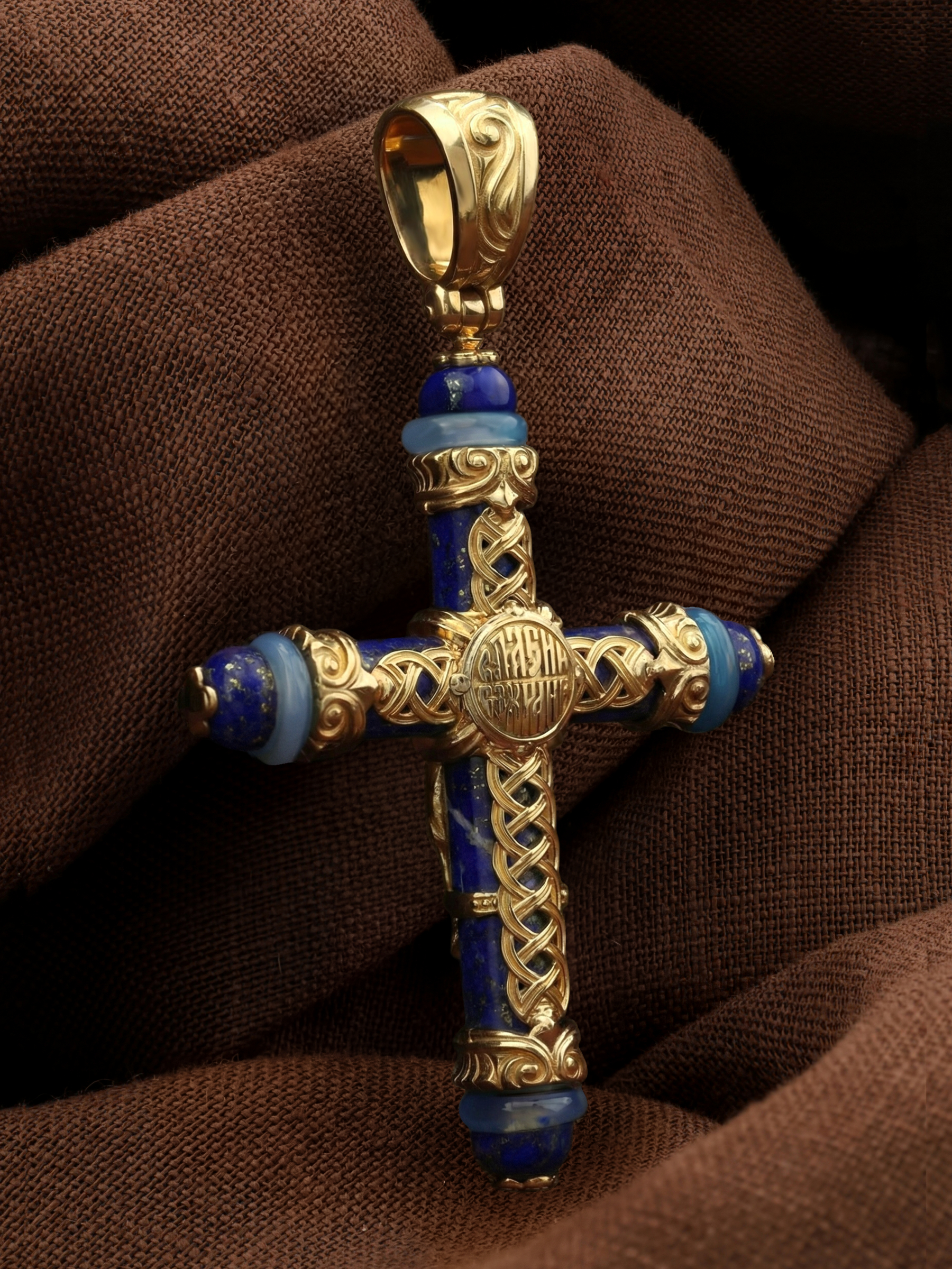 Крест из лимонного золота c агатом и лазуритом