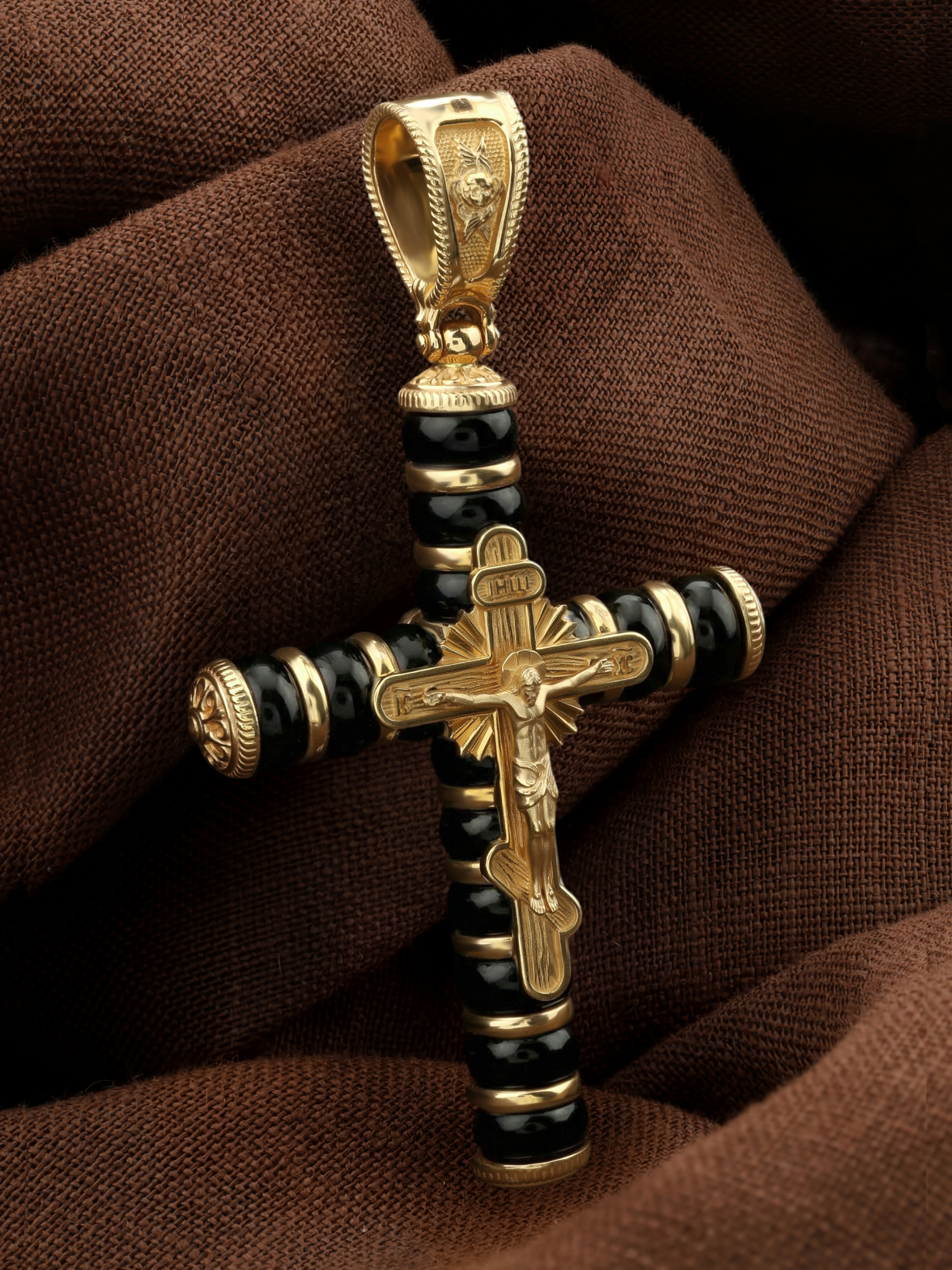 На лицевой стороне креста изображено Распятие Господа и Спасителя нашего Иисуса Христа. Своими крестными страданиями Господь смыл наши грехи, покрыл наш долг перед Богом или, на языке Писания, нас «искупил». В Голгофе сокрыта непостижимая тайна бесконечной правды и любви Бога. Крест стал символом победы добра над злом, жизни над смертью, напоминанием бесконечной Божьей любви, предметом радости. Воплотившийся Сын Божий Своею кровью освятил крест и сделал его проводником Своей благодати, источником освящения верующих. Господь сказал: кто хочет идти за Мною, отвергнись себя, и возьми крест свой, и следуй за Мною. (Мк. 8: 34). На верхней табличке, выше головы Иисуса, расположена надпись, составленная Понтием Пилатом — «IНЦI». Она означает «Иисус Назорей, Царь Иудейский». Надпись «IC» «ХC», означает Иисус Христос, помещается на разных сторонах поперечной перекладины креста. На православном кресте Христос не умирает, а свободно простирает руки, ладони Иисуса открыты, будто он хочет обнять все человечество, даря им свою любовь и открывая путь к вечной жизни. На кулонном кольце изображен шестикрылый Ангел Серафим.