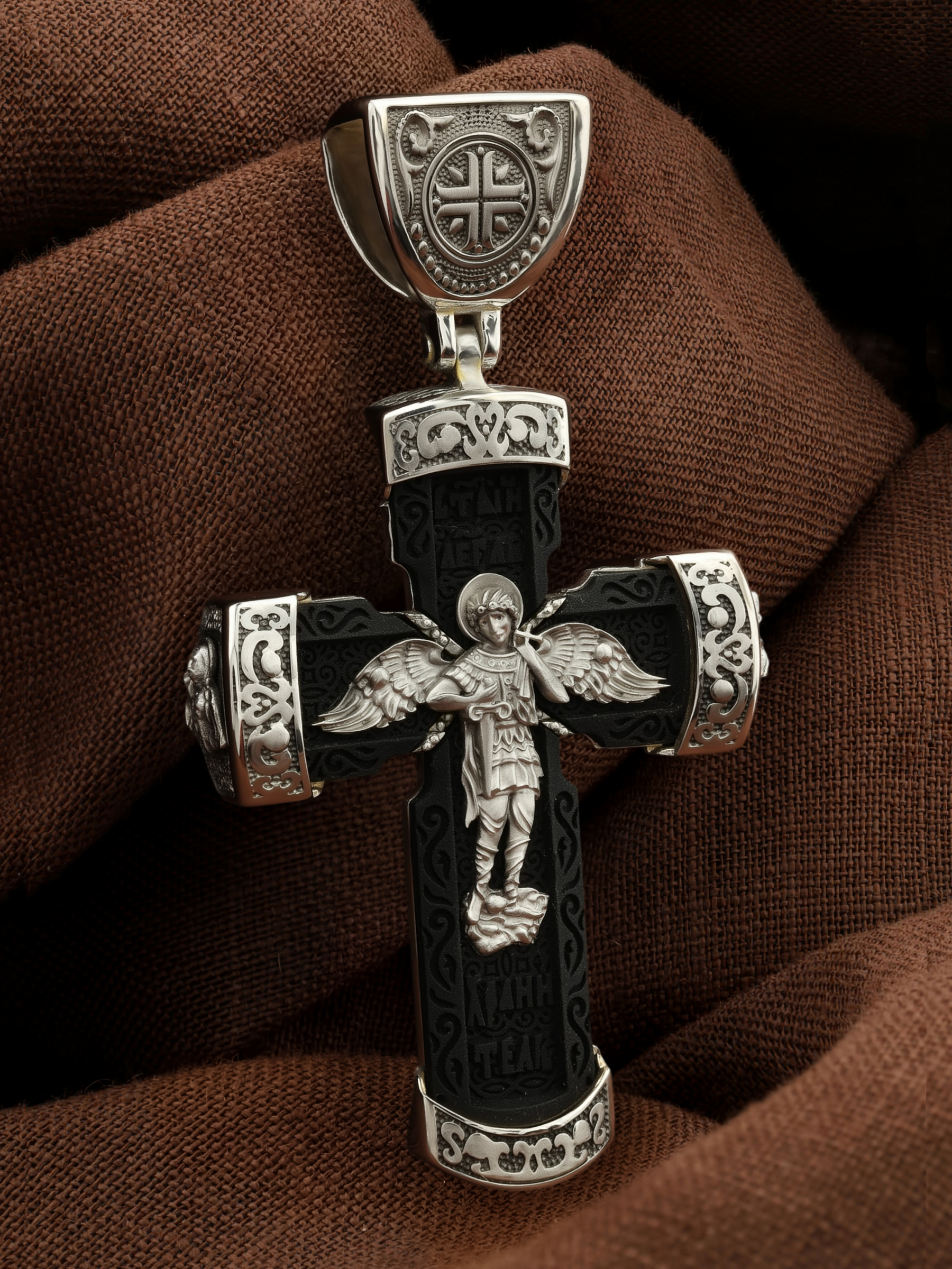 В центре оборота креста изображен Ангела Хранителя с традиционными атрибутами в руках: крестом, которым он осеняет человека, и мечом для прогнания бесов. По Православному учению, каждому, принявшему святое крещение, дается Господом Ангел Хранитель, который сопровождает человека всю его жизнь, помогая в добрых делах и охраняя от нападок злых духов. Святые отцы утверждают, что только верующий человек имеет рядом с собой Ангела Хранителя: «Тем, которые сподобились крещения и возносятся на высоту добродетелей, даны от Бога Ангелы, заботящиеся о них и содействующие им. В этом уверяет нас Господь, когда говорит, что есть Ангелы Хранители у всякого, кто верует в Него» (преп. Анастасий Синаит). Но Ангел Хранитель пребывает с христианином, если только мы не прогоним его греховными делами, поскольку «как дым разгоняет пчел, так и грех прогоняет от нас Ангела Хранителя» (свт. Василий Великий). Но и после завершения земного пути Ангел Хранитель не покидает христианина, а помогает душе преодолеть воздушные мытарства на пути в Царство Небесное.