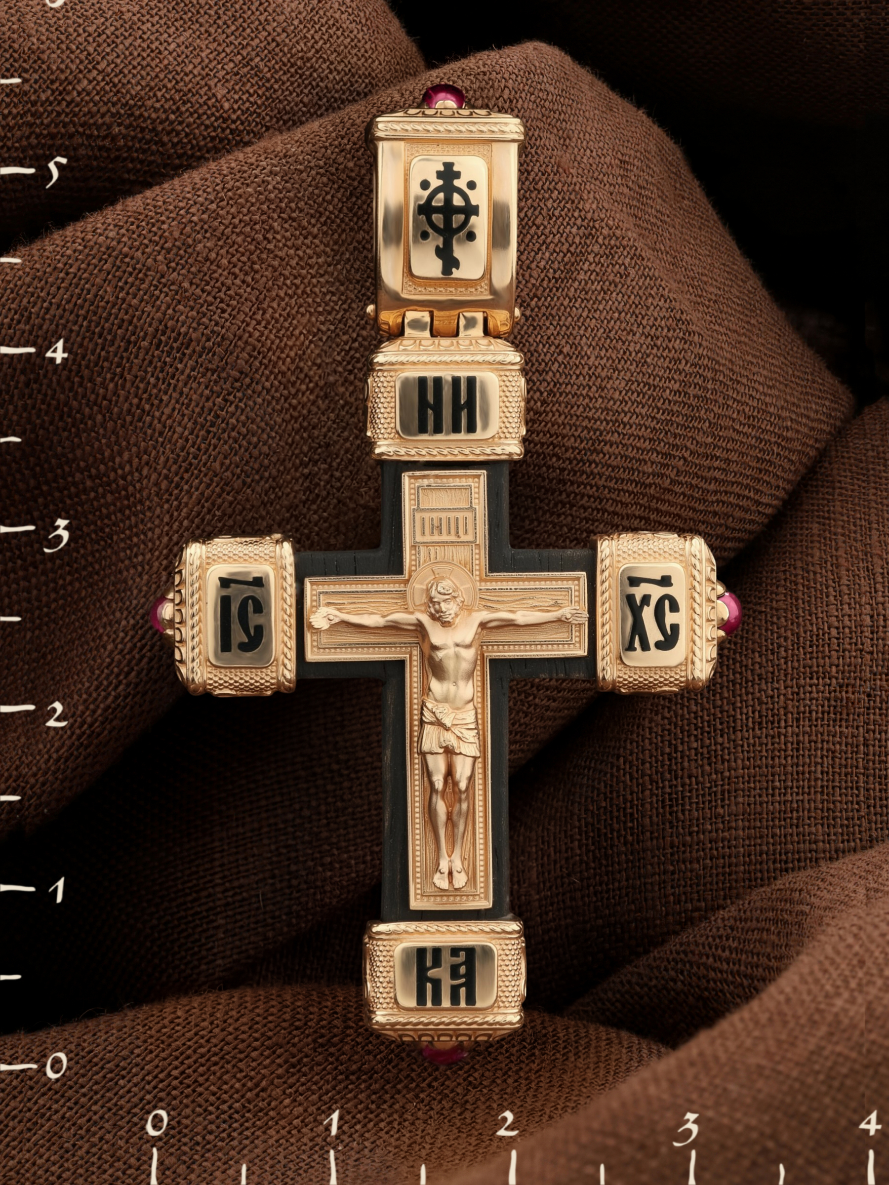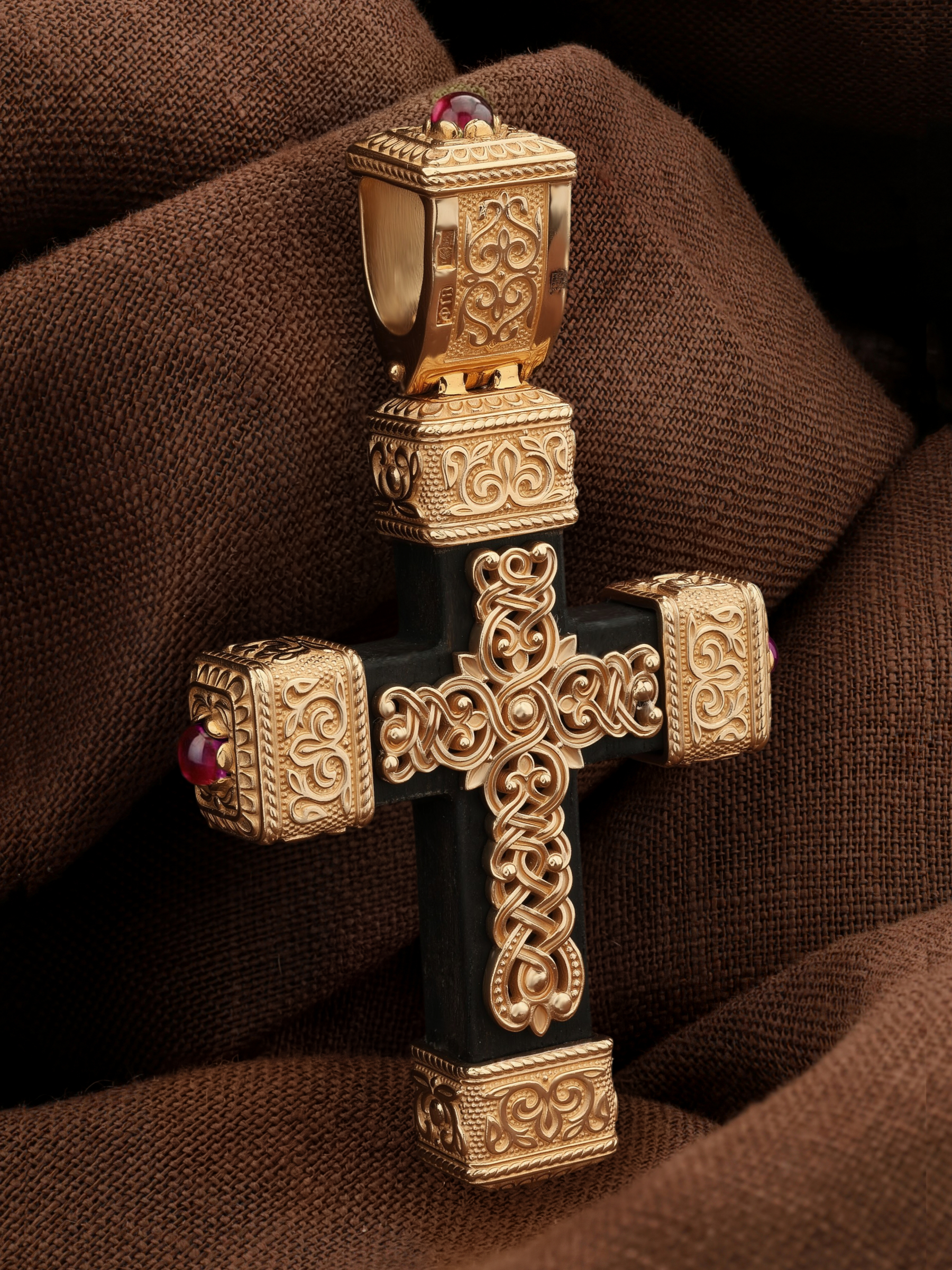 Крест из золота c эмалью, рубином и эбеновым деревом