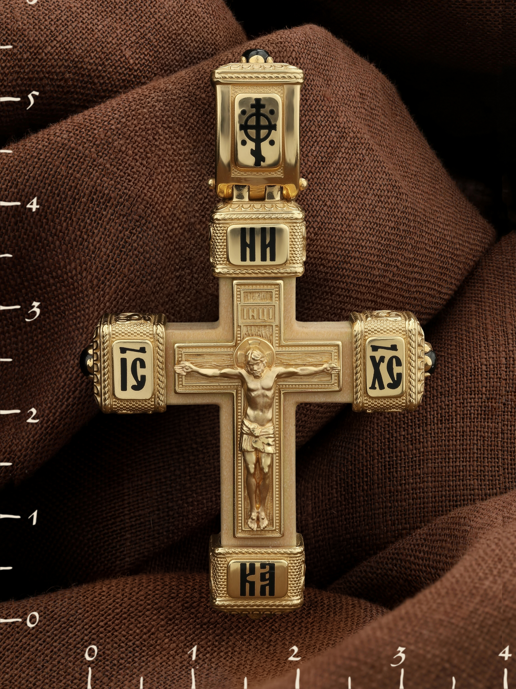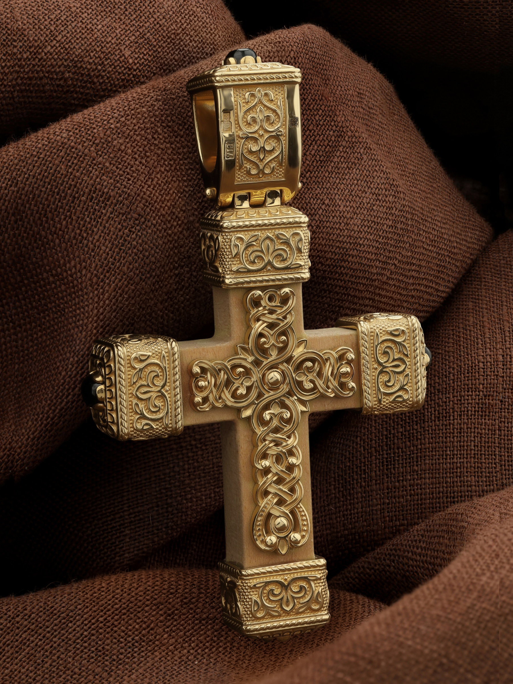 Крест из лимонного золота c эмалью, ониксом и деревом груши