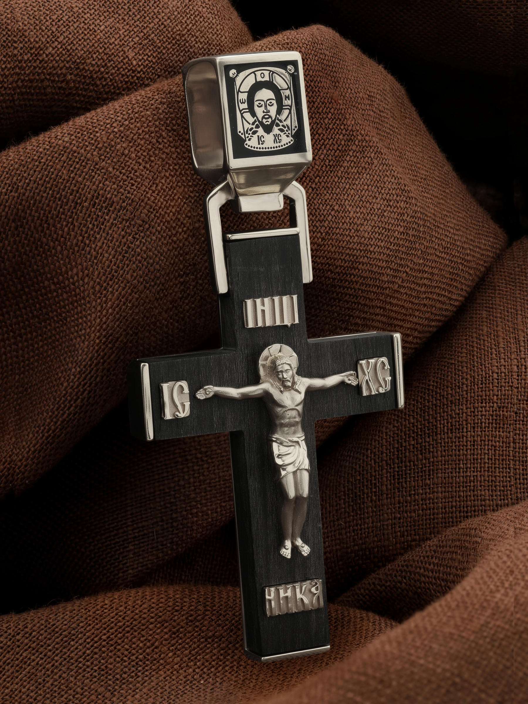 На лицевой стороне креста изображено Распятие Господа и Спасителя нашего Иисуса Христа. Своими крестными страданиями Господь смыл наши грехи, покрыл наш долг перед Богом или, на языке Писания, нас «искупил». В Голгофе сокрыта непостижимая тайна бесконечной правды и любви Бога. Крест стал символом победы добра над злом, жизни над смертью, напоминанием бесконечной Божьей любви, предметом радости. Воплотившийся Сын Божий Своею кровью освятил крест и сделал его проводником Своей благодати, источником освящения верующих. На верхней табличке, выше головы Иисуса, расположена надпись, составленная Понтием Пилатом — «IНЦI». Она означает «Иисус Назорей, Царь Иудейский». Надпись «IC» «ХC», означает Иисус Христос, помещаются на разных сторонах поперечной перекладины креста. Христос в Своей Божественной любви, над которой смерть не властна и которая, страдая, и не страдает в обычном смысле, простирает к людям со Креста Свои объятия, в которые призывается и привлекается весь мир. Поэтому Тело Его не висит, а торжественно покоится на Кресте.