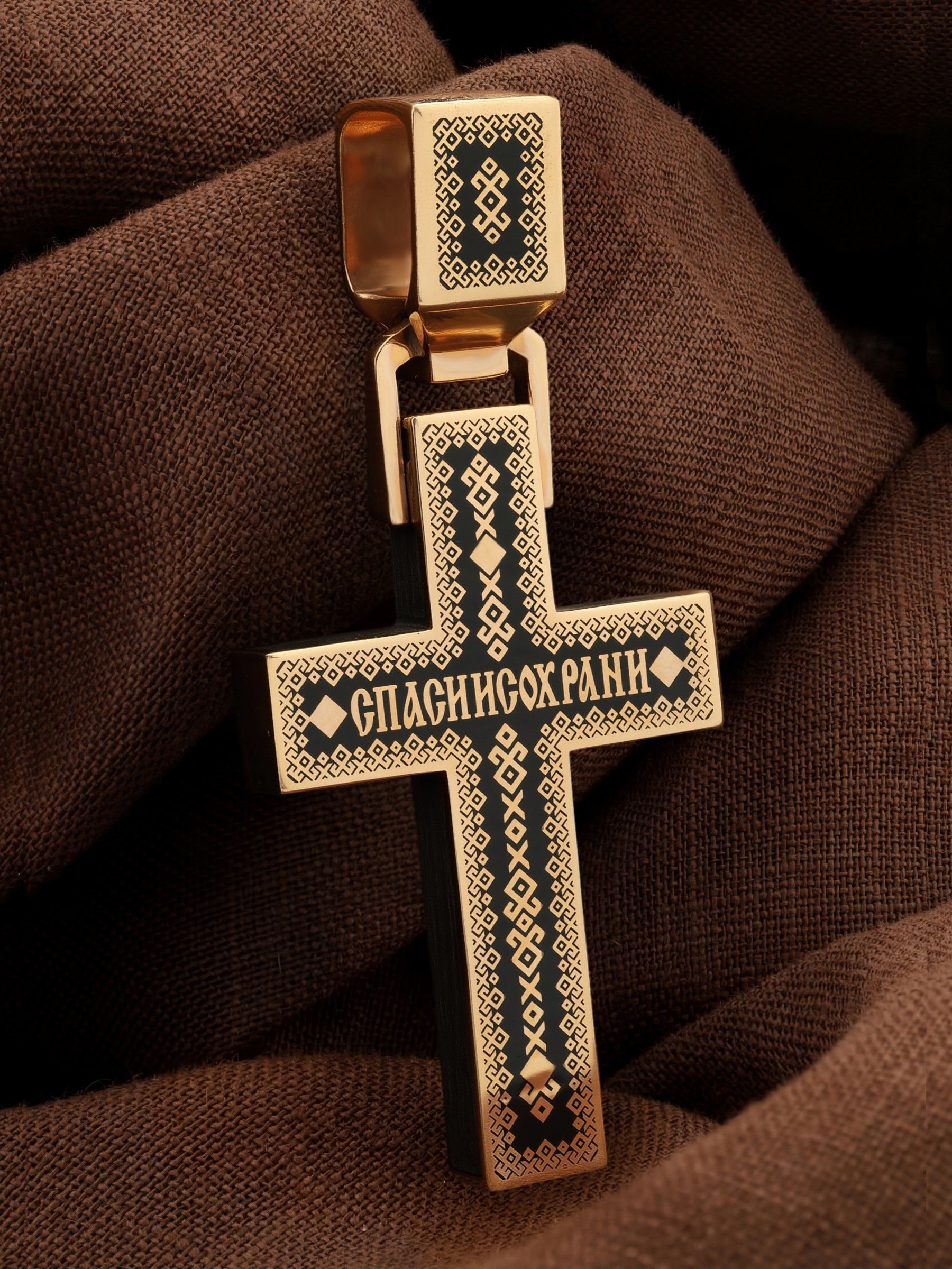 На оборотной стороне креста размещены слова молитвы: «Спаси и сохрани». Крест украшен орнаментом.