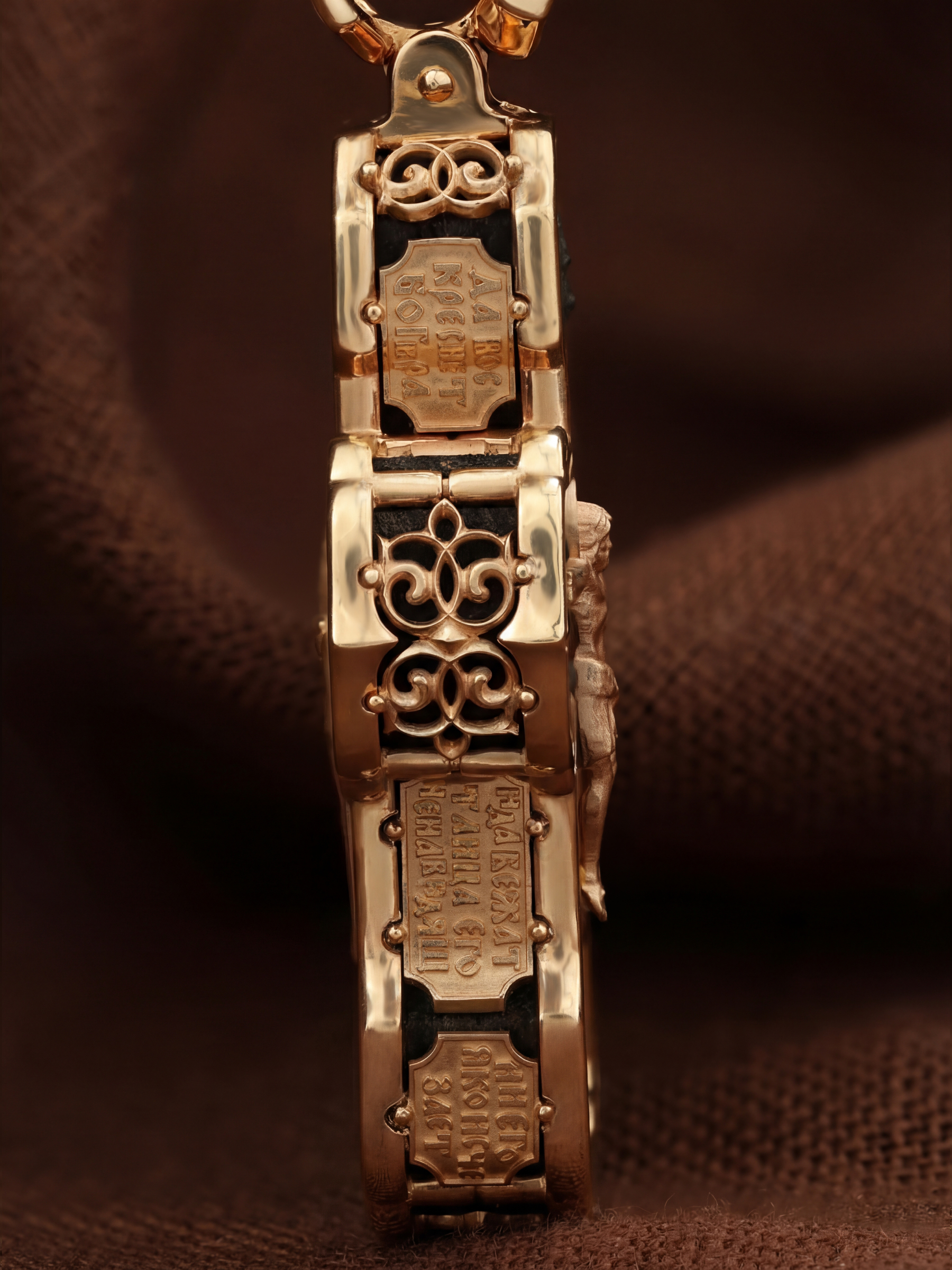 На лицевой стороне креста изображено Распятие Господа и Спасителя нашего Иисуса Христа. Крест- символ спасения и искупления рода человеческого, знамение победы над смертью и адом. Иисус Христос, как искупительная жертва освобождения человечества от власти греха, умер крестной смертью и в третий день воскрес. На верхней табличке, выше головы Иисуса, расположена надпись, составленная Понтием Пилатом — «IНЦI». Она означает «Иисус Назорей, Царь Иудейский». Надпись «IС» « ХС» означает Иисус Христос и помещается на разных сторонах поперечной (большой) перекладины креста. Рядом расположена надпись «Сын Божий». Выше Распятия изображен Нерукотворный образ Господа и Спасителя нашего Иисуса Христа. Слева от Распятия изображена Пресвятая Богородица, справа — апостол и евангелист Иоанн Богослов, один из ближайших учеников Иисуса Христа. Крест стоит на горе камней, символизирующих Голгофу. В ее основании различается череп — это голова Адама. Вдоль креста изображены копие сотника Лонгина и трость с губкой и буквы «К» и «Т». Надпись «МЛРБ» — «место лобное рай бысть» означает, что место лобное стало раем и помещаются в нижней части креста. Рядом — слово «НИКА», что означает «победитель». На православном кресте Христос не умирает, а свободно простирает руки, ладони Иисуса открыты, будто он хочет обнять все человечество, даря им свою любовь и открывая путь к вечной жизни. На кулонном кольце изображен шестикрылый Серафим.