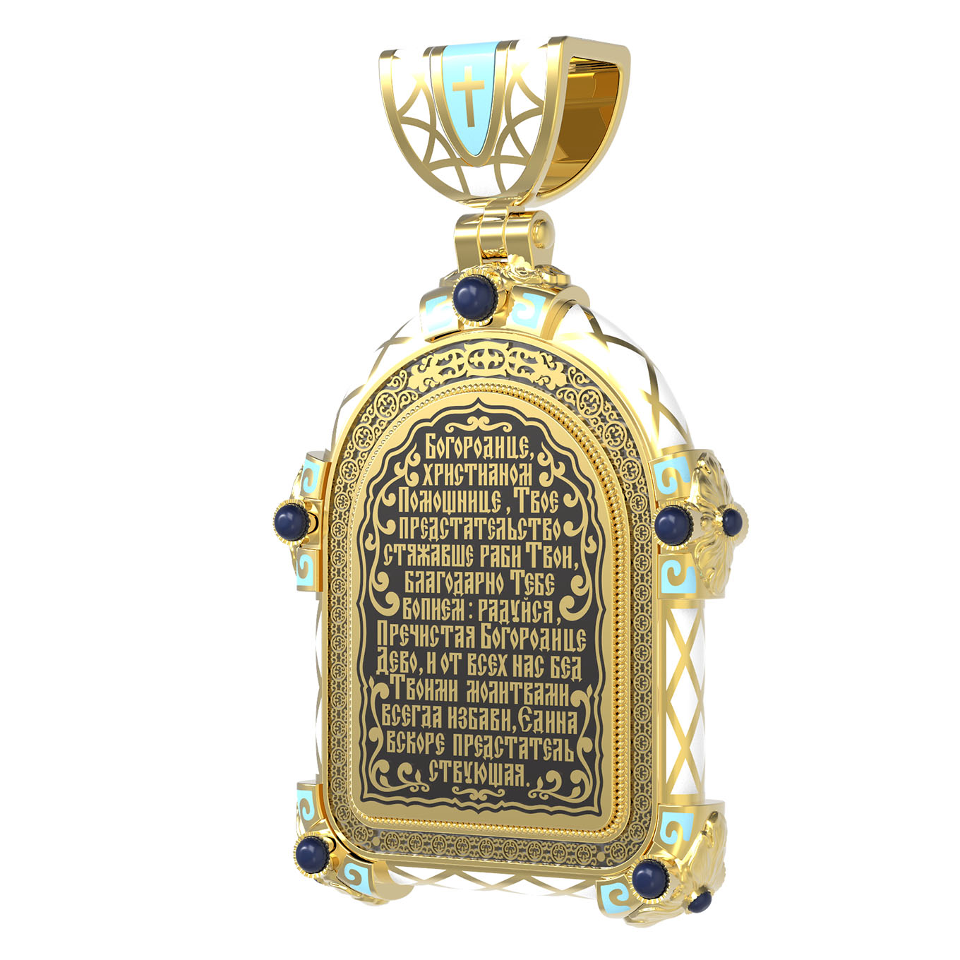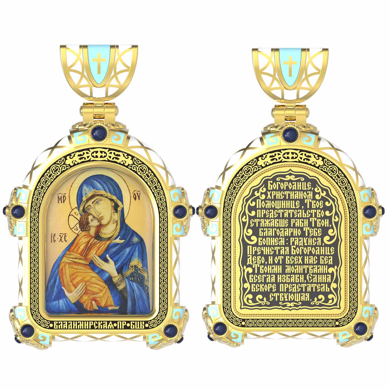 На лицевой стороне образка изображена Владимирская икона Божией Матери — одна из самых чтимых святынь Русской православной церкви. По преданию, икона была написана Святым апостолом и евангелистом Лукой во время земной жизни Богородицы. Дева Мария, увидев Свое изображение, молвила: «Отныне ублажат Мя вси роди. Благодать Рождшегося от Меня и Моя с сим образом да будет». Образ написан в лирическом иконографическом типе «Умиление». Младенец припал щекой к щеке Матери и тянется к ней правой рукой, другой нежно обнимая за шею. Икона вплоть до V века находилась в Иерусалиме, затем была перевезена в Византию. На Русь икона была привезена в 1131 г. За прошедшие столетия святыня неоднократно переезжала из Владимира в Москву и обратно, не раз спасая страну от захватчиков. Русская Православная Церковь установила троекратное празднование Владимирской иконе Божьей Матери. Каждый из дней празднования связан с избавлением русского народа от порабощения иноплеменниками по молитвам ко Пресвятой Богородице. В последующие века у иконы происходили многие важные исторические события: подписание актов, принятие присяги значимых государственных деятелей и возведение на престол. На кулонном кольце изображен Спас Нерукотворный — образ Господа и Спасителя нашего Иисуса Христа, чудесно отпечатавшийся на плате, котором Христос вытер свой лик.