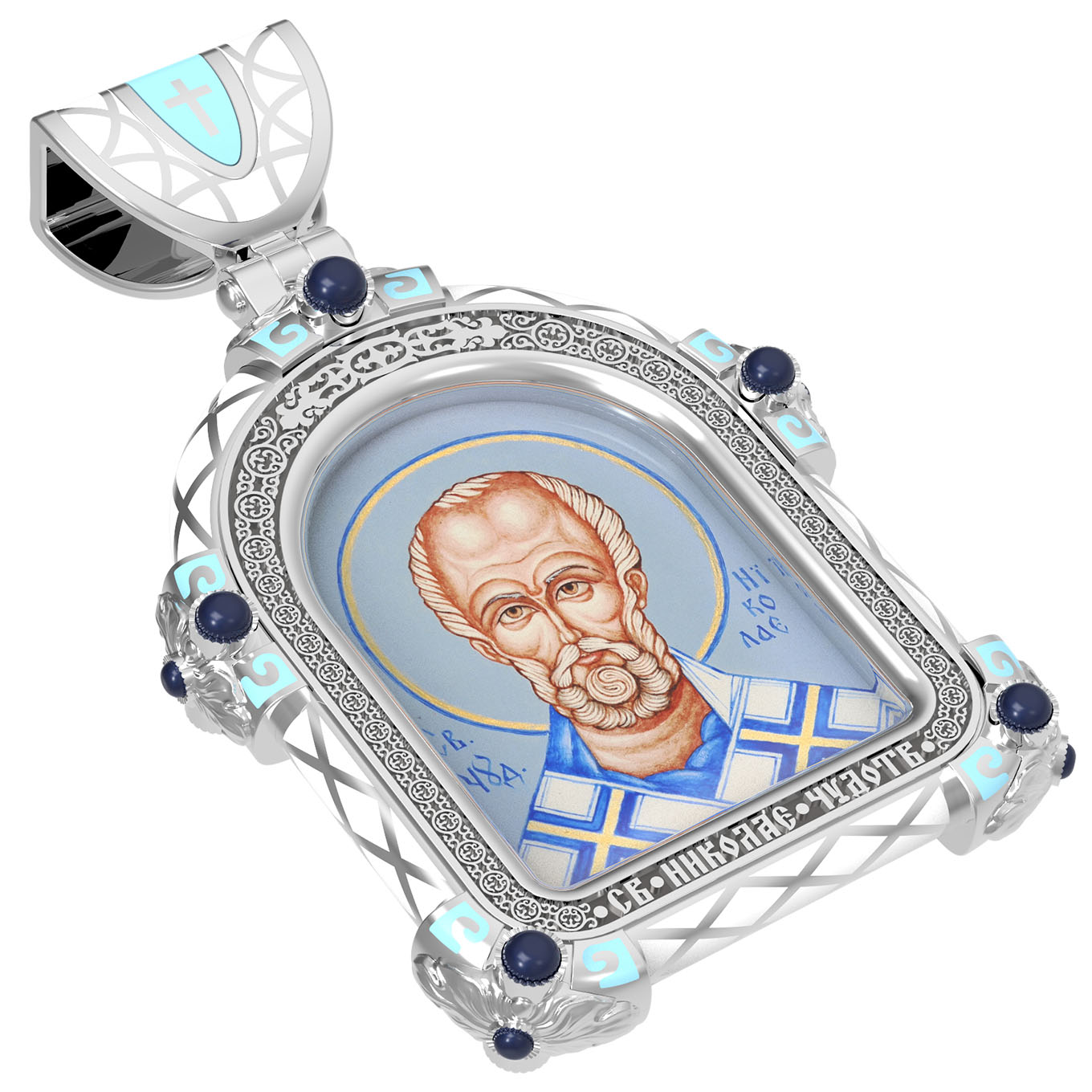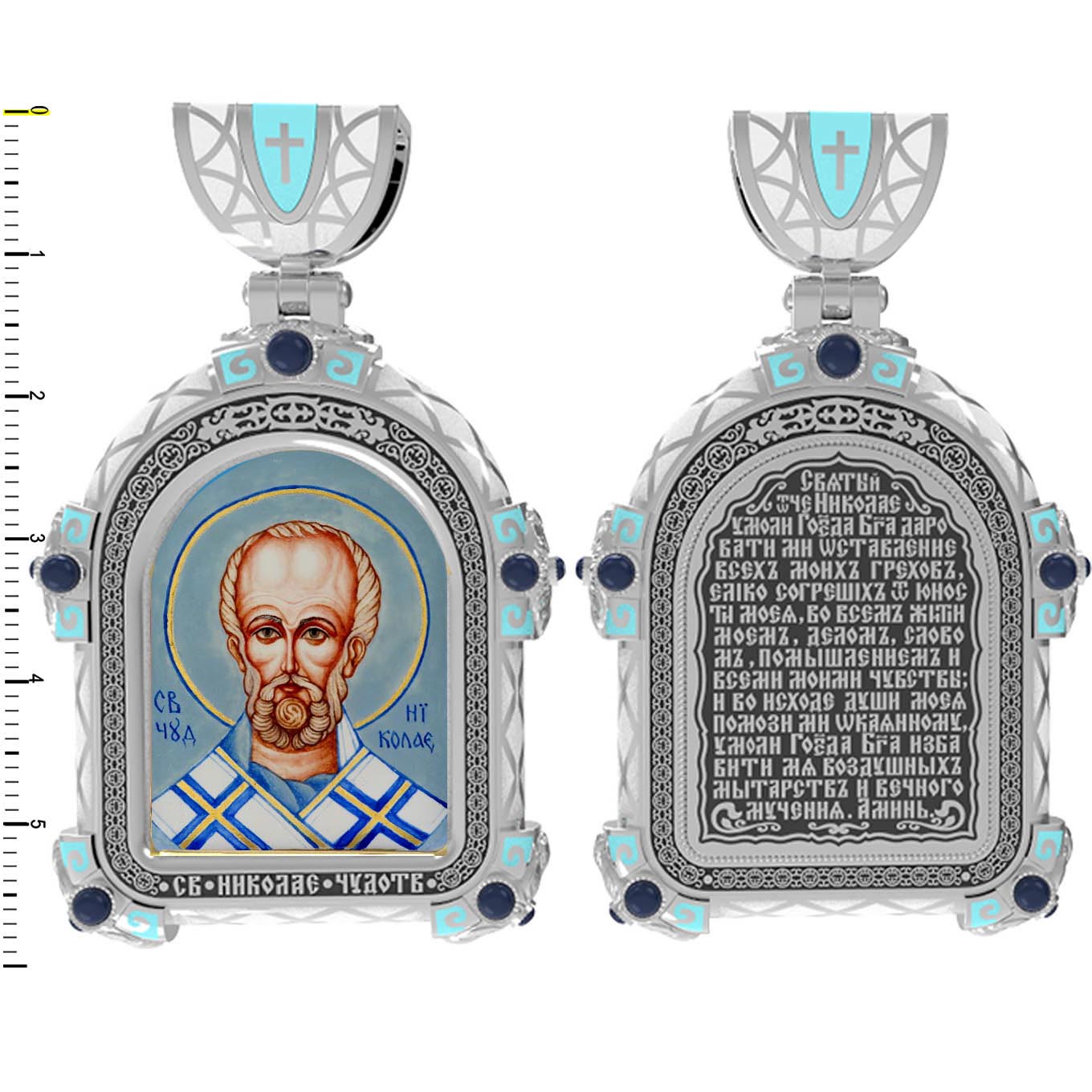 На лицевой стороне образка изображен Святитель Николай архиепископ Мир Ликийских, Чудотворец. Он является одним из самых известных на Руси святых, издревле считающийся помощником и молитвенником за всех, притекающих к нему. Чудес его исчислить невозможно. Николай Чудотворец подавал многим исцеления в болезнях и телесных недугах, обогащал бедствующих в крайней нищете, подавал голодным пищу, спасал от потопления, освобождал из плена и избавлял от смерти.