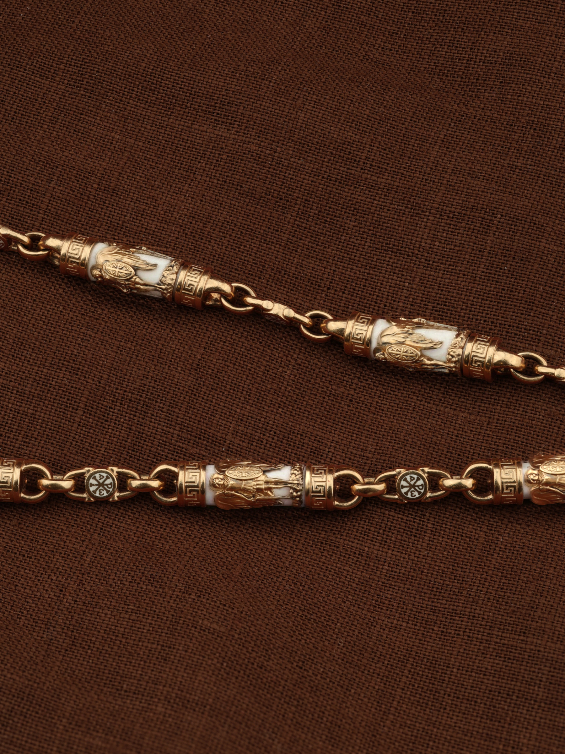 На звеньях цепи изображена Хризма — монограмма имени Христа, которая состоит из двух начальных греческих букв имени  — Х (хи) и Р (ро), скрещённых между собой. По краям монограммы помещены греческие буквы a и w. Такое употребление этих букв восходит к тексту Апокалипсиса: «Аз есмь Альфа и Омега, начало и конец, говорит Господь, Который есть и был и грядет, Вседержитель.» (Откр. 1:8; см. также Откр. 22:13). Также на звеньях изображен Святой Ангел-Хранитель в виде прекрасного юноши держащего в правой руке мечь, а в левой — щит. Ангел-Хранитель — это Ангел приставляемый Богом к человеку при крещении для охраны и помощи в добрых делах. Он невидимо находится при человеке на протяжении всей его жизни, если человек сохраняет в себе любовь к Богу и истинную веру перед Ним. Ангел-Xранитель делают для нас все, что служит к истинному нашему благу и спасению. Невидимо пребывая при нас постоянно, он, руководствуя нас ко спасению, не только по нашему желанию таинственно наставляет нас на все доброе и полезное, не только возносит наши молитвы к Богу, но еще и сам от себя охраняют и защищают нас от врагов видимых и невидимых и ходатайствует за нас пред Богом. Ангел-Хранитель так любит нас, как никто на земле любить не может. Одного лишь каждому из нас он желает — спасения души; к этому он направляет все свои заботы. И если видит нас также заботящимися о спасении, радуется, если же видит нас пребывающими в нерадении о душе своей, скорбит. Но и самый великий грешник может примириться со своим Ангелом-Хранителем посредством искреннего раскаяния в грехах и оставления их навсегда. В таком случае, по слову Писания, великая радость бывает для всех ангелов на небесах (Лк. 15:10). Цепь украшена орнаментом.