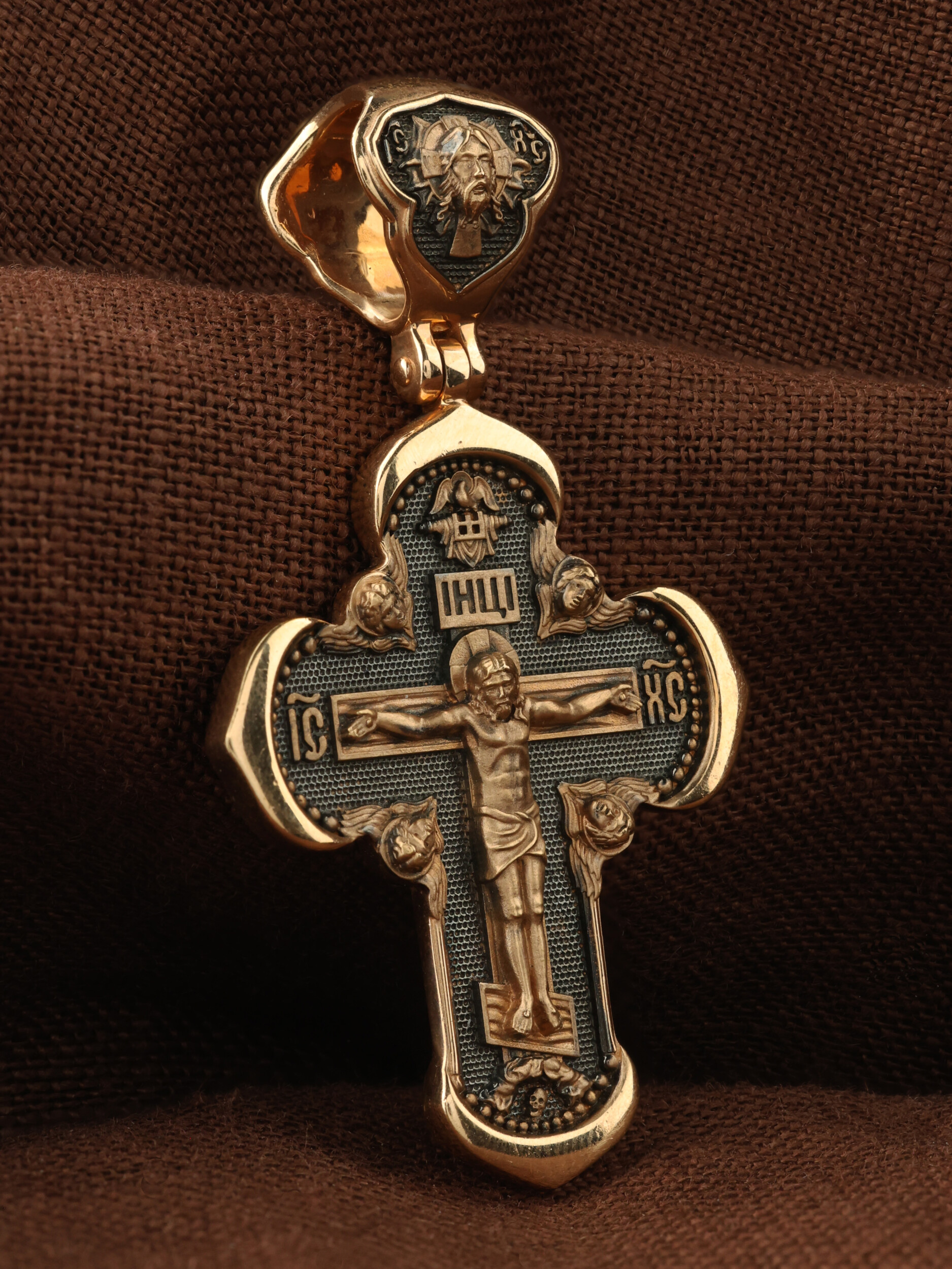 Под подножием Креста изображена покоящаяся голова (череп) Адама. Вокруг Распятия помещены изображения На лицевой стороне креста изображено Распятие Господа и Спасителя нашего Иисуса Христа. Крест- символ спасения и искупления рода человеческого, знамение победы над смертью и адом. Иисус Христос, как искупительная жертва освобождения человечества от власти греха, умер крестной смертью и в третий день воскрес. На верхней табличке, выше головы Иисуса, расположена надпись, составленная Понтием Пилатом — «IНЦI». Она означает «Иисус Назорей, Царь Иудейский». Надпись «IС» « ХС» означает Иисус Христос и помещается на разных сторонах поперечной перекладины креста. Возвышение, на котором стоит Крест, символизирует гору Голгофу, на которой произошло Распятие. Ангелов Серафимов. На кулонном кольце изображен Нерукотворный образ Господа и Спасителя нашего Иисуса Христа, чудесно отпечатавшийся на плате, котором Христос вытер свой лик.