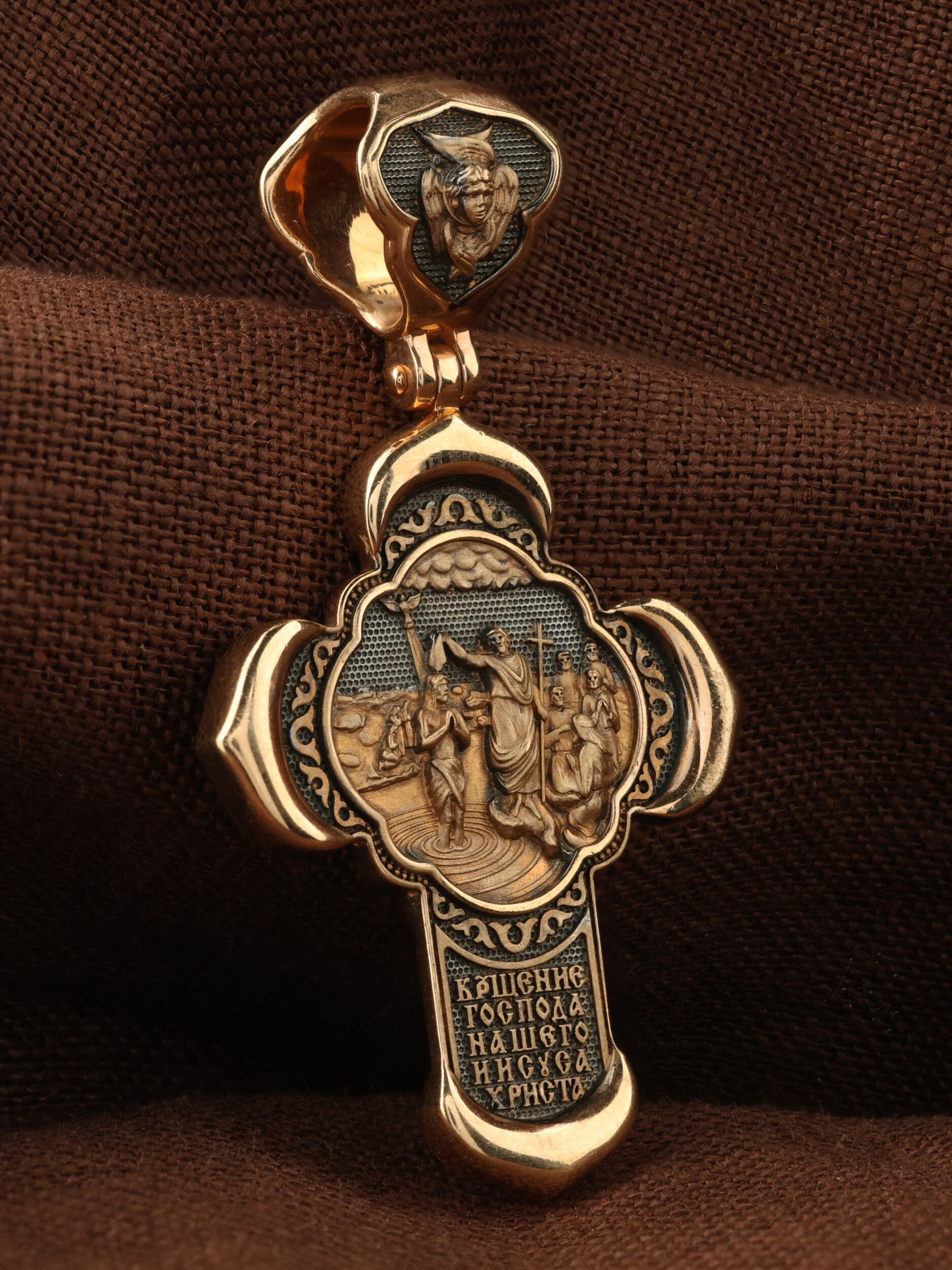 На оборотной стороне креста изображено Крещение Господа и Спасителя нашего Иисуса Христа, которое он принял в водах реки Иордан от Иоанна Предтечи. После крещения, когда Христос вышел из воды, вдруг разверзлись небеса. Дух Святой в образе голубя, осеняя Божественным светом, опустился на Иисуса и с неба раздалось: «Сей есть Сын Мой возлюбленный, в котором Мое благоволение» (Мф. 3,16−17). Погрузившись в воды Иордана, Господь освятил воду и сделал ее способной омывать человеческие грехи.