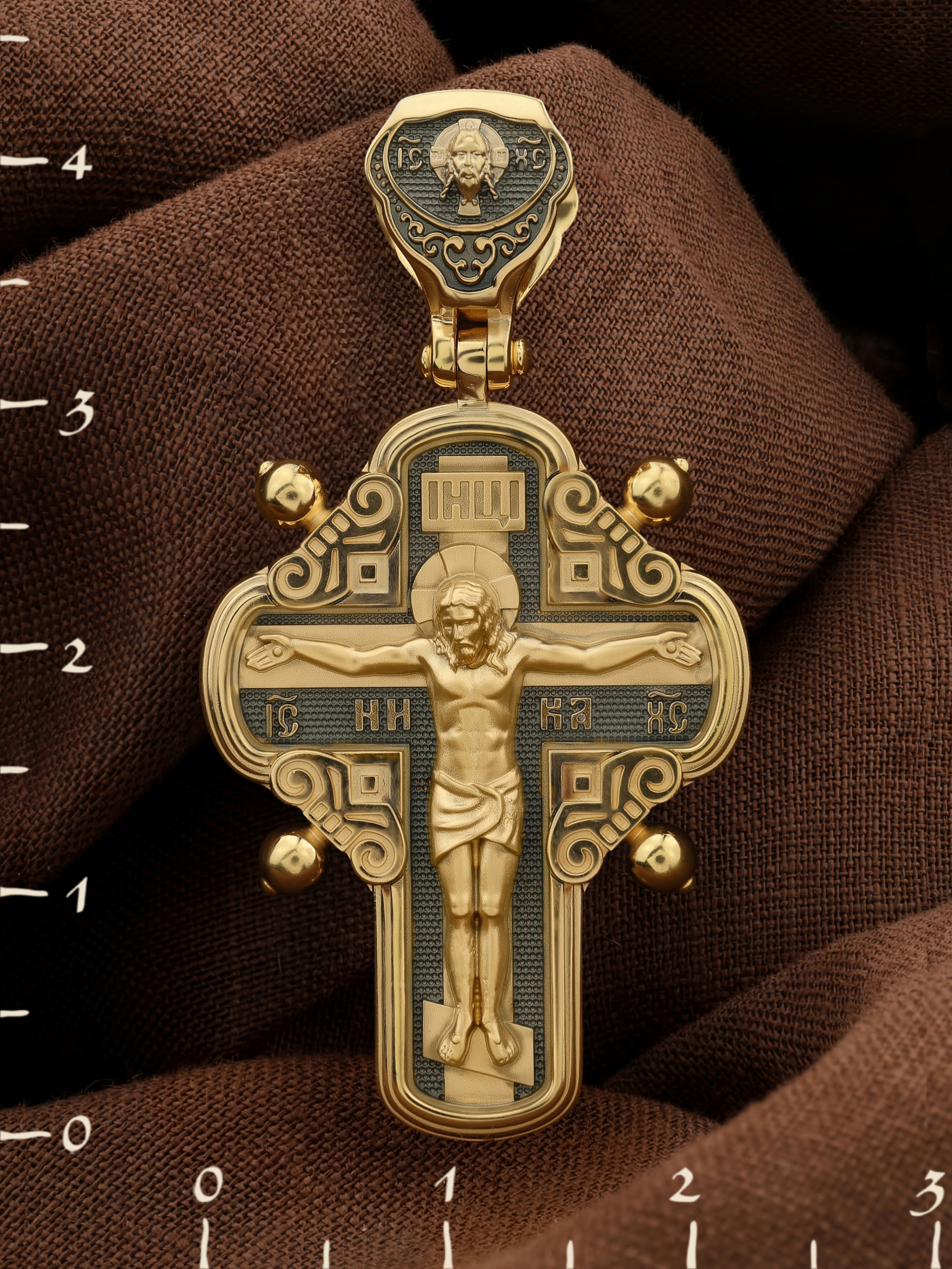 На лицевой стороне креста изображено Распятие Господа и Спасителя нашего Иисуса Христа, отдавшего Себя на смерть, для искупления грехов мира. Крест является символом жертвенной любви Всеблагого Бога к падшим людям, всепобеждающим духовным оружием христиан, основанием и средоточием церковной жизни. Господь сказал: кто хочет идти за Мною, отвергнись себя, и возьми крест свой, и следуй за Мною. (Мк. 8: 34). На верхней табличке, выше головы Иисуса, расположена надпись, составленная Понтием Пилатом — «IНЦI». Она означает «Иисус Назорей, Царь Иудейский». Надпись «IC» «ХC», означает Иисус Христос, помещается на разных сторонах поперечной перекладины креста. Рядом — слово «НИКА», что означает «победитель». На кулонном кольце изображен Нерукотворный образ Господа и Спасителя нашего Иисуса Христа, чудесно отпечатавшийся на плате, котором Христос вытер свой лик.