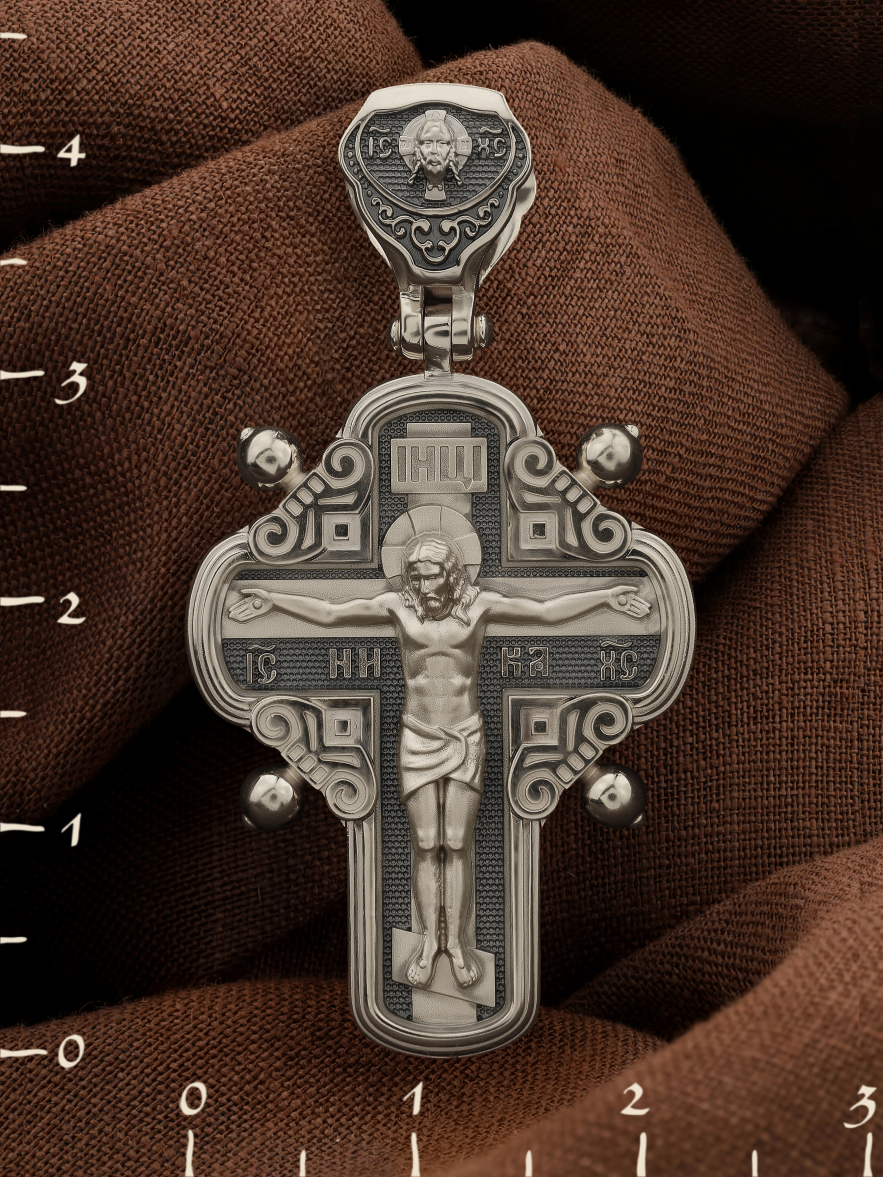 На лицевой стороне креста изображено Распятие Господа и Спасителя нашего Иисуса Христа, отдавшего Себя на смерть, для искупления грехов мира. Крест является символом жертвенной любви Всеблагого Бога к падшим людям, всепобеждающим духовным оружием христиан, основанием и средоточием церковной жизни. Господь сказал: кто хочет идти за Мною, отвергнись себя, и возьми крест свой, и следуй за Мною. (Мк. 8: 34). На верхней табличке, выше головы Иисуса, расположена надпись, составленная Понтием Пилатом — «IНЦI». Она означает «Иисус Назорей, Царь Иудейский». Надпись «IC» «ХC», означает Иисус Христос, помещается на разных сторонах поперечной перекладины креста. Рядом — слово «НИКА», что означает «победитель». На кулонном кольце изображен Нерукотворный образ Господа и Спасителя нашего Иисуса Христа, чудесно отпечатавшийся на плате, котором Христос вытер свой лик.