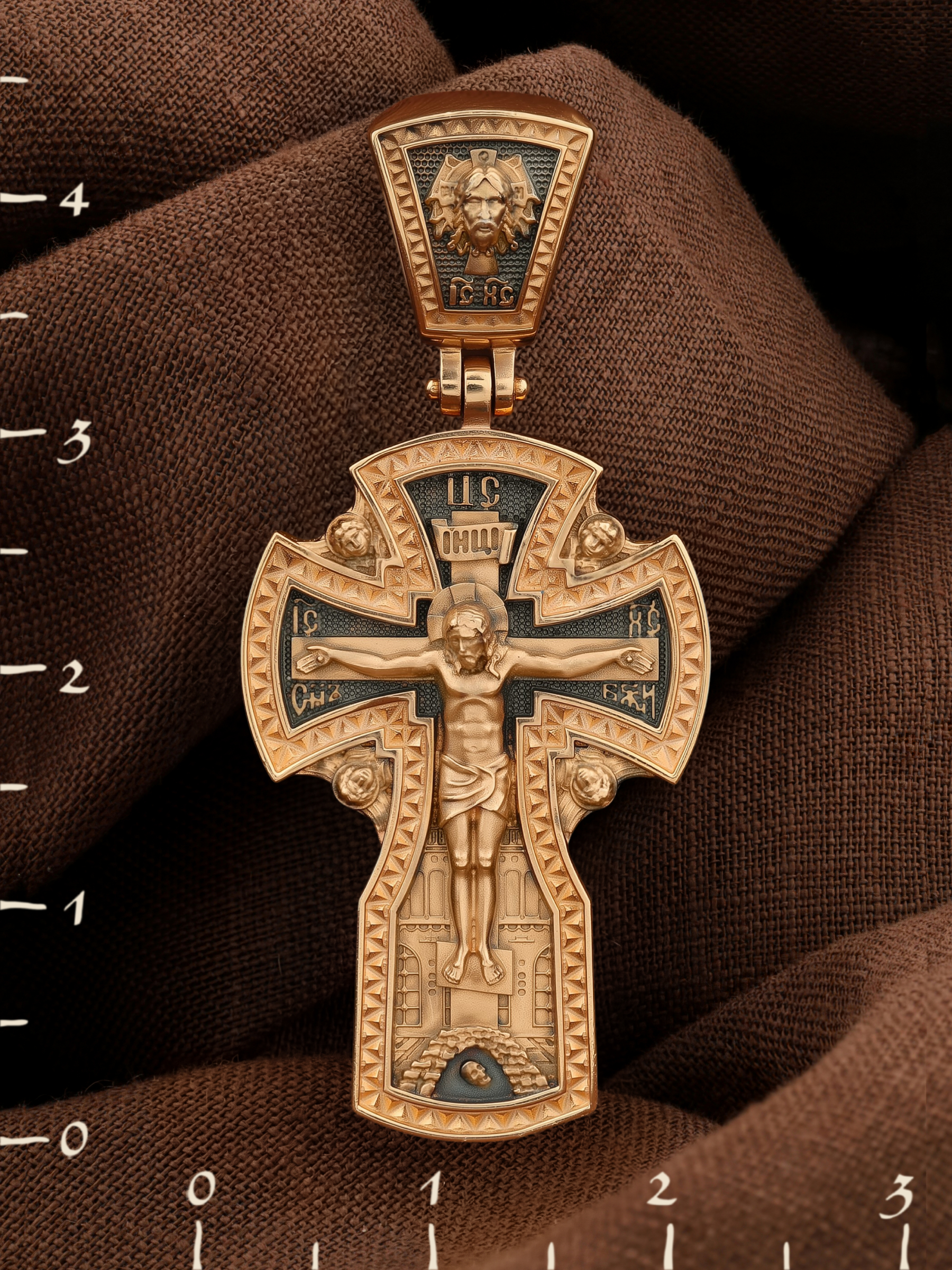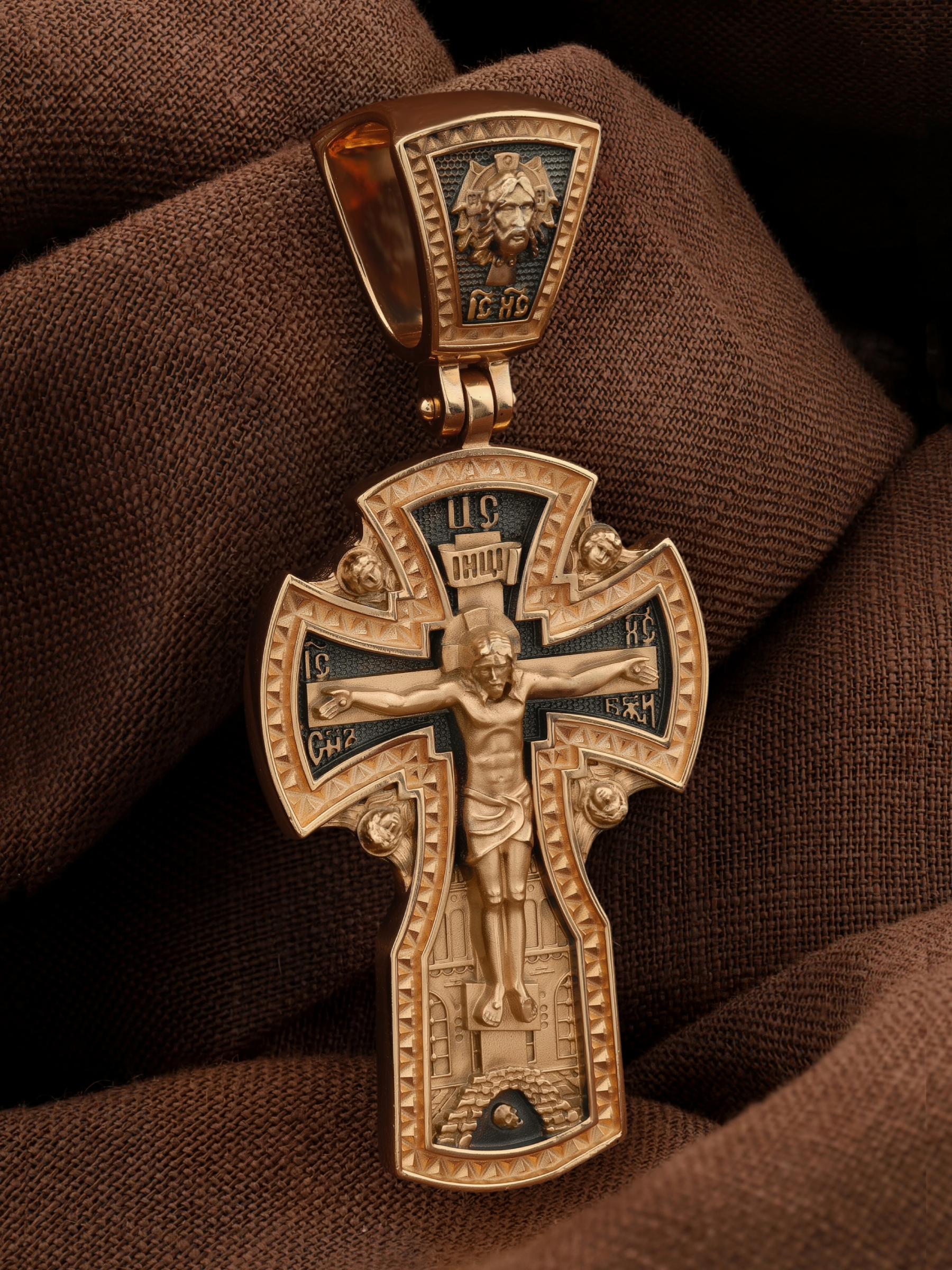 На лицевой стороне креста изображено Распятие Господа и Спасителя нашего Иисуса Христа, отдавшего Себя на смерть, для искупления грехов мира. Крест является символом жертвенной любви Всеблагого Бога к падшим людям, всепобеждающим духовным оружием христиан, основанием и средоточием церковной жизни. Господь сказал: кто хочет идти за Мною, отвергнись себя, и возьми крест свой, и следуй за Мною. (Мк. 8: 34). Над Распятием помещена надпись «Царь Славы». На верхней табличке, выше головы Иисуса, расположена надпись, составленная Понтием Пилатом — «IНЦI». Она означает «Иисус Назорей, Царь Иудейский». Надпись «IC» «ХC», означает Иисус Христос, помещается на разных сторонах поперечной перекладины креста. Рядом расположена надпись «Сын Божий». За крестом высится Иерусалимская стена, в знак того, что Господь был распят вне стен города. Возвышение, на котором стоит Крест, символизирует гору Голгофу, на которой произошло Распятие. Под подножием Креста изображена покоящаяся голова (череп) Адама. На кулонном кольце изображен Нерукотворный образ Господа и Спасителя нашего Иисуса Христа, чудесно отпечатавшийся на плате, которым Христос вытер свой лик.