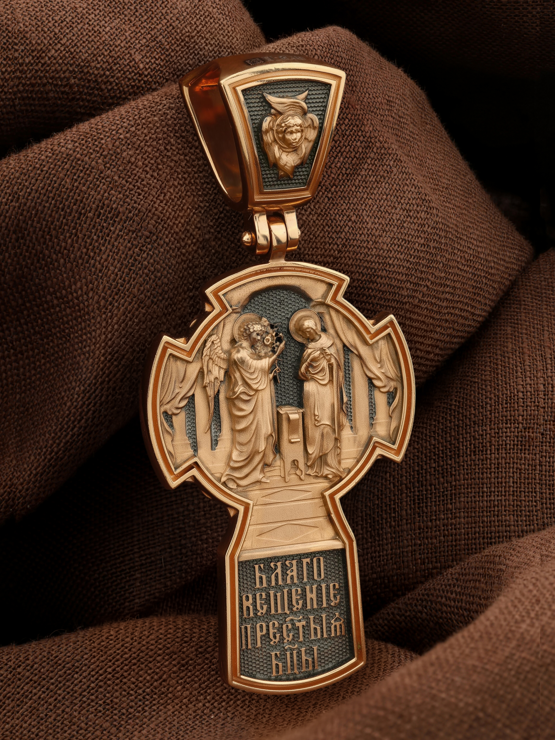 На оборотной стороне креста изображена икона «Благовещение Пресвятой Богородицы». Как нам повествует Священное Писание, Архангел Гавриил послан был от Бога в город Назарет к Пресвятой Деве Марии с радостной вестью, что Господь избрал Ее быть Матерью Спасителя мира. Ангел сказал: «Радуйся благодатная! Господь с Тобою! Благословенна Ты между женами». Мария cмутилась от слов Ангела и думала: что значит это приветствие? Ангел же продолжал говорить Ей: «не бойся, Мария, ибо Ты обрела благодать у Бога. И вот, Ты родишь Сына и наречешь имя Ему Иисус. Он будет велик, и назовется сыном Всевышнего, и Царству Его не будет конца…» На кулонном кольце изображен Ангел Серафим.