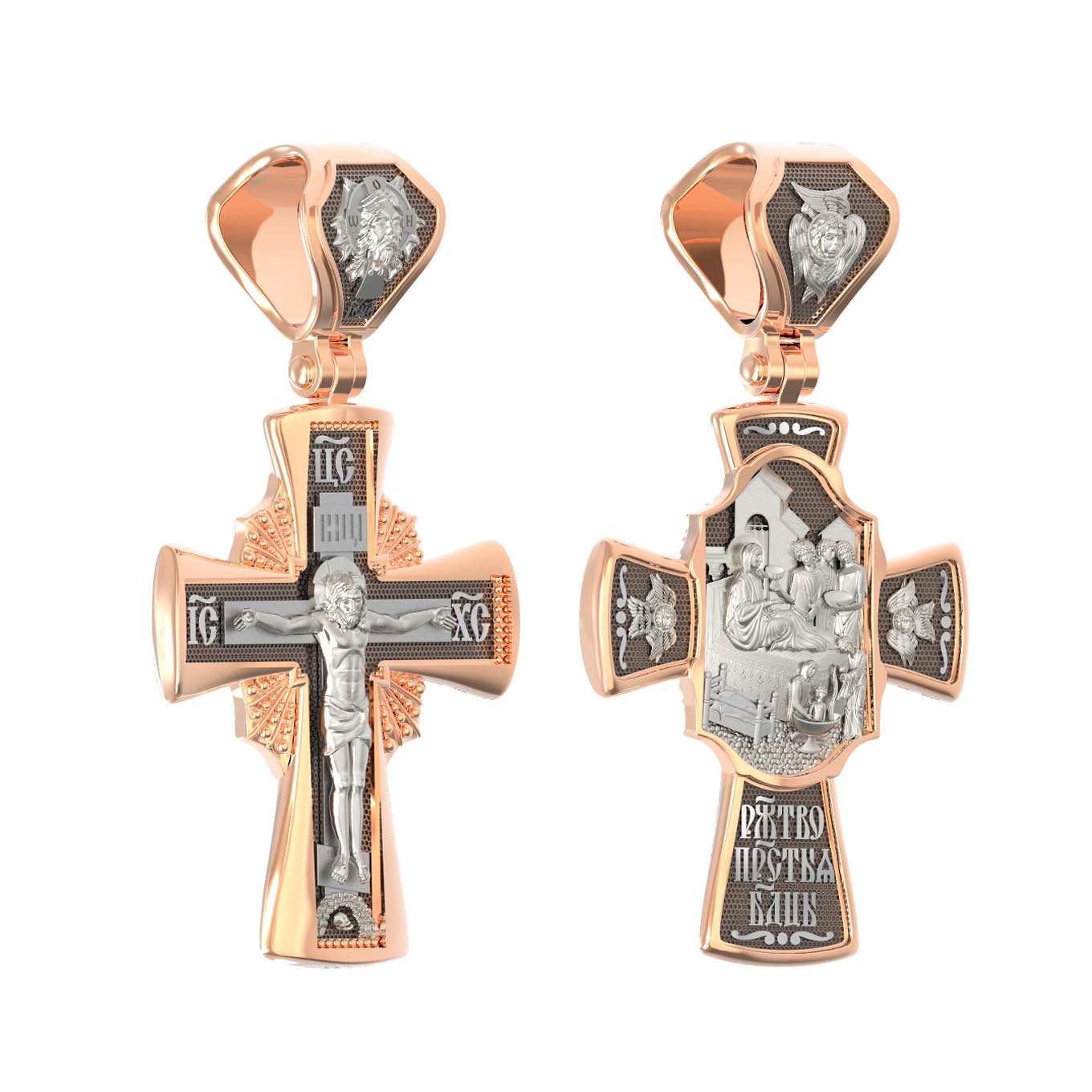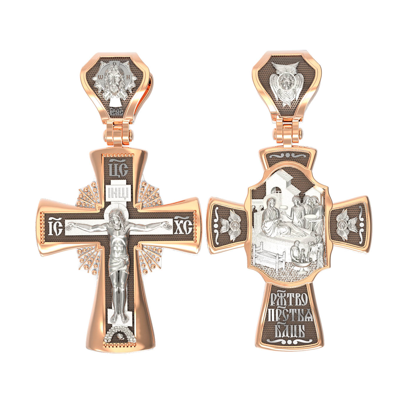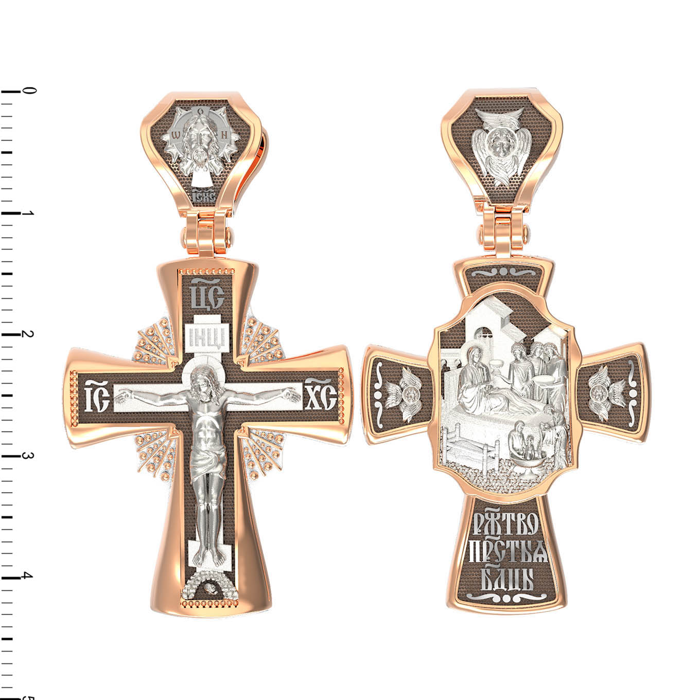 На оборотной стороне креста изображена икона Рождество Пресвятой Богородицы. Согласно церковному Преданию, Пресвятая Дева Мария родилась в небольшом галилейском городе Назарете. Родителями Её были праведные Иоаким и Анна. Супруги были бездетны, но не теряли надежды, что Господь может разрешить неплодство Анны даже в её преклонном возрасте. Они горячо молились и просили Господа даровать им дитя, которое обещали посвятить Богу для служения в храме. И Господь услышал их молитвы: Праведная Анна зачала и разрешилась дочерью Марией — будущей Пресвятой Богородицей. На кулонном кольце изображен шестикрылый Ангел — Серафим.